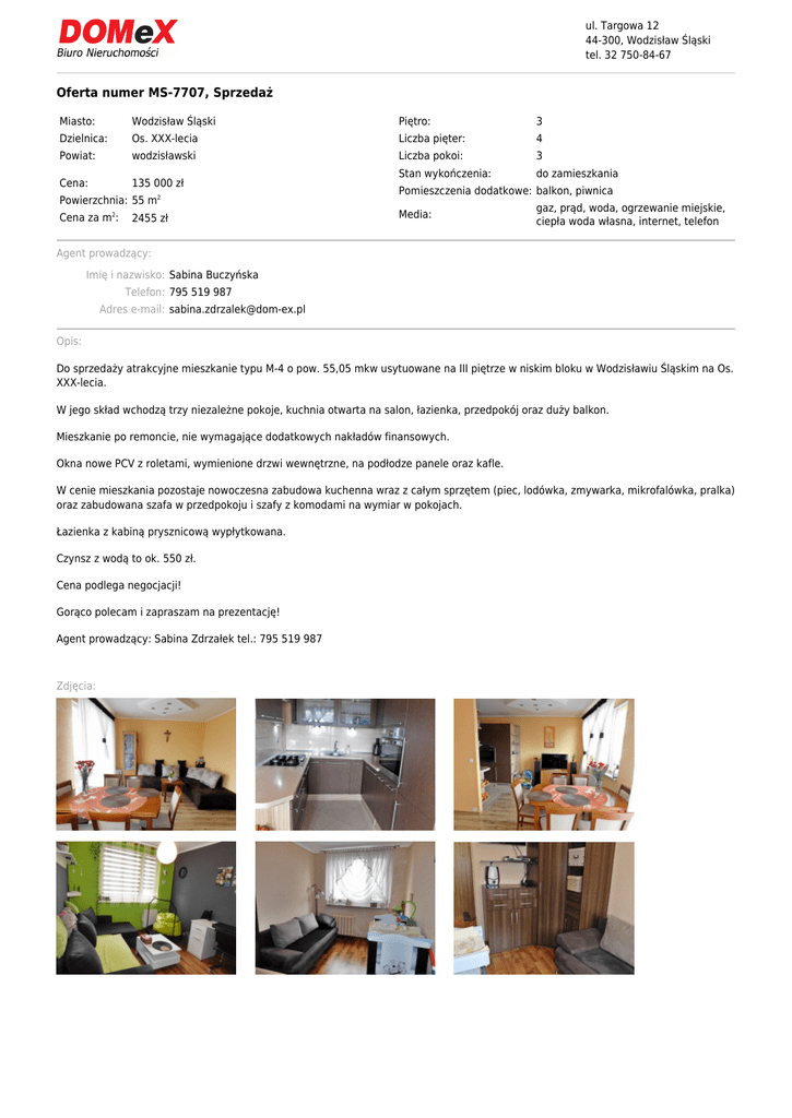 ul. Targowa 12 44-300, Wodzisław Śląski tel. 32 750-84-67 Oferta numer MS-7707, Sprzedaż Miasto: Wodzisław Śląski Piętro: 3 Dzielnica: Os. XXX-lecia Liczba pięter: 4 Powiat: wodzisławski Liczba pokoi: 3 Stan wykończenia: do zamieszkania Cena: 135 000 zł Powierzchnia: 55 m2 Cena za m2: 2455 zł Pomieszczenia dodatkowe: balkon, piwnica Media: gaz, prąd, woda, ogrzewanie miejskie, ciepła woda własna, internet, telefon Agent prowadzący: Imię i nazwisko: Sabina Buczyńska Telefon: 795 519 987 Adres e-mail: [email protected] Opis: Do sprzedaży atrakcyjne mieszkanie typu M-4 o pow. 55,05 mkw usytuowane na III piętrze w niskim bloku w Wodzisławiu Śląskim na Os. XXX-lecia. W jego skład wchodzą trzy niezależne pokoje, kuchnia otwarta na salon, łazienka, przedpokój oraz duży balkon. Mieszkanie po remoncie, nie wymagające dodatkowych nakładów finansowych. Okna nowe PCV z roletami, wymienione drzwi wewnętrzne, na podłodze panele oraz kafle. W cenie mieszkania pozostaje nowoczesna zabudowa kuchenna wraz z całym sprzętem (piec, lodówka, zmywarka, mikrofalówka, pralka) oraz zabudowana szafa w przedpokoju i szafy z komodami na wymiar w pokojach. Łazienka z kabiną prysznicową wypłytkowana. Czynsz z wodą to ok. 550 zł. Cena podlega negocjacji! Gorąco polecam i zapraszam na prezentację! Agent prowadzący: Sabina Zdrzałek tel.: 795 519 987 Zdjęcia: Zamieszczone na naszej stronie oferty nieruchomości mają charakter informacyjny i nie stanowią oferty w rozumieniu prawa handlowego.