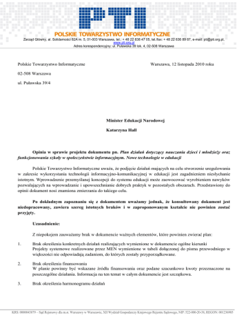 Zarząd Główny, al. Solidarności 82A m. 5, 01-003 Warszawa, tel.: + 48 22 838 47 05, tel./fax: + 48 22 636 89 87, e-mail: [email protected], www.pti.org.pl Adres korespondencyjny: ul. Puławska 39 lok. 4, 02-508 Warszawa Polskie Towarzystwo Informatyczne Warszawa, 12 listopada 2010 roku 02-508 Warszawa ul. Puławska 39/4 Minister Edukacji Narodowej Katarzyna Hall Opinia w sprawie projektu dokumentu pn. Plan działań dotyczący nauczania dzieci i młodzieży oraz funkcjonowania szkoły w społeczeństwie informacyjnym. Nowe technologie w edukacji Polskie Towarzystwo Informatyczne uważa, że podjęcie działań mających na celu stworzenie uregulowania w zakresie wykorzystania technologii informacyjno-komunikacyjnej w edukacji jest zagadnieniem niesłychanie istotnym. Wprowadzenie przemyślanej koncepcji do systemu edukacji może zaowocować wyrobieniem nawyków pozwalających na wprowadzanie i upowszechnianie dobrych praktyk w pozostałych obszarach. Przedstawiony do opinii dokument nosi znamiona zmierzania do takiego celu. Po dokładnym zapoznaniu się z dokumentem uważamy jednak, że konsultowany dokument jest niedopracowany, zawiera szereg istotnych braków i w zaproponowanym kształcie nie powinien zostać przyjęty. Uzasadnienie: Z niepokojem zauważamy brak w dokumencie ważnych elementów, które powinien zwierać plan: 1. Brak określenia konkretnych działań realizujących wymienione w dokumencie ogólne kierunki Projekty systemowe realizowane przez MEN wymienione w tabeli dołączonej do pisma przewodniego w większości nie odpowiadają zadaniom, do których zostały przyporządkowane. 2. Brak określenia finansowania W planie powinny być wskazane źródła finansowania oraz podane szacunkowo kwoty przeznaczone na poszczególne działania. Informacja na ten temat w całym dokumencie jest szczątkowa. 3. Brak określenia harmonogramu działań KRS: 0000043879 – Sąd Rejonowy dla m.st. Warszawy w Warszawie, XII Wydział Gospodarczy Krajowego Rejestru Sądowego, NIP: 522-000-20-38, REGON: 001236905 Zarząd Główny, al. Solidarności 82A m. 5, 01-003 Warszawa, tel.: + 48 22 838 47 05, tel./fax: + 48 22 636 89 87, e-mail: [email protected], www.pti.org.pl Adres korespondencyjny: ul. Puławska 39 lok. 4, 02-508 Warszawa Harmonogram taki powinien obejmować lata do 2013, w dokumencie jest mowa o perspektywie do roku 2020. Pierwszą czynnością ujętą w planie powinno być utworzenie Zespołu Koordynującego, który zapewni współpracę międzyresortową w realizacji zadań. Powyższe argumenty świadczą o tym, że przedstawiony do zaopiniowania dokument został źle nazwany, gdyż nie jest planem lecz dokumentem strategicznym, w oparciu o który dopiero będzie uzyskiwane finansowanie. Dopiero przy znanym lub zakładanym finansowaniu będzie można budować Plan. Polskie Towarzystwo Informatyczne wyraża gotowość udziału w pracach mających na celu stworzenie takiego planu. Z przedstawionych powyżej powodów koncentrujemy się w tej opinii na treściach strategicznych, pozostawiając opracowanie Planu dalszym etapom działania i powołanym w przyszłości gremiom. Strategia powinna przedstawiać wizję roli technologii informacyjno-komunikacyjnej w edukacji za kilka czy kilkanaście lat, próbując odnieść się do aktualnych problemów. Poniżej przedstawiamy nasze uwagi dotyczące poszczególnych zadań wytyczonych przez MEN do realizacji. Utworzenie Powszechnej Sieci Edukacyjnej Utworzenie Powszechnej Sieci Edukacyjnej nie powinno być rozumiane jako utworzenie dedykowanej czy wydzielonej sieci edukacyjnej. Takich systemów nie udało się zbudować pomimo różnych prób (np. administracja samorządowa, szpitale, itp.). Szkoły są mocno rozproszone i korzystają z różnych operatorów. Poza tym pojawia się kwestia korzystania z zasobów z domu, zarówno przez uczniów jak i nauczycieli. Wystarczy popatrzeć na relację zapotrzebowania do praktyki odnośnie dostępu do czasopism na uczelniach. PSE powinna natomiast zapewnić wszystkim szkołom i instytucjom edukacyjnym szerokopasmowy dostęp do Internetu, a przez to być elementem powszechnej sieci dającej dostęp do e-nauczania, e-usług, e-narzędzi itp. Sieć taka powinna być standaryzowana i jednolita. Na chwilę obecną mamy bowiem różnorodne niezależne serwisy wymagające autoryzacji dostępu do usług. Prowadzi to do sytuacji przeciążenia koniecznością opanowania i posługiwania się różnymi metodami autoryzacji (karty, piny, hasła, tokeny itp.). Zaczynamy mieć z tym coraz większy problem. Mając na uwadze edukacyjną funkcję wdrażanego systemu uważamy, że należy zmierzać w kierunku unifikacji i integracji z istniejącymi usługami z uwzględnieniem sprawdzonych rozwiązań. Ma to prowadzić do uproszczenia i tworzenia intuicyjnych narzędzi przyjaznych dla użytkownika, w tym ucznia i nauczyciela. Tworzenie elektronicznych środowisk kształcenia Strategia nie opisuje sposobu zapewnienia jakości i trwałości materiałów edukacyjnych udostępnianych na platformach, nie pokazuje też sposobu finansowania czy wspierania platform. Z jednej strony wymienia, kto może platformy tworzyć (w tym uczelnie) i wskazuje że podmioty te są odpowiedzialne za treść, jednak nie pokazuje czy będzie możliwe wsparcie tych działań. Bez dedykowanych środków uczelnie czy instytuty badawcze nie utworzą takich platform. KRS: 0000043879 – Sąd Rejonowy dla m.st. Warszawy w Warszawie, XII Wydział Gospodarczy Krajowego Rejestru Sądowego, NIP: 522-000-20-38, REGON: 001236905 Zarząd Główny, al. Solidarności 82A m. 5, 01-003 Warszawa, tel.: + 48 22 838 47 05, tel./fax: + 48 22 636 89 87, e-mail: [email protected], www.pti.org.pl Adres korespondencyjny: ul. Puławska 39 lok. 4, 02-508 Warszawa Sprawa tworzenia platform edukacyjnych jest niedopracowana, uważamy że powinny być tutaj znaczące zachęty organizacyjne dla uczelni (np. przez zapewnienie kluczowego udziału w ocenie merytoryczne