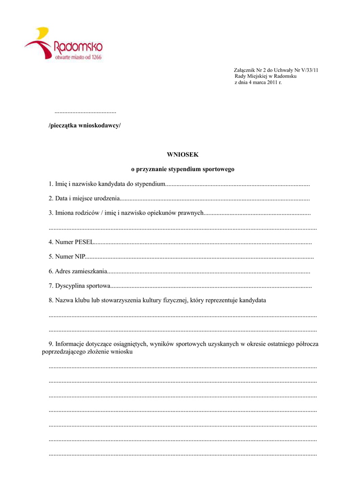 Załącznik Nr 2 do Uchwały Nr V/33/11 Rady Miejskiej w Radomsku z dnia 4 marca 2011 r. ...................................... /pieczątka wnioskodawcy/ WNIOSEK o przyznanie stypendium sportowego 1. Imię i nazwisko kandydata do stypendium......................................................................................... 2. Data i miejsce urodzenia..................................................................................................................... 3. Imiona rodziców / imię i nazwisko opiekunów prawnych.................................................................. ..................................................................................................................................................................... 4. Numer PESEL...................................................................................................................................... 5. Numer NIP............................................................................................................................................. 6. Adres zamieszkania............................................................................................................................. 7. Dyscyplina sportowa............................................................................................................................ 8. Nazwa klubu lub stowarzyszenia kultury fizycznej, który reprezentuje kandydata ..................................................................................................................................................................... ..................................................................................................................................................................... 9. Informacje dotyczące osiągniętych, wyników sportowych uzyskanych w okresie ostatniego półrocza poprzedzającego złoŜenie wniosku ..................................................................................................................................................................... ..................................................................................................................................................................... ..................................................................................................................................................................... ..................................................................................................................................................................... ..................................................................................................................................................................... ..................................................................................................................................................................... ..................................................................................................................................................................... 7. Uzasadnienie wniosku (w tym zamierzenia sportowe kandydata) ..................................................................................................................................................................... ..................................................................................................................................................................... ..................................................................................................................................................................... ..................................................................................................................................................................... ..................................................................................................................................................................... ..................................................................................................................................................................... ...................................... .................................................. /miejscowość i data/ /pieczątka i podpis wnioskodawcy/