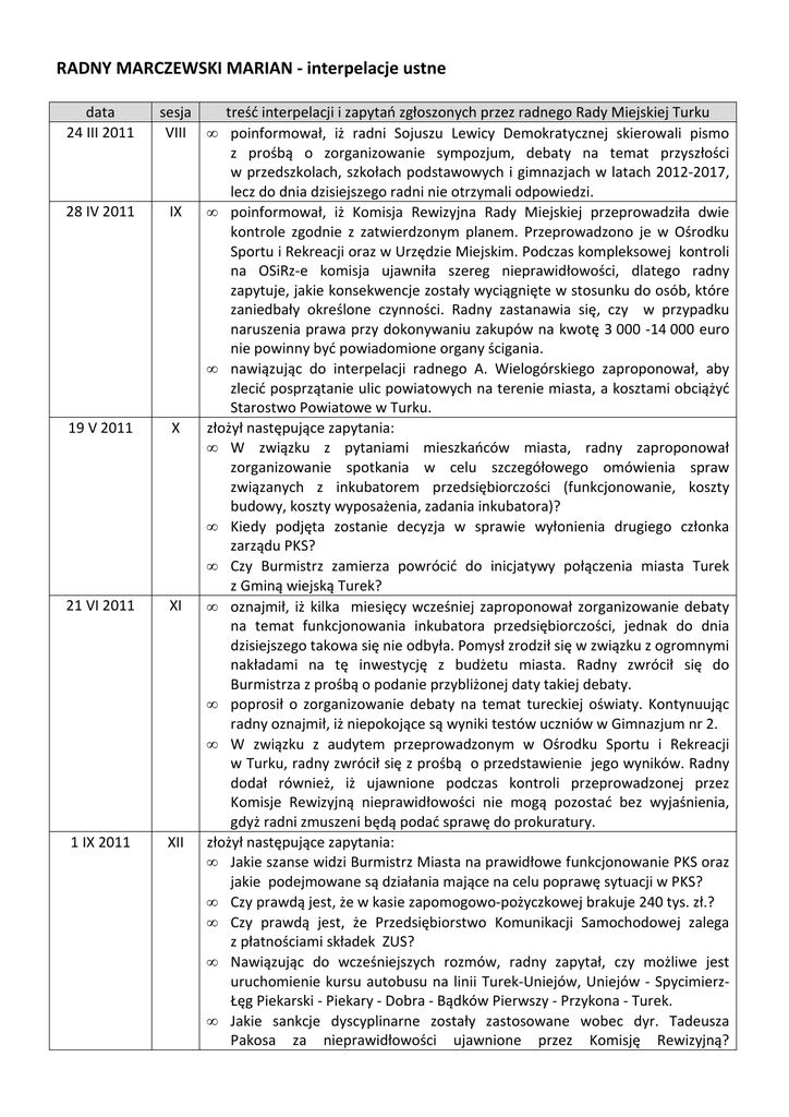RADNY MARCZEWSKI MARIAN - interpelacje ustne data 24 III 2011 28 IV 2011 19 V 2011 21 VI 2011 1 IX 2011 sesja treść interpelacji i zapytań zgłoszonych przez radnego Rady Miejskiej Turku VIII • poinformował, iż radni Sojuszu Lewicy Demokratycznej skierowali pismo z prośbą o zorganizowanie sympozjum, debaty na temat przyszłości w przedszkolach, szkołach podstawowych i gimnazjach w latach 2012-2017, lecz do dnia dzisiejszego radni nie otrzymali odpowiedzi. IX • poinformował, iż Komisja Rewizyjna Rady Miejskiej przeprowadziła dwie kontrole zgodnie z zatwierdzonym planem. Przeprowadzono je w Ośrodku Sportu i Rekreacji oraz w Urzędzie Miejskim. Podczas kompleksowej kontroli na OSiRz-e komisja ujawniła szereg nieprawidłowości, dlatego radny zapytuje, jakie konsekwencje zostały wyciągnięte w stosunku do osób, które zaniedbały określone czynności. Radny zastanawia się, czy w przypadku naruszenia prawa przy dokonywaniu zakupów na kwotę 3 000 -14 000 euro nie powinny być powiadomione organy ścigania. • nawiązując do interpelacji radnego A. Wielogórskiego zaproponował, aby zlecić posprzątanie ulic powiatowych na terenie miasta, a kosztami obciążyć Starostwo Powiatowe w Turku. X złożył następujące zapytania: • W związku z pytaniami mieszkańców miasta, radny zaproponował zorganizowanie spotkania w celu szczegółowego omówienia spraw związanych z inkubatorem przedsiębiorczości (funkcjonowanie, koszty budowy, koszty wyposażenia, zadania inkubatora)? • Kiedy podjęta zostanie decyzja w sprawie wyłonienia drugiego członka zarządu PKS? • Czy Burmistrz zamierza powrócić do inicjatywy połączenia miasta Turek z Gminą wiejską Turek? XI • oznajmił, iż kilka miesięcy wcześniej zaproponował zorganizowanie debaty na temat funkcjonowania inkubatora przedsiębiorczości, jednak do dnia dzisiejszego takowa się nie odbyła. Pomysł zrodził się w związku z ogromnymi nakładami na tę inwestycję z budżetu miasta. Radny zwrócił się do Burmistrza z prośbą o podanie przybliżonej daty takiej debaty. • poprosił o zorganizowanie debaty na temat tureckiej oświaty. Kontynuując radny oznajmił, iż niepokojące są wyniki testów uczniów w Gimnazjum nr 2. • W związku z audytem przeprowadzonym w Ośrodku Sportu i Rekreacji w Turku, radny zwrócił się z prośbą o przedstawienie jego wyników. Radny dodał również, iż ujawnione podczas kontroli przeprowadzonej przez Komisje Rewizyjną nieprawidłowości nie mogą pozostać bez wyjaśnienia, gdyż radni zmuszeni będą podać sprawę do prokuratury. XII złożył następujące zapytania: • Jakie szanse widzi Burmistrz Miasta na prawidłowe funkcjonowanie PKS oraz jakie podejmowane są działania mające na celu poprawę sytuacji w PKS? • Czy prawdą jest, że w kasie zapomogowo-pożyczkowej brakuje 240 tys. zł.? • Czy prawdą jest, że Przedsiębiorstwo Komunikacji Samochodowej zalega z płatnościami składek ZUS? • Nawiązując do wcześniejszych rozmów, radny zapytał, czy możliwe jest uruchomienie kursu autobusu na linii Turek-Uniejów, Uniejów - SpycimierzŁęg Piekarski - Piekary - Dobra - Bądków Pierwszy - Przykona - Turek. • Jakie sankcje dyscyplinarne zostały zastosowane wobec dyr. Tadeusza Pakosa za nieprawidłowości ujawnione przez Komisję Rewizyjną? 27 X 2011 XIII Jednocześnie radny zwrócił się z prośba do Burmistrza o udostępnienie radnym dokumentów z audytu przeprowadzonego na OSiRze. • Jakie niestandardowe działania podejmowane są w celu ściągnięcia inwestorów do Tureckiej Strefy Inwestycyjnej? zgłosił następujące zapytania: • W sprawie aktualnej sytuacji PKS Turek zapytał: - jak przedstawia się sprawa wypłat poboru dla pracowników? - czy poprawia się, czy pogarsza sytuacja finansowa PKS Turek? - czy zmniejszono w ostatnim okresie czasu zatrudnienie? - jak na dzień dzisiejszy wygląda sprawa nieprawidłowości zgłoszonych do prokuratury związanych z kasą zapomogowo-pożyczkową? - jak wygląda sprawa ewentualnych inwestorów w tej firmie, co z inwestorem z Grodziska Mazowieckiego? - czy został przeprowadzony audyt? • W związku z tym, że nie doczekał się od pana Burmistrza uzupełnienia odpowiedzi której udzielił mu na interpelację Burmistrz Czerwiński zapytał, co się dzieje w Tureckiej Strefie Inwestycyjnej: jak wygląda sprawa pozyskiwania inwestorów, czy są jakieś szanse wiedząc jakie są zagrożenia z Elektrownią i Kopalną. Właściwie ta Turecka Strefa Inwestycyjna staje się jeśli spełniłby się czarny scenariusz dot. Kopalni i Elektrowni - „takim być, albo nie być” dla Turku, czy są jacyś chętni, jakie działania są prowadzone itd.? • Zapytał, czy jest możliwe w najbliższym czasie wspólnie z GDDKiA doprowadzić do modernizacji ul. Niepodległości? Poinformował, że mieszka przy tej ulicy i dostaje mnóstwo telefonów i złośliwych uwag pod jego adresem, że ta ulica najgorzej w mieście wygląda. Na podstawie danych Biura Rady Miejskiej