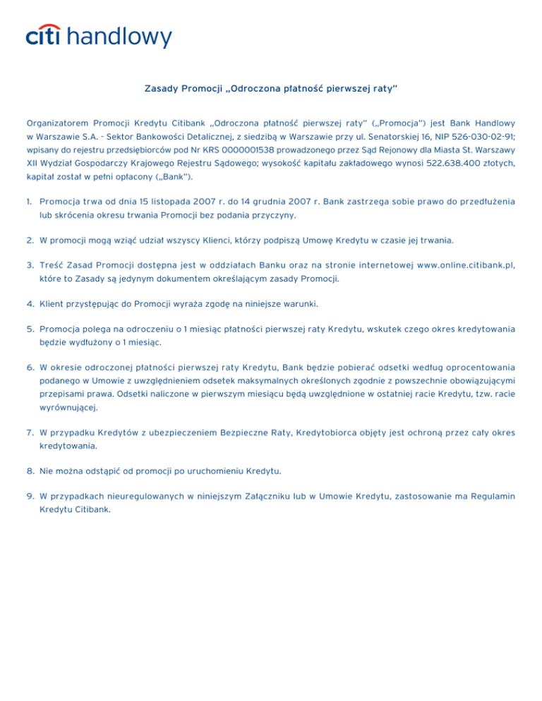 Zasady Promocji „Odroczona p∏atnoÊç pierwszej raty” Organizatorem Promocji Kredytu Citibank „Odroczona p∏atnoÊç pierwszej raty” („Promocja”) jest Bank Handlowy w Warszawie S.A. - Sektor BankowoÊci Detalicznej, z siedzibà w Warszawie przy ul. Senatorskiej 16, NIP 526-030-02-91; wpisany do rejestru przedsi´biorców pod Nr KRS 0000001538 prowadzonego przez Sàd Rejonowy dla Miasta St. Warszawy XII Wydzia∏ Gospodarczy Krajowego Rejestru Sàdowego; wysokoÊç kapita∏u zak∏adowego wynosi 522.638.400 z∏otych, kapita∏ zosta∏ w pe∏ni op∏acony („Bank”). 1. Promocja trwa od dnia 15 listopada 2007 r. do 14 grudnia 2007 r. Bank zastrzega sobie prawo do przed∏u˝enia lub skrócenia okresu trwania Promocji bez podania przyczyny. 2. W promocji mogà wziàç udzia∏ wszyscy Klienci, którzy podpiszà Umow´ Kredytu w czasie jej trwania. 3. TreÊç Zasad Promocji dost´pna jest w oddzia∏ach Banku oraz na stronie internetowej www.online.citibank.pl, które to Zasady sà jedynym dokumentem okreÊlajàcym zasady Promocji. 4. Klient przyst´pujàc do Promocji wyra˝a zgod´ na niniejsze warunki. 5. Promocja polega na odroczeniu o 1 miesiàc p∏atnoÊci pierwszej raty Kredytu, wskutek czego okres kredytowania b´dzie wyd∏u˝ony o 1 miesiàc. 6. W okresie odroczonej p∏atnoÊci pierwszej raty Kredytu, Bank b´dzie pobieraç odsetki wed∏ug oprocentowania podanego w Umowie z uwzgl´dnieniem odsetek maksymalnych okreÊlonych zgodnie z powszechnie obowiàzujàcymi przepisami prawa. Odsetki naliczone w pierwszym miesiàcu b´dà uwzgl´dnione w ostatniej racie Kredytu, tzw. racie wyrównujàcej. 7. W przypadku Kredytów z ubezpieczeniem Bezpieczne Raty, Kredytobiorca obj´ty jest ochronà przez ca∏y okres kredytowania. 8. Nie mo˝na odstàpiç od promocji po uruchomieniu Kredytu. 9. W przypadkach nieuregulowanych w niniejszym Za∏àczniku lub w Umowie Kredytu, zastosowanie ma Regulamin Kredytu Citibank.