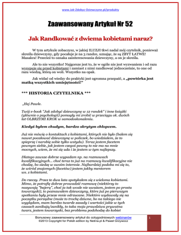 www.Jak-Zdobyc-Dziewczyne.pl/produkty Zaawansowany Artykuł Nr 52 Jak Randkować z dwiema kobietami naraz? W tym artykule zobaczysz, w jakiej ILUZJI tkwi nadal mój czytelnik, ponieważ skreśla dziewczyny, gdy pocałuje je na 3 randce, uznając, że są ZBYT ŁATWE! Masakra! Przecież to oznaka zainteresowania dziewczyny, a on je skreśla. Ale to nie wszystko! Najgorsze jest to, że w ogóle nie jest wyzwaniem i od razu wysypuje się przed kobietami i zamiast z nimi randkować jednocześnie, to one od razu wiedzą, którą on woli. Wszystko na opak. Jak widać od wiedzy do praktyki jest ogromna przepaść, a „powtórka jest matką wszystkich umiejętności!” *** HISTORIA CZYTELNIKA *** „Hej Pawle. Twój e-book "Jak zdobyć dziewczynę w 12 randek" i inne książki (głównie o psychologii) pomogły mi zrobić w przeciągu ok. dwóch lat OLBRZYMI KROK w samodoskonaleniu. Kiedyś byłem chudym, bardzo skrytym chłopcem. Już nie mówię o kontaktach z kobietami, których nie było (bałem się nawet pocałować dziewczynę w policzek, bo wiedziałem, że to spieprzę i narobię sobie tylko wstydu). Teraz jestem facetem pewnym siebie, jak jestem czegoś pewny to nie ma na mnie mocnych, wiem, że mi się uda i że jestem w tym najlepszy. Dlatego zawsze dobrze wypadam np. na rozmowach kwalifikacyjnych... choć teraz to już na rozmowy kwalifikacyjne nie chodzę, bo siedzę w swoim interesie. Najbardziej podoba mi się to, że wśród znajomych (facetów) jestem jakby mentorem ws. z kobietami. Do rzeczy. Przez te dwa lata spotykałem się z wieloma kobietami. Mimo, że potrafię dobrze prowadzić rozmowę (niektórzy to nazywają "bajerą", choć ja tak wcale nie uważam, jestem po prostu towarzyski), to poznawałem dziewczyny, które już po pierwszym spotkaniu były przeze mnie odrzucane. Niektóre wydawały się na początku porządne (może to trochę dziwne, bo na takiego nie wyglądam, mam bardzo twarde zasady i wartości jakie w tych czasach zanikają/zanikły, to taka moja prawdziwa prywatna twarz, jestem towarzyski, bez problemu podchodzę do kobiet Bonusowy zaawansowany artykuł do cotygodniowych webinarów ©2013 Copyright for Polish edition by Netina.pl & Paweł Grzywocz 1 www.Jak-Zdobyc-Dziewczyne.pl/produkty i prowadzę z nimi rozmowę, ale zasady mam). Wracając, niektóre wydawały się porządne, ale po 2/3 randkach było całowanie, a nawet chciały coś więcej. Tutaj walczyłem sam trochę ze sobą, bo wiadomo jestem facetem, ale moje alterego ciągle mówi, że nie chce jej zranić bo i tak nic z tego nie będzie, za łatwo ją zdobyłem (nawet jak się o to starałem). Minęło trochę czasu i na jednej imprezie widziałem dwie dziewczyny, które na mnie zerkały, podszedłem, przywitałem się (jak się później dowiedziałem, to powiedziały, że sprawiałem wrażenie takiego "kasanovy" a jak podszedłem to fajny facet, który opowiada śmieszne historie ze swojego życia, gestykuluje etc. Wiesz Paweł o co chodzi, sam tego uczysz :)). Były dwie - Julia i Sabina. Dwie Ukrainki. Ja bardziej poznałem Julie (koledzy chcieli podbijać do Sabiny, ale ona miała chłopaka na Ukrainie i powiedziała, że nawet tańczyć nie będzie, że w ogóle nie ma takiej opcji). Impreza minęła, tel. od Julii wziąłem i za kilka dni się spotkaliśmy. Na spotkaniu były w porządku, choć trochę siedziałem jak na tureckim kazaniu. Jej się ogromnie spodobało. Mi nie bardzo, nie zaiskrzyło, choć uważam ją za złotą kobietę. Po spotkaniu od razu napisała mi smsa, czy może mnie widzieć w weekend, bo później wyjeżdża na Ukrainie na 3tyg. Ja napisałem, że mam już plany na weekend. Pojechała. Za ok. 2 tyg. byłem w klubie i spotkaliśmy się z Sabiną. Zrobiła na mnie OGROMNE wrażenie swoim zachowaniem (porządna, z zasadami etc.). Bawiliśmy się razem (była już wolna, choć razem nie tańczyliśmy, nie chciałem przyśpieszać). Za 2 dni spotkaliśmy się w centrum handlowym, żeby pomogła mi wybrać buty i poszliśmy na spacer (łącznie wszystko 3,5h - wiem za długo...). Niby nie jestem stało związkowiec, choć wtedy zdałem sobie sprawę, że tak na prawdę nikogo takiego nie spotkałem, jest niesamowita (nie mówię tu o wyglądzie). Powiedziałem sobie, że jakbym miał z kimś wchodzić w związek to tylko z taką osobą (albo jestem z kimś porządnym albo jestem singlem, dla mnie nie ma nic pośrodku). Zadzwoniłem za 3dni żeby umówić spotkanie a ona mi przez telefon "A Julia...?" trochę byłem w szoku, ale powiedziałem, że pogadamy o tym na spotkaniu. Na spotkaniu powiedziała, że uwielbia ze mną spędzać czas, że przy nikim się tak nie śmieje, a moje opowieści zna na pamięć. Dobrze się z nią czuje, nie "bajeruje" jej, ona też trzyma dystans, jest niesamowicie ułożona, porządna i inteligentna. Bonusowy zaawansowany artykuł do cotygodniowych webinarów ©2013 Copyright for Polish edition by Netina.pl & Paweł Grzywocz 2 www.Jak-Zdobyc-Dziewczyne.pl/produkty Powiedziała mi, że dla niej jest to nie ciekawa sytuacja, bo Julia to jej prawdziwa, jedyna przyjaciółka i ona tak nie może dalej postępować bo to godzi w jej podstawowe zasady. Powiedziała, że to nie jest dla niej normalne (cholera, pomyślałem, kto w podobnej sytuacji tak by się zachował z dziewczyn, które poznawałem wcześniej? ŻADNA. Jeszcze bardziej nabrałem do niej sympatii). Strasznie by się czuła, szczególnie, że wie jak Julii na mnie zależy. Zaznaczę tylko, że nie jestem na nią "napalony" albo "ślepy". Swoje emocje trzymam na wodzy, nie robię nic pochopnie ani pod wpływem emocji. Przyznam, że nie wiem, co mam zrobić w tej sytuacji. Jak odkręcić sytuację? Julia wróciła i się wszystkiego dowiedziała i było jej smutno. Sabina mówi, że nie możemy się tak spotykać (ze względu a Julie). Powiedziałem jej, że się jeszcze spotkamy i o tym pogadamy porządnie (zgodzi się). Paweł ratuj. Jak powinienem to rozegrać? Dla mnie t