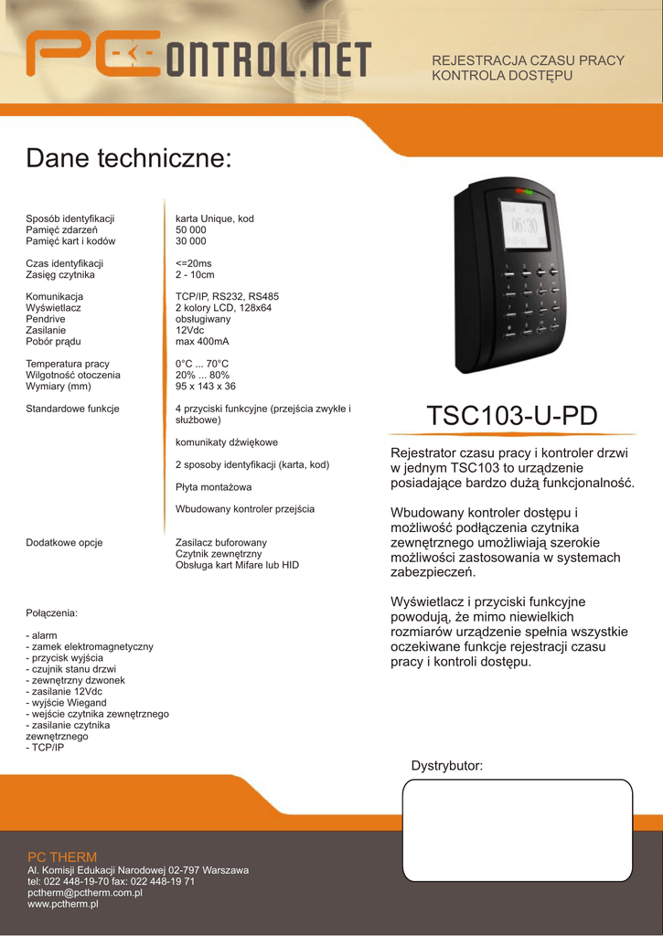 REJESTRACJA CZASU PRACY KONTROLA DOSTĘPU Dane techniczne: Sposób identyfikacji Pamięć zdarzeń Pamięć kart i kodów karta Unique, kod 50 000 30 000 Czas identyfikacji Zasięg czytnika <=20ms 2 - 10cm Komunikacja Wyświetlacz Pendrive Zasilanie Pobór prądu TCP/IP, RS232, RS485 2 kolory LCD, 128x64 obsługiwany 12Vdc max 400mA Temperatura pracy Wilgotność otoczenia Wymiary (mm) 0°C ... 70°C 20% ... 80% 95 x 143 x 36 Standardowe funkcje 4 przyciski funkcyjne (przejścia zwykłe i służbowe) TSC103-U-PD komunikaty dźwiękowe 2 sposoby identyfikacji (karta, kod) Płyta montażowa Wbudowany kontroler przejścia Dodatkowe opcje Zasilacz buforowany Czytnik zewnętrzny Obsługa kart Mifare lub HID Połączenia: - alarm - zamek elektromagnetyczny - przycisk wyjścia - czujnik stanu drzwi - zewnętrzny dzwonek - zasilanie 12Vdc - wyjście Wiegand - wejście czytnika zewnętrznego - zasilanie czytnika zewnętrznego - TCP/IP Rejestrator czasu pracy i kontroler drzwi w jednym TSC103 to urządzenie posiadające bardzo dużą funkcjonalność. Wbudowany kontroler dostępu i możliwość podłączenia czytnika zewnętrznego umożliwiają szerokie możliwości zastosowania w systemach zabezpieczeń. Wyświetlacz i przyciski funkcyjne powodują, że mimo niewielkich rozmiarów urządzenie spełnia wszystkie oczekiwane funkcje rejestracji czasu pracy i kontroli dostępu. Dystrybutor: PC THERM Al. Komisji Edukacji Narodowej 02-797 Warszawa tel: 022 448-19-70 fax: 022 448-19 71 [email protected] www.pctherm.pl REJESTRACJA CZASU PRACY KONTROLA DOSTĘPU Przykłady zastosowań w systemach Rejestracji Czasu Pracy Wariant 1: Prosta rejestracja czasu pracy Wariant 2: Rejestracja czasu pracy Pracownicy rejestrują na 1 urządzeniu wejścia, wyjścia i przejścia służbowe i prywatne. Pracownicy rejestrują na urządzeniu różne rodzaje wyjść (zwykłe, służbowe, prywatne), a wejścia na dodatkowym czytniku. Dzięki temu ogranicza się ilość błędów popełnianych przez pracowników. Czytnik zewnętrzny jest hermetyczny i można go zainstalować na zewnątrz, np. przed wejściem do firmy. Wariant 3: Zaawansowana rejestracja czasu pracy Pracownicy rejestrują zwykłe i specjalne zdarzenia wejścia i wyjścia na 2 rejestratorach. Dzięki temu zwiększa się ilość pamięci w systemie (razem 100 000 zdarzeń) i ogranicza się ilośc błędów popełnianych przez pracowników. Ponadto na obu rejestratorach wyświetlana jest godzina i kierunek przejścia. Rozwiązanie to zalecane jest przy dużym ruchu osobowym lub do instalacji na bramce obrotowej (tripodzie). Dystrybutor: PC THERM Al. Komisji Edukacji Narodowej 02-797 Warszawa tel: 022 448-19-70 fax: 022 448-19 71 [email protected] www.pctherm.pl REJESTRACJA CZASU PRACY KONTROLA DOSTĘPU Przykłady zastosowań w systemach Kontroli Dostępu Wariant 1: Dwustronna kontrola dostępu z czytnikiem zewnętrznym. Hermetyczny czytnik zewnętrzny (zwykły zasięg, duży zasięg) instalowany jest w strefie niechronionej (na zewnątrz pomieszczenia), a kontroler w strefie chronionej. Do kontrolera można podłączyć niezbędne elementy kontroli dostępu, takie jak: zamek elektromagnetyczny, kontaktron, przycisk wyjścia, sygnalizator alarmowy, przycisk ewakuacyjny), zasilacz. . Dzięki zaawansowanej kontrukcji system jest bardzo prosty w instalacji, co j e s t c e c h ą c e n i o n ą w ś r ó d k l i e n t ó w i i n s t a l a t o r ó w. Wiele sposobów komunikacji i niewielkie gabaryty umożliwiają wszechstronne zastosowania, od niewielkich obiektów po systemy złożone z wielu przejść. . Uniwersalny interfejs Wiegand umożliwia zastosowanie dowolnego czytnika zewnętrznego wspierającego tę technologię. W systemach kontroli dostępu istotnym atutem TSC103 jest również duża pamięć 50 000 zdarzeń na przejście, co umożliwia montaż nawet w bardzo ruchliwych obiektach. Powyższe atuty oraz obsługa zdarzeń rejestracji czasu pracy powodują, że TSC103 to jeden z najchętniej kupowanych kontrolerów w ofercie PC Therm. Wariant 2: Dwustronna kontrola dostępu z wykorzystaniem 2 kontrolerów. Rozwiązanie zaawansowane umożliwiające dodatkowo podłączenie 2 zewnętrznych czytników. Integracje Integratorzy mogą otrzymać SDK do urządzenia, które umożliwia zintegrowanie go bezpośrednio we własnym oprogramowaniu. Dystrybutor: PC THERM Al. Komisji Edukacji Narodowej 02-797 Warszawa tel: 022 448-19-70 fax: 022 448-19 71 [email protected] www.pctherm.pl