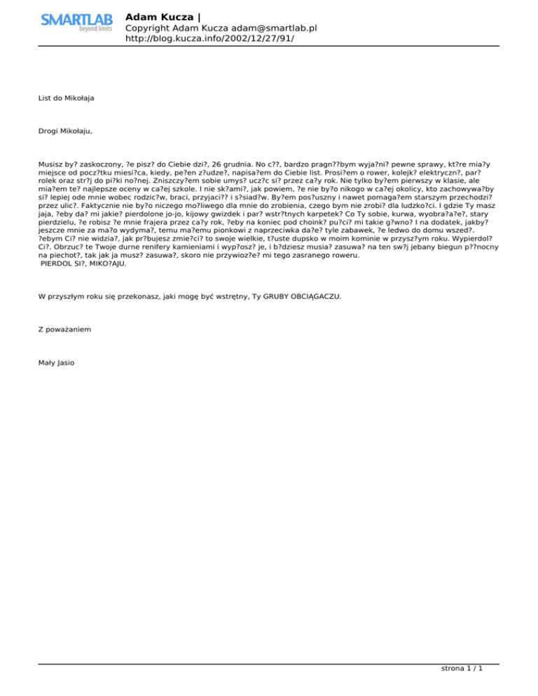 Adam Kucza | Copyright Adam Kucza [email protected] http://blog.kucza.info/2002/12/27/91/ List do Mikołaja Drogi Mikołaju, Musisz by? zaskoczony, ?e pisz? do Ciebie dzi?, 26 grudnia. No c??, bardzo pragn??bym wyja?ni? pewne sprawy, kt?re mia?y miejsce od pocz?tku miesi?ca, kiedy, pe?en z?udze?, napisa?em do Ciebie list. Prosi?em o rower, kolejk? elektryczn?, par? rolek oraz str?j do pi?ki no?nej. Zniszczy?em sobie umys? ucz?c si? przez ca?y rok. Nie tylko by?em pierwszy w klasie, ale mia?em te? najlepsze oceny w ca?ej szkole. I nie sk?ami?, jak powiem, ?e nie by?o nikogo w ca?ej okolicy, kto zachowywa?by si? lepiej ode mnie wobec rodzic?w, braci, przyjaci?? i s?siad?w. By?em pos?uszny i nawet pomaga?em starszym przechodzi? przez ulic?. Faktycznie nie by?o niczego mo?liwego dla mnie do zrobienia, czego bym nie zrobi? dla ludzko?ci. I gdzie Ty masz jaja, ?eby da? mi jakie? pierdolone jo-jo, kijowy gwizdek i par? wstr?tnych karpetek? Co Ty sobie, kurwa, wyobra?a?e?, stary pierdzielu, ?e robisz ?e mnie frajera przez ca?y rok, ?eby na koniec pod choink? pu?ci? mi takie g?wno? I na dodatek, jakby? jeszcze mnie za ma?o wydyma?, temu ma?emu pionkowi z naprzeciwka da?e? tyle zabawek, ?e ledwo do domu wszed?. ?ebym Ci? nie widzia?, jak pr?bujesz zmie?ci? to swoje wielkie, t?uste dupsko w moim kominie w przysz?ym roku. Wypierdol? Ci?. Obrzuc? te Twoje durne renifery kamieniami i wyp?osz? je, i b?dziesz musia? zasuwa? na ten sw?j jebany biegun p??nocny na piechot?, tak jak ja musz? zasuwa?, skoro nie przywioz?e? mi tego zasranego roweru. PIERDOL SI?, MIKO?AJU. W przyszłym roku się przekonasz, jaki mogę być wstrętny, Ty GRUBY OBCIĄGACZU. Z poważaniem Mały Jasio strona 1 / 1