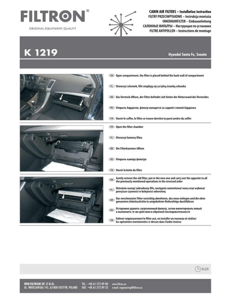 CABIN AIR FILTERS – Installation instruction FILTRY PRZECIWPYŁKOWE – Instrukcja montażu INNERAUMFILTER – Einbauanleitung САЛОННЫЕ ФИЛЬТРЫ – Инструкция по установке FILTRE ANTIPOLLEN – Instructions de montage K 1219 Hyundai Santa Fe, Sonata Open compartment, the filter is placed behind the back wall of compartment Otworzyć schowek, filtr znajdują się za tylną ścianką schowka Das Versteck öffnen, der Filter befindet sich hinter der Hinterwand des Versteckes Открыть бардачок, фильтр находится за задней стенкой бардачка Ouvrir le coffre, le filtre se trouve derrière la paroi arrière du coffre Open the filter chamber Otworzyć komorę filtra Die Filterkammer öffnen Открыть камеру фильтра Ouvrir la boite du filtre Gently remove the old filter, put in the new one and carry out the opposite to all the previously mentioned operations in the reversed order Ostrożnie usunąć zabrudzony filtr, następnie zamontować nowy oraz wykonać powyższe czynności w kolejności odwrotnej Das verschmutzte Filter vorsichtig abnehmen, das neue einlegen und die oben genannten Arbeitsschritte in umgekehrter Reihenfolge durchführen Осторожно удалить загрязненный фильтр, затем вмонтировать новый и выполнить те же действия в обратной последовательности Enlever soigneusement le filtre usé, en installer un nouveau et réaliser les opérations mentionnées ci-dessus dans l’ordre inverse 0:25 WIX-FILTRON SP. Z O.O. TEL.:+48 65 572 89 00 www.filtron.eu UL. WROCŁAWSKA 145, 63-800 GOSTYŃ, POLAND FAX: +48 65 572 89 22 e-mail: [email protected]