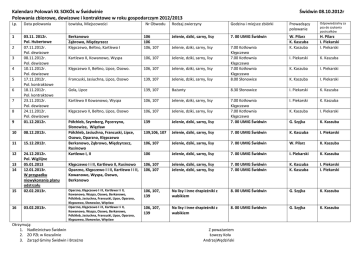 Kalendarz Polowań KŁ SOKÓŁ w Świdwinie Polowania zbiorowe, dewizowe i kontraktowe w roku gospodarczym 2012/2013 Rodzaj zwierzyny Godzina i miejsce zbiórki Prowadzący polowanie Odpowiedzialny za psa do szukania postrzałków 106 106 106, 107 Jelenie, dziki, sarny, lisy 7. 00 UMIG Świdwin Jelenie, dziki, sarny, lisy H. Pilarz I. Piekarski I. Piekarski Kartlewo II, Kowanowo, Wyspa 106, 107 Jelenie, dziki, sarny, lisy I. Piekarski K. Kaszuba Klępczewo II, Bełtno, Lipce, Osowo. 106, 107 Jelenie, dziki, sarny, lisy K. Kaszuba I. Piekarski Francuski, Jasiuchna, Lipce, Osowo 139, 107 Jelenie, dziki, sarny, lisy 7.00 Kotłownia Klępczewo 7.00 Kotłownia Klępczewo 7.00 Kotłownia Klępczewo 8.00 Słonowice W. Pilarz K. Kaszuba K. Kaszuba K. Kaszuba I. Piekarski Gola, Lipce 139, 107 Bażanty 8.30 Słonowice I. Piekarski K. Kaszuba Kartlewo II Kowanowo, Wyspa 106, 107 Jelenie, dziki, sarny, lisy I. Piekarski K. Kaszuba Klępczewo II, Bełtno, Lipce, Osowo 106, 107 Jelenie, dziki, sarny, lisy K. Kaszuba I. Piekarski Półchleb, Szymberg, Pęcerzyno, Słonowice, Więcław Półchleb, Jasiuchna, Francuski, Lipce, Osowo, Oparzno, Klępczewo Berkanowo, Ząbrowo, Międzyrzecz, Rusinowo Kartlewo I, II 139 Jelenie, dziki, sarny, lisy 7.00 Kotłownia Klępczewo 7.00 Kotłownia Klępczewo 7. 00 UMIG Świdwin G. Szyjka K. Kaszuba 139,106, 107 Jelenie, dziki, sarny, lisy 7. 00 UMIG Świdwin K. Kaszuba I. Piekarski 106, 107 Jelenie, dziki, sarny, lisy 7. 00 UMIG Świdwin W. Pilarz K. Kaszuba 106 Jelenie, dziki, sarny, lisy 7. 00 UMIG Świdwin I. Piekarski K. Kaszuba Klępczewo I i II, Kartlewo II, Rusinowo Oparzno, Klępczewo I i II, Kartlewo I i II, Kowanowo, Wyspa, Osowo, Berkanowo 106, 107 106, 107 Jelenie, dziki, sarny, lisy Jelenie, dziki, sarny, lisy 7. 00 UMIG Świdwin 7. 00 UMIG Świdwin K. Kaszuba K. Kaszuba I. Piekarski I. Piekarski Oparzno, Klępczewo I i II, Kartlewo I i II, Kowanowo, Wyspa, Osowo, Berkanowo, Półchleb, Jasiuchna, Francuski, Lipce, Oparzno, Klępczewo, Słonowice, Więcław Oparzno, Klępczewo I i II, Kartlewo I i II, Kowanowo, Wyspa, Osowo, Berkanowo, Półchleb, Jasiuchna, Francuski, Lipce, Oparzno, Klępczewo, Słonowice, Więcław 106, 107, 139 Na lisy i inne drapieżniki z wabikiem 8. 00 UMIG Świdwin G. Szyjka K. Kaszuba 106, 107, 139 Na lisy i inne drapieżniki z wabikiem 8. 00 UMIG Świdwin G. Szyjka K. Kaszuba Lp. Data polowania Łowiska, Miejscowości 1 Berkanowo Ząbrowo, Międzyrzecz Klępczewo, Bełtno, Kartlewo I 9 03.11. 2012r. Pol. Hubertowe 07.11.2012r. Pol. dewizowe 08.11.2012r. Pol. dewizowe 10.11.2012r. Pol. dewizowe 17.11.2012r. Pol. kontraktowe 18.11.2012r. Pol. kontraktowe 23.11.2012r. Pol. dewizowe 24.11.2012r. Pol. dewizowe 01.12.2012r. 10 08.12.2012r. 11 15.12.2012r. 12 15 24.12.2012r. Pol. Wigilijne 05.01.2013 12.01.2013r. W przypadku niewykonania planu odstrzału 02.02.2013r. 16 03.02.2013r. 2 3 4 5 6 7 8 13 14 Świdwin 08.10.2012r Otrzymują: 1. Nadleśnictwo Świdwin 2. ZO PZŁ w Koszalinie 3. Zarząd Gminy Świdwin i Brzeżno Nr Obwodu Z poważaniem Łowczy Koła AndrzejWędziński