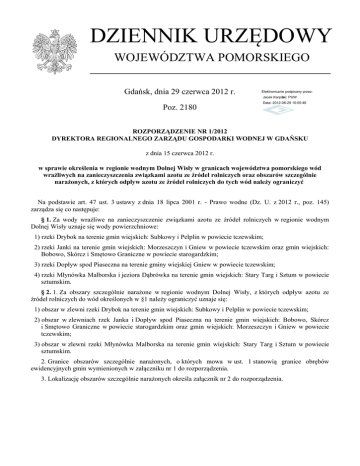 DZIENNIK URZĘDOWY WOJEWÓDZTWA POMORSKIEGO Gdańsk, dnia 29 czerwca 2012 r. Elektronicznie podpisany przez: Jacek Karpiński; PUW Poz. 2180 Data: 2012-06-29 10:05:48 ROZPORZĄDZENIE NR 1/2012 DYREKTORA REGIONALNEGO ZARZĄDU GOSPODARKI WODNEJ W GDAŃSKU z dnia 15 czerwca 2012 r. w sprawie określenia w regionie wodnym Dolnej Wisły w granicach województwa pomorskiego wód wrażliwych na zanieczyszczenia związkami azotu ze źródeł rolniczych oraz obszarów szczególnie narażonych, z których odpływ azotu ze źródeł rolniczych do tych wód należy ograniczyć Na podstawie art. 47 ust. 3 ustawy z dnia 18 lipca 2001 r. - Prawo wodne (Dz. U. z 2012 r., poz. 145) zarządza się co następuje: § 1. Za wody wrażliwe na zanieczyszczenie związkami azotu ze źródeł rolniczych w regionie wodnym Dolnej Wisły uznaje się wody powierzchniowe: 1) rzeki Drybok na terenie gmin wiejskich: Subkowy i Pelplin w powiecie tczewskim; 2) rzeki Janki na terenie gmin wiejskich: Morzeszczyn i Gniew w powiecie tczewskim oraz gmin wiejskich: Bobowo, Skórcz i Smętowo Graniczne w powiecie starogardzkim; 3) rzeki Dopływ spod Piaseczna na terenie gminy wiejskiej Gniew w powiecie tczewskim; 4) rzeki Młynówka Malborska i jeziora Dąbrówka na terenie gmin wiejskich: Stary Targ i Sztum w powiecie sztumskim. § 2. 1. Za obszary szczególnie narażone w regionie wodnym Dolnej Wisły, z których odpływ azotu ze źródeł rolniczych do wód określonych w §1 należy ograniczyć uznaje się: 1) obszar w zlewni rzeki Drybok na terenie gmin wiejskich: Subkowy i Pelplin w powiecie tczewskim; 2) obszar w zlewniach rzek Janka i Dopływ spod Piaseczna na terenie gmin wiejskich: Bobowo, Skórcz i Smętowo Graniczne w powiecie starogardzkim oraz gmin wiejskich: Morzeszczyn i Gniew w powiecie tczewskim; 3) obszar w zlewni rzeki Młynówka Malborska na terenie gmin wiejskich: Stary Targ i Sztum w powiecie sztumskim. 2. Granice obszarów szczególnie narażonych, o których mowa w ust. 1 stanowią granice obrębów ewidencyjnych gmin wymienionych w załączniku nr 1 do rozporządzenia. 3. Lokalizację obszarów szczególnie narażonych określa załącznik nr 2 do rozporządzenia. Dziennik Urzędowy Województwa Pomorskiego –2– Poz. 2180 § 3. Rozporządzenie wchodzi w życie po upływie 14 dni od dnia ogłoszenia w Dzienniku Urzędowym Województwa Pomorskiego. zastępca Dyrektora Regionalnego Zarzadu Gospodarki Wodnej w Gdańsku Henryk Jatczak Dziennik Urzędowy Województwa Pomorskiego –3– Poz. 2180 Dziennik Urzędowy Województwa Pomorskiego –4– Poz. 2180