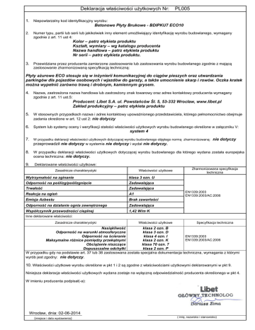 Deklaracja właściwości użytkowych Nr: PL005 1. Niepowtarzalny kod identyfikacyjny wyrobu: Betonowe Płyty Brukowe - BDIPKU7 ECO10 Numer typu, partii lub serii lub jakikolwiek inny element umożliwiający identyfikację wyrobu budowlanego, wymagany zgodnie z art. 11 ust 4: 2. Kolor – patrz etykieta produktu Kształt, wymiary – wg katalogu producenta Nazwa handlowa – patrz etykieta produktu Nr serii – patrz etykieta produktu. 3. Przewidziane przez producenta zamierzone zastosowanie lub zastosowania wyrobu budowlanego zgodnie z mającą zastosowanie zharmonizowaną specyfikacją techniczną: Płyty ażurowe ECO stosuje się w inżynierii komunikacyjnej do ciągów pieszych oraz utwardzania parkingów dla pojazdów osobowych i wjazdów do garaży, a także umocnienie skarp i rowów. Oczka kratek można wypełnić zarówno trawą i drobnym, kamiennym grysem. 4. Nazwa, zastrzeżona nazwa handlowa lub zastrzeżony znak towarowy oraz adres kontaktowy producenta wymagany zgodnie z art. 11 ust.5: Producent: Libet S.A. ul. Powstańców Śl. 5, 53-332 Wrocław, www.libet.pl Zakład produkcyjny – patrz etykieta produktu 5. W stosownych przypadkach nazwa i adres kontaktowy upoważnionego przedstawiciela, którego pełnomocnictwo obejmuje zadania określone w art. 12 ust 2: nie dotyczy 6. System lub systemy oceny i weryfikacji stałości właściwości użytkowych wyrobu budowlanego określone w załączniku V: system 4 7. W przypadku deklaracji właściwości użytkowych dotyczącej wyrobu budowlanego objętego normą zharmonizowaną: nie dotyczy przeprowadził nie dotyczy w systemie nie dotyczy i wydał nie dotyczy. 8. W przypadku deklaracji właściwości użytkowych dotyczącej wyrobu budowlanego dla którego wydana została europejska ocena techniczna: nie dotyczy. 9. Deklarowane właściwości użytkowe: Właściwości użytkowe Zasadnicze charakterystyki Wytrzymałość na zginanie klasa 3 ozn. U Odporność na poślizg/poślizgnięcie Zadawalająca Trwałość Zadawalająca Reakcja na ogień A1 Emisja Azbestu Brak zawartości Odporność na działanie ognia zewnętrznego Zadowalająca Współczynnik przewodności cieplnej 1,42 W/m·K Zharmonizowana specyfikacja techniczna EN1339:2003 EN1339:2003/AC:2006 Inne deklarowane właściwości: Zasadnicze charakterystyki Właściwości użytkowe Specyfikacja techniczna Nasiąkliwość klasa 2 ozn. B Odporność na warunki atmosferyczne klasa 3 ozn. D Odporność na ścieranie klasa 4 ozn. I EN1339:2003 EN1339:2003/AC:2006 Maksymalne różnice pomiędzy przekątnymi klasa 2 ozn. K Obciążenie niszczące klasa 70 ozn. 7 Dopuszczalne odchyłki klasa 2 ozn. P W przypadku gdy na podstawie art. 37 lub 38 zastosowana została specjalna dokumentacja techniczna, wymagania z którymi wyrób jest zgodny: nie dotyczy. 10. Właściwości użytkowe wyrobu określone w pkt 1 i 2 są zgodne z właściwościami użytkowymi deklarowanymi w pkt 9. Niniejsza deklaracja właściwości użytkowych wydana zostaje na wyłączną odpowiedzialność producenta określonego w pkt 4. W imieniu producenta podpisał(-a): Wrocław, dnia: 02-06-2014 (miejsce i data wystawienia) ( imię, nazwisko i stanowisko) Kopia informacji towarzyszącej oznakowaniu CE (przykładowa etykieta) Producent Kod identyfikacyjny wyrobu Nazwa handlowa, kolor Indeks wyrobu Nr serii Zakład produkcyjny ` Deklaracja właściwości użytkowych nr. PL005 dotyczy następujących wyrobów: Ażur 40x60x10 We wszystkich wariantach kolorystycznych i ew. obróbki dodatkowej, w wersjach z fazą, mikrofazą i bez fazy (wg katalogu producenta).