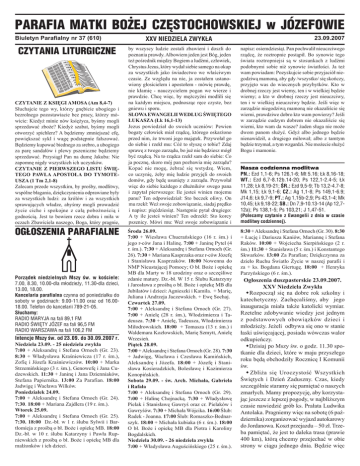 PARAFIA MATKI BOŻEJ CZÊSTOCHOWSKIEJ w JÓZEFOWIE Biuletyn Parafialny nr 37 (610) CZYTANIA LITURGICZNE CZYTANIE Z KSIĘGI AMOSA (Am 8,4-7) Słuchajcie tego wy, którzy gnębicie ubogiego i bezrolnego pozostawiacie bez pracy, którzy mówicie: Kiedyż minie nów księżyca, byśmy mogli sprzedawać zboże? Kiedyż szabat, byśmy mogli otworzyć spichlerz? A będziemy zmniejszać efę, powiększać sykl i wagę podstępnie fałszować. Będziemy kupować biednego za srebro, a ubogiego za parę sandałów i plewy pszeniczne będziemy sprzedawać. Przysiągł Pan na dumę Jakuba: Nie zapomnę nigdy wszystkich ich uczynków. CZYTANIE Z PIERWSZEGO LISTU ŚWIĘTEGO PAWŁA APOSTOŁA DO TYMOTEUSZA (1 Tm 2,1-8) Zalecam przede wszystkim, by prośby, modlitwy, wspólne błagania, dziękczynienia odprawiane były za wszystkich ludzi: za królów i za wszystkich sprawujących władze, abyśmy mogli prowadzić życie ciche i spokojne z całą pobożnością i godnością. Jest to bowiem rzecz dobra i miła w oczach Zbawiciela naszego, Boga, który pragnie, OG£OSZENIA PARAFIALNE Porz¹dek niedzielnych Mszy œw. w koœciele: 7.00, 8.30, 10.00-dla m³odzie¿y, 11.30-dla dzieci, 13.00, 18.00. Kancelaria parafialna czynna od poniedzia³ku do soboty w godzinach: 9.00-11.00 oraz od 16.0018.00. Telefon do kancelarii 789-21-05. S³uchamy: RADIO MARYJA na fali 89,1 FM RADIO ŒWIÊTY JÓZEF na fali 96,5 FM RADIO WARSZAWA na fali 106,2 FM Intencje Mszy œw. od 23.09. do 30.09.2007 r. Niedziela 23.09. - 25 niedziela zwykła 7:00 + Aleksandrę i Stefana Ornoch (Gr. 23). 8:30 + Władysława Kraśniewicza (17 r. śm.), Zofię i Józefa Kraśniewiczów. 10:00 + Marka Strzemińskiego (3 r. śm.), Genowefę i Jana Cudzewskich. 11:30 + Janinę i Jana Dzienniaków, Stefana Papiernika. 13:00 Za Parafian. 18:00 Jadwigę i Wacława Wilków. Poniedziałek 24.09. 7:00 + Aleksandrę i Stefana Ornoch (Gr. 24). 7:30. 18:00 + Mariana Zajdlera (19 r. śm.). Wtorek 25.09. 7:00 + Aleksandrę i Stefana Ornoch (Gr. 25). 7:30. 18:00 Dz.-bł. w 1 r. ślubu Sylwii i Bartłomieja z prośbą o bł. Boże i opiekę MB. 18:00 Dz.-bł. w 10 r. ślubu Katarzyny i Pawła Rupniewskich z prośbą o bł. Boże i opiekę MB dla małżonków i ich dzieci. XXV NIEDZIELA ZWYKŁA 23.09.2007 by wszyscy ludzie zostali zbawieni i doszli do poznania prawdy. Albowiem jeden jest Bóg, jeden też pośrednik między Bogiem a ludźmi, człowiek, Chrystus Jezus, który wydał siebie samego na okup za wszystkich jako świadectwo we właściwym czasie. Ze względu na nie, ja zostałem ustanowiony głosicielem i apostołem - mówię prawdę, nie kłamię - nauczycielem pogan we wierze i prawdzie. Chcę więc, by mężczyźni modlili się na każdym miejscu, podnosząc ręce czyste, bez gniewu i sporu. SŁOWA EWANGELII WEDŁUG ŚWIĘTEGO ŁUKASZA (Łk 16,1-13) Jezus powiedział do swoich uczniów: Pewien bogaty człowiek miał rządcę, którego oskarżono przed nim, że trwoni jego majątek. Przywołał go do siebie i rzekł mu: Cóż to słyszę o tobie? Zdaj sprawę z twego zarządu, bo już nie będziesz mógł być rządcą. Na to rządca rzekł sam do siebie: Co ja pocznę, skoro mój pan pozbawia mię zarządu? Kopać nie mogę, żebrać się wstydzę. Wiem, co uczynię, żeby mię ludzie przyjęli do swoich domów, gdy będę usunięty z zarządu. Przywołał więc do siebie każdego z dłużników swego pana i zapytał pierwszego: Ile jesteś winien mojemu panu? Ten odpowiedział: Sto beczek oliwy. On mu rzekł: Weź swoje zobowiązanie, siadaj prędko i napisz: pięćdziesiąt. Następnie pytał drugiego: A ty ile jesteś winien? Ten odrzekł: Sto korcy pszenicy. Mówi mu: Weź swoje zobowiązanie i napisz: osiemdziesiąt. Pan pochwalił nieuczciwego rządcę, że roztropnie postąpił. Bo synowie tego świata roztropniejsi są w stosunkach z ludźmi podobnymi sobie niż synowie światłości. Ja też wam powiadam: Pozyskujcie sobie przyjaciół niegodziwą mamoną, aby gdy /wszystko/ się skończy, przyjęto was do wiecznych przybytków. Kto w drobnej rzeczy jest wierny, ten i w wielkiej będzie wierny; a kto w drobnej rzeczy jest nieuczciwy, ten i w wielkiej nieuczciwy będzie. Jeśli więc w zarządzie niegodziwą mamoną nie okazaliście się wierni, prawdziwe dobro kto wam powierzy? Jeśli w zarządzie cudzym dobrem nie okazaliście się wierni, kto wam da wasze? żaden sługa nie może dwom panom służyć. Gdyż albo jednego będzie nienawidził, a drugiego miłował; albo z tamtym będzie trzymał, a tym wzgardzi. Nie możecie służyć Bogu i mamonie. Środa 26.09. 7:00 + Wiesława Chuerańskiego (16 r. śm.) i jego r-ców Jana i Halinę. 7:00 + Janinę Pytel (4 r. śm.). 7:30 + Aleksandrę i Stefana Ornoch (Gr. 26). 7:30 + Mariana Kasprzaka oraz r-ców Józefę i Stanisława Kasprzaków. 18:00 Nowenna do NMP Nieustającej Pomocy; O bł. Boże i opiekę MB dla Marty w 18 urodziny oraz o szczęśliwe zdanie matury. Dz.-bł. W 15 r. Ślubu Katarzyny i Jarosława z prośbą o bł. Boże i opiekę MB dla Jubilatów i dzieci: Agnieszki i Kamila. + Marię, Juliana i Andrzeja Jaczewskich. + Ewę Sochaj. Czwartek 27.09. 7:00 + Aleksandrę i Stefana Ornoch (Gr. 27). 7:00 + Anielę (28 r. śm.), Włodzimierza i Tadeusza. 7:30 + Anielę, Tadeusza, Włodzimierza Miłodrowskich. 18:00 + Tomasza (13 r. śm.) i Waldemara Kozłowskich, Marię Szmytt, Anielę Wrzesień. Piątek 28.09. 7:00 + Aleksandrę i Stefana Ornoch (Gr. 28). 7:30 + Jadwigę, Wacława i Czesława Kamińskich, Aleksandrę i Józefa. 18:00 + Józefę i Stanisława Kosieradzkich, Bolesławę i Kazimierza Konopińskich. Sobota 29.09. - św. Arch. Michała, Gabriela i Rafała 7:00 + Aleksandrę i Stefana Ornoch (Gr. 29). 7:00 + Halinę Chojnacką. 7:30 + Władysławę Pielak i Stanisławę Gawryś oraz cr. Pielaków i Gawryśów. 7:30 + Michała Wójcika. 16:00 Ślub: Radek - Joanna. 17:00 Ślub: Romaszko-Bednarszyk. 18:00 + Michała kubiaka (6 r. śm.). 18:00 O bł. Boże i opiekę MB dla Piotra i