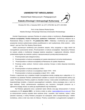 UNIWERSYTET WROCŁAWSKI Wydział Nauk Historycznych i Pedagogicznych Katedra Etnologii i Antropologii Kulturowej Wrocław 50-139; ul. Szewska 50/51; tel. (071) 3752 684; fax (071) 343 0553 Prof. dr hab. Bożena Płonka-Syroka Katedra Etnologii i Antropologii Kulturowej Uniwersytetu Wrocławskiego Komitet Organizacyjny zaprasza Państwa do wzięcia udziału w konferencji „Prowincjonalizm w kulturze europejskiej. Analiza historyczna, społeczna i kulturowa”. Konferencja odbędzie się w Świeradowie Zdroju w dniach 9 - 10 października 2008 r. Materiały z konferencji (po uzyskaniu pozytywnej recenzji wydawniczej) zostaną opublikowane w serii wydawniczej „Orbis exterior – orbis interior”, pod red. Pani Prof. Bożeny Płonki-Syroki. Celem poznawczym konferencji jest powołanie zespołu, który przygotuje w ciągu dwóch lat monograficzne opracowanie tematu „Prowincjonalizm w kulturze europejskiej”. Zapraszamy Państwa do wzięcia udziału w konferencji inicjującej badania zespołowe i wygłoszenie referatów, których problematyka będzie się mieściła w jednej z zaproponowanych poniżej sekcji tematycznych: 1. Prowincjonalizm jako kategoria kultury. 2. Prowincjonalizm w kulturze europejskiej od czasów starożytnych do końca średniowiecza. 3. Prowincjonalizm w kulturze europejskiej od Renesansu do upadku Napoleona. 4. Prowincje wobec centrum. Centrum wobec prowincji. Europa w dobie ekspansji kolonialnej XVI – XIX w. 5. Prowincjonalizm w kulturze polskiej do 1918 r. 6. Prowincjonalizm w kulturze w europejskiej w latach 1815 – 1914. 7. Prowincjonalizm w kulturze europejskiej w latach 1914 – 2008. Prosimy o zapoznanie się z projektem książki (szczegółowe tematy znajdują się w załączniku nr 1) i określenie czy jesteście Państwo zainteresowani udziałem w pracach nad opracowaniem jednej z jej części. Przedstawiony Państwu projekt ma charakter ramowy i może zostać zmodyfikowany w wyniku bezpośredniego kontaktu z Autorami poszczególnych rozdziałów, którzy przystąpią wraz z nami do jego realizacji. Osoby zainteresowane współpracą przy tworzeniu monografii proszone są o zgłoszenie swojego akcesu na adres jej współredaktorki mgr Kai Marchel. Na Państwa zgłoszenia wraz z podaniem tytułu referatu oraz jego streszczeniem (1 strona) oczekujemy do 31 sierpnia 2008 r. (w formie e-maila na adres: [email protected]). Wraz ze streszczeniem prosimy przesłać dane osobowe (imię i nazwisko, tytuł naukowy, nazwa i adres placówki naukowej, w której Państwo pracujecie lub studiujecie; adres korespondencyjny i telefon kontaktowy, adres e-mail oraz dane do faktury). Prosimy uczestników o przygotowanie wystąpień o 1 maksymalnej objętości 6 str. maszynopisu (20 min.). Na pełną wersję artykułów o objętości do 30 str. (czcionka Times New Roman; interlinia: 1,5; marginesy: 2,5 z prawej, góra i dół strony oraz 3,5 z lewej; ok. 1800 znaków na str.) wraz z nośnikiem elektronicznym (CD, dyskietka) oczekujemy do końca 2008 r. Opłata konferencyjna, wynosząca 200 zł, przeznaczona będzie przede wszystkim na dofinansowanie wspomnianej wyżej publikacji oraz materiały konferencyjne. Jako imprezę towarzyszącą konferencji przewidujemy zorganizowane wyjście do „Chaty Tyrolskiej”. Osoby zainteresowane prosimy o przesyłanie zgłoszenia (formularz zgłoszeniowy znajduje się w załączniku nr 2) na adres Katedry Etnologii i Antropologii Kulturowej (lub mailowo na adres: [email protected]) oraz wpłacenie opłaty na konto Fundacji Humanitas et Scientia: ul. Witosa 16, 51 – 507 Wrocław Nr konta: 78 1020 5226 0000 6202 0019 4225 PKO BO S.A. I O/Wrocław ul. Wita Stwosza 33/35 z dopiskiem: Prowincjonalizm w kulturze europejskiej. Komitet Organizacyjny zapewnia wstępną rezerwację noclegów w hotelu w Świeradowie Zdroju. Rezerwację należy potwierdzić bezpośrednio na adres hotelu (potwierdzenie pisemne, z osobistym podpisem), najpóźniej 2 tygodnie przed datą konferencji. Katedra Etnologii i Antropologii Kulturowej nie odpowiada finansowo za dokonane rezerwacje, których brak potwierdzenia w podanym powyżej terminie, traktować będziemy jako równoznaczny z rezygnacją Państwa udziału w imprezie. W sprawach programowych prosimy o kontakt: Sekretarz naukowy konferencji: Kaja Marchel, tel. 667 951 375, e-mail: [email protected]. W sprawach organizacyjnych (noclegi, dojazd, itp.): Sekretarz organizacyjny konferencji: Marek Szymczak, tel. 603 053 639, e-mail: [email protected]. Zgłoszenia prosimy przesyłać pocztą na adres Katedry Etnologii i Antropologii Kulturowej Uniwersytetu Wrocławskiego oraz na adres elektroniczny [email protected]. Z wyrazami szacunku Komitet Organizacyjny Sekretarz Przewodnicząca mgr Kaja Marchel Prof. dr hab. Bożena Płonka-Syroka 2 Załącznik nr 1 Prowincjonalizm w kulturze europejskiej. (Makieta książki) Część pierwsza Prowincjonalizm jako kategoria kultury 1. Prowincjonalizm - próba definicji. Omówienie stanu badań nad kategorią prowincjonalizmu w obrębie poszczególnych nauk humanistycznych. 2. Orbis interior - orbis exterior. Dystynkcje „świata naszego” w świadomości prowincjonalnej. 3. Obraz „innego”. Dystynkcje świata uznanego za „nie nasz” w świadomości prowincjonalnej. 4. Nasz „świat marzony” i „świat bezpieczny”. Sposoby kreowania i utrwalania poczucia swojskości w świadomości prowincjonalnej. Część druga Prowincjonalizm w kulturze europejskiej od czasów starożytnych do końca średniowiecza 1. Grecka „koine” - koncepcja świata zdecentraliowanego. 2. „Roma locuta” - Rzym wobec prowincji i prowincje rzymskie wobec centrum politycznego. Analiza wzajemnego postrzegania. 3. „Sancta ecclesia” - uniwersalizm chrześcijaństwa i wewnętrzna wobec niego opozycja . Analiza wzajemnego postrzegania stron sporu. 4. Rzym i Bizancjum - dwa centra życia religijnego wewnątrz chrześcijaństwa Analiza wzajemnego postrzegania stron sporu. 5. Chrześc