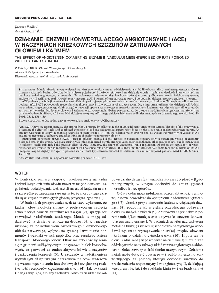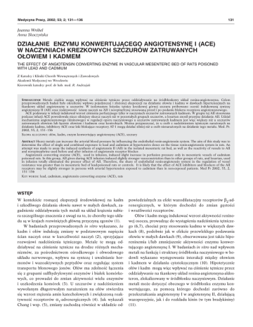 Medycyna Pracy, 2002; 53; 2; 131—136 131 Joanna Wróbel Anna Skoczyńska DZIA£ANIE ENZYMU KONWERTUJ¥CEGO ANGIOTENSYNÊ I (ACE) W NACZYNIACH KREZKOWYCH SZCZURÓW ZATRUWANYCH O£OWIEM I KADMEM THE EFFECT OF ANGIOTENSIN CONVERTING ENZYME IN VASCULAR MESENTERIC BED OF RATS POISONED WITH LEAD AND CADMIUM Z Katedry i Kliniki Chorób Wewnętrznych i Zawodowych Akademii Medycznej we Wrocławiu Kierownik katedry: prof. dr hab. med. R. Andrzejak STRESZCZENIE Metale ciężkie mogą wpływać na ciśnienie tętnicze przez oddziaływanie na śródbłonkowy układ renina-angiotensyna. Celem przeprowadzonych badań było określenie wpływu pojedynczej i złożonej ekspozycji na działanie ołowiu i kadmu w dawkach hipertensyjnych na tkankowy układ angiotensyny u szczurów. W izolowanym łożysku tętnicy krezkowej górnej szczura próbowano ocenić indukowaną syntezę angiotensyny II (AII) oraz reaktywność ściany naczyń na AII i norepinefrynę stosowaną przed i po podaniu blokera receptora angiotensynowego. ACE podawany w infuzji indukował wzrost ciśnienia perfuzyjnego tylko w naczyniach szczurów zatruwanych kadmem. W grupie tej AII stosowana podczas infuzji ACE powodowała nieco silniejszy skurcz naczyń niż w pozostałych grupach szczurów, a losartan znosił presyjne działanie AII. Udział mechanizmu angiotensynowego (kininowego) w regulacji oporu naczyniowego u szczurów zatruwanych kadmem jest więc większy niż u szczurów zatruwanych ołowiem lub łącznie ołowiem i kadmem oraz kontrolnych. Można przypuszczać, że u osób z nadciśnieniem tętniczym narażonych na działanie kadmu, inhibitory ACE oraz leki blokujące receptory AT-1 mogą działać silniej niż u osób nienarażonych na działanie tego metalu. Med. Pr. 2002, 53, 2, 131–136 Słowa kluczowe: ołów, kadm, enzym konwertujący angiotensynę (ACE), szczury ABSTRACT Heavy metals can increase the arterial blood pressure by influencing the endothelial renin-angiotensin system. The aim of this study was to determine the effect of single and combined exposure to lead and cadmium at hypertensive doses on the tissue renin-angiotensin system in rats. An attempt was made to assay the induced synthesis of angiotensin II (AII) in the isolated mesenteric rat bed, as well as the reactivity of vessels to AII and norepinephrine used before and after infusion of angiotensin receptor blocker. Angiotensin converting enzyme (ACE), used in infusion, induced slight increase in perfusion pressure only in mesenteric vessels of cadmium poisoned rats. In this group, AII given during ACE infusion induced slightly stronger vasoconstriction than in other groups of rats, and losartan, used in infusion totally eliminated the pressor effect of AII. Therefore, the share of endothelial renin-angiotensin system in the regulation of vessel resistance was greater than in mesenteric bed of lead-poisoned rats or controls. It is likely that the effect of ACE inhibitors and blockers of the AII receptors may be slightly stronger in persons with arterial hypertension exposed to cadmium than in non-exposed patients. Med Pr 2002, 53, 2, 131–136 Key words: lead, cadmium, angiotensin converting enzyme (ACE), rats WSTÊP W kontekście rosnącej ekspozycji środowiskowej na kadm i szkodliwego działania ołowiu nawet w małych dawkach, zagadnienie oddziaływania tych metali na układ krążenia nabiera szczególnego znaczenia z uwagi na to, że choroby tego układu są w krajach rozwiniętych główną przyczyną zgonów (1). W badaniach przeprowadzonych in vitro wykazano, że kadm i ołów indukują zmiany w podstawowym napięciu ścian naczyń oraz w kurczliwości naczyń (2), sprzyjające rozwojowi nadciśnienia tętniczego. Metale te mogą oddziaływać na ciśnienie tętnicze na drodze różnych mechanizmów, za pośrednictwem ośrodkowego i obwodowego układu nerwowego, wpływu na syntezę i uwalnianie hormonów i wazoaktywnych peptydów oraz regulując system transportu błonowego jonów. Ołów ma zdolność łączenia się z grupami sulfhydrylowymi enzymów i białek komórkowych, co prowadzi do zmian aktywności wielu enzymów i uszkodzenia komórek (3). U szczurów z nadciśnieniem wywołanym długotrwałym narażeniem na ołów stwierdza się wzrost stężenia amin katecholowych i zwiększoną reaktywność receptorów α1-adrenergicznych (4). Jak wykazali Chang i wsp. (5), zmiany zachodzą również w układzie od- powiedzialnych za efekt wazodilatacyjny receptorów β2-adrenergicznych, w którym dochodzi do zmian gęstości i wrażliwości receptorów. Ołów i kadm mogą indukować wzrost aktywności reninowej osocza, prowadząc do wystąpienia nadciśnienia tętniczego (6,7), chociaż przy stosowaniu kadmu w większych dawkach (8), podobnie jak w efekcie przewlekłego podawania ołowiu w małych dawkach (9), obserwowana jest także hiporeninemia i/lub zmniejszenie aktywności enzymu konwertującego angiotensynę I. W badaniach in vitro nad wpływem metali na funkcję i strukturę śródbłonka naczyniowego w hodowli wykazano występowanie interakcji między ołowiem i kadmem w działaniu cytotoksycznym (10). Hipotetycznie ołów i kadm mogą więc wpływać na ciśnienie tętnicze przez oddziaływanie na tkankowy układ renina-angiotensyna-aldosteron, zlokalizowany w śródbłonku naczyniowym. Działanie metali może dotyczyć obecnego w śródbłonku enzymu konwertującego, za pomocą którego dochodzi zarówno do przekształcania angiotensyny I w angiotensynę II, działającą wazopresyjnie, jak i do rozkładu kinin (w tym bradykininy) (11). 132 J. Wróbel, A. Skoczyńska W badaniach przeprowadzonych in vitro w wyizolowanych naczyniach trzewnych szczura wykazano, że kadm zwiększa działanie endogennej A II, co może wynikać ze zmian w uwalnianiu angiotensyny II pochodzenia śródbłonkowego (12). Z drugiej strony dysfunkcja śródbłonka związana z zaburzeniami regulacji napięcia naczyniowego przez angiotensynę II jest opisywana jak