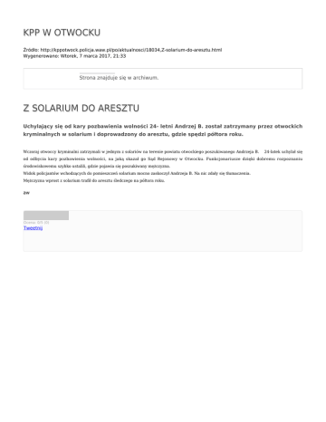 KPP W OTWOCKU Źródło: http://kppotwock.policja.waw.pl/po/aktualnosci/18034,Z-solarium-do-aresztu.html Wygenerowano: Wtorek, 7 marca 2017, 21:33 Strona znajduje się w archiwum. Z SOLARIUM DO ARESZTU Uchylający się od kary pozbawienia wolności 24- letni Andrzej B. został zatrzymany przez otwockich kryminalnych w solarium i doprowadzony do aresztu, gdzie spędzi półtora roku. Wczoraj otwoccy kryminalni zatrzymali w jednym z solariów na terenie powiatu otwockiego poszukiwanego Andrzeja B. 24-latek uchylał się od odbycia kary pozbawienia wolności, na jaką skazał go Sąd Rejonowy w Otwocku. Funkcjonariusze dzięki dobremu rozpoznaniu środowiskowemu szybko ustalili, gdzie pojawia się poszukiwany mężczyzna. Widok policjantów wchodzących do pomieszczeń solarium mocno zaskoczył Andrzeja B. Na nic zdały się tłumaczenia. Mężczyzna wprost z solarium trafił do aresztu śledczego na półtora roku. aw Ocena: 0/5 (0) Tweetnij
