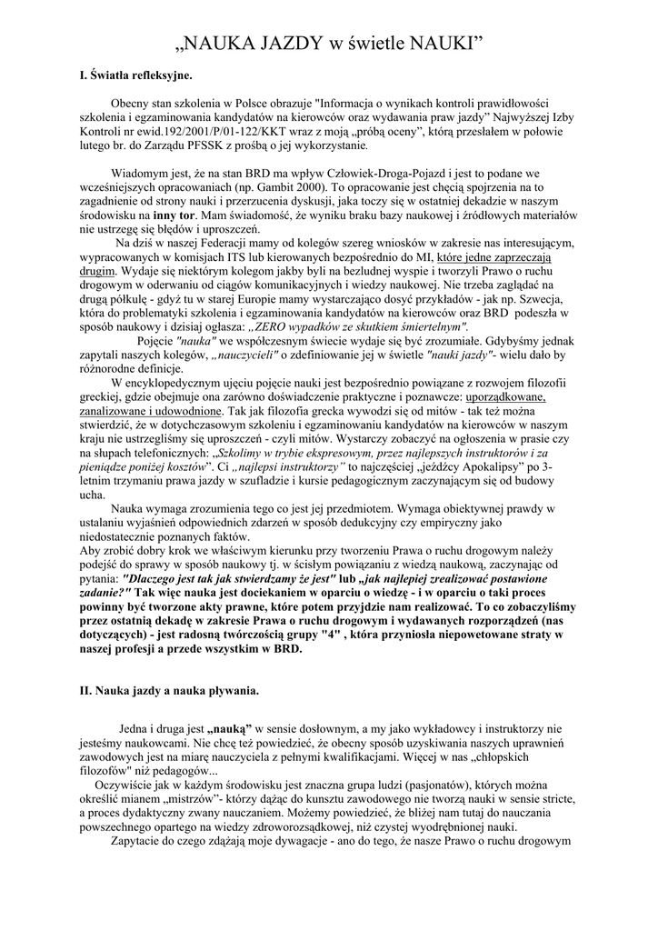 „NAUKA JAZDY w świetle NAUKI” I. Światła refleksyjne. Obecny stan szkolenia w Polsce obrazuje "Informacja o wynikach kontroli prawidłowości szkolenia i egzaminowania kandydatów na kierowców oraz wydawania praw jazdy” Najwyższej Izby Kontroli nr ewid.192/2001/P/01-122/KKT wraz z moją „próbą oceny”, którą przesłałem w połowie lutego br. do Zarządu PFSSK z prośbą o jej wykorzystanie. Wiadomym jest, że na stan BRD ma wpływ Człowiek-Droga-Pojazd i jest to podane we wcześniejszych opracowaniach (np. Gambit 2000). To opracowanie jest chęcią spojrzenia na to zagadnienie od strony nauki i przerzucenia dyskusji, jaka toczy się w ostatniej dekadzie w naszym środowisku na inny tor. Mam świadomość, że wyniku braku bazy naukowej i źródłowych materiałów nie ustrzegę się błędów i uproszczeń. Na dziś w naszej Federacji mamy od kolegów szereg wniosków w zakresie nas interesującym, wypracowanych w komisjach ITS lub kierowanych bezpośrednio do MI, które jedne zaprzeczają drugim. Wydaje się niektórym kolegom jakby byli na bezludnej wyspie i tworzyli Prawo o ruchu drogowym w oderwaniu od ciągów komunikacyjnych i wiedzy naukowej. Nie trzeba zaglądać na drugą półkulę - gdyż tu w starej Europie mamy wystarczająco dosyć przykładów - jak np. Szwecja, która do problematyki szkolenia i egzaminowania kandydatów na kierowców oraz BRD podeszła w sposób naukowy i dzisiaj ogłasza: „ZERO wypadków ze skutkiem śmiertelnym". Pojęcie "nauka" we współczesnym świecie wydaje się być zrozumiałe. Gdybyśmy jednak zapytali naszych kolegów, „nauczycieli" o zdefiniowanie jej w świetle "nauki jazdy"- wielu dało by różnorodne definicje. W encyklopedycznym ujęciu pojęcie nauki jest bezpośrednio powiązane z rozwojem filozofii greckiej, gdzie obejmuje ona zarówno doświadczenie praktyczne i poznawcze: uporządkowane, zanalizowane i udowodnione. Tak jak filozofia grecka wywodzi się od mitów - tak też można stwierdzić, że w dotychczasowym szkoleniu i egzaminowaniu kandydatów na kierowców w naszym kraju nie ustrzegliśmy się uproszczeń - czyli mitów. Wystarczy zobaczyć na ogłoszenia w prasie czy na słupach telefonicznych: „Szkolimy w trybie ekspresowym, przez najlepszych instruktorów i za pieniądze poniżej kosztów”. Ci „najlepsi instruktorzy” to najczęściej „jeźdźcy Apokalipsy” po 3letnim trzymaniu prawa jazdy w szufladzie i kursie pedagogicznym zaczynającym się od budowy ucha. Nauka wymaga zrozumienia tego co jest jej przedmiotem. Wymaga obiektywnej prawdy w ustalaniu wyjaśnień odpowiednich zdarzeń w sposób dedukcyjny czy empiryczny jako niedostatecznie poznanych faktów. Aby zrobić dobry krok we właściwym kierunku przy tworzeniu Prawa o ruchu drogowym należy podejść do sprawy w sposób naukowy tj. w ścisłym powiązaniu z wiedzą naukową, zaczynając od pytania: "Dlaczego jest tak jak stwierdzamy że jest" lub „jak najlepiej zrealizować postawione zadanie?" Tak więc nauka jest dociekaniem w oparciu o wiedzę - i w oparciu o taki proces powinny być tworzone akty prawne, które potem przyjdzie nam realizować. To co zobaczyliśmy przez ostatnią dekadę w zakresie Prawa o ruchu drogowym i wydawanych rozporządzeń (nas dotyczących) - jest radosną twórczością grupy "4" , która przyniosła niepowetowane straty w naszej profesji a przede wszystkim w BRD. II. Nauka jazdy a nauka pływania. Jedna i druga jest „nauką” w sensie dosłownym, a my jako wykładowcy i instruktorzy nie jesteśmy naukowcami. Nie chcę też powiedzieć, że obecny sposób uzyskiwania naszych uprawnień zawodowych jest na miarę nauczyciela z pełnymi kwalifikacjami. Więcej w nas „chłopskich filozofów" niż pedagogów... Oczywiście jak w każdym środowisku jest znaczna grupa ludzi (pasjonatów), których można określić mianem „mistrzów”- którzy dążąc do kunsztu zawodowego nie tworzą nauki w sensie stricte, a proces dydaktyczny zwany nauczaniem. Możemy powiedzieć, że bliżej nam tutaj do nauczania powszechnego opartego na wiedzy zdroworozsądkowej, niż czystej wyodrębnionej nauki. Zapytacie do czego zdążają moje dywagacje - ano do tego, że nasze Prawo o ruchu drogowym 2 pozbawione jest podstaw bazy naukowej. Brak nam jest w tej dziedzinie autorytetów naukowych, na których moglibyśmy się powoływać. Dlatego uważam, że jest u nas tak marnie w tej dziedzinie. Nasze zdroworozsądkowe nauczanie jest zbiorem wiadomości osiągniętym nie w sposób naukowy, a na podstawie przeżytych doświadczeń i spostrzeżeń. Wiedzę tą cechuje przypadkowość doboru spostrzeżeń i wiadomości a często też niepełny krytycyzm nas samych, będący wynikiem nie sprawdzonych sądów empirycznych. Przykładów w naszym środowisku można by mnożyć wystarczy, że spotka się 4-ch naszych kolegów, to w dyskusji zobaczymy jak każdy z nich ma odrębną filozofię nauczania i wiedzę na podbudowie tzw. "zdrowego rozsądku"- w myśl hasła kierowców: „przewiduj i myśl". Drugą, może nawet ważniejszą w naszym środowisku, jest wiedza praktyczna, która powinna opierać się na wiedzy naukowej i wiedzy zdroworozsądkowej. I tutaj również brak jest nam autorytetów i podstaw naukowych. Wiedza zdroworozsądkowa nadal wiedzie prym, a z „braku laku” - lepszym autorytetem będzie lansowany mistrz kierownicy danego sezonu i szwagier - kierowca z PKS - niż "Starszy mistrz instruktor". Na usprawiedliwienie często podajemy przykłady: „po co nam naukowcy skoro szybciej nauczymy praktycznej jazdy kandydata po szkole podstawowej niż fizyka?”. Taka jest prawda i wiemy dlaczego tak jest: Ten pierwszy beztrosko siada za kierownicą i skupia się jedynie na prowadzeniu pojazdu, a ten drugi przed kręceniem kółkiem analizuje wszystkie zagrożenia jakie mogą go spotkać. To rzeczywiste doświadczenie wyrobiło w nas wykładowcach - instruktorach swoistą dumę, którą tak często można spot