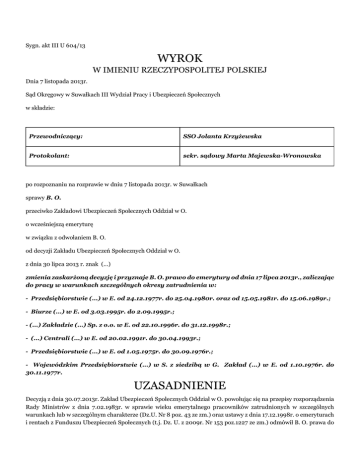 Sygn. akt III U 604/13 WYROK W IMIENIU RZECZYPOSPOLITEJ POLSKIEJ Dnia 7 listopada 2013r. Sąd Okręgowy w Suwałkach III Wydział Pracy i Ubezpieczeń Społecznych w składzie: Przewodniczący: SSO Jolanta Krzyżewska Protokolant: sekr. sądowy Marta Majewska-Wronowska po rozpoznaniu na rozprawie w dniu 7 listopada 2013r. w Suwałkach sprawy B. O. przeciwko Zakładowi Ubezpieczeń Społecznych Oddział w O. o wcześniejszą emeryturę w związku z odwołaniem B. O. od decyzji Zakładu Ubezpieczeń Społecznych Oddział w O. z dnia 30 lipca 2013 r. znak (...) zmienia zaskarżoną decyzję i przyznaje B. O. prawo do emerytury od dnia 17 lipca 2013r., zaliczając do pracy w warunkach szczególnych okresy zatrudnienia w: - Przedsiębiorstwie (...) w E. od 24.12.1977r. do 25.04.1980r. oraz od 15.05.1981r. do 15.06.1989r.; - Biurze (...) w E. od 3.03.1995r. do 2.09.1995r.; - (...) Zakładzie (...) Sp. z o.o. w E. od 22.10.1996r. do 31.12.1998r.; - (...) Centrali (...) w E. od 20.02.1991r. do 30.04.1993r.; - Przedsiębiorstwie (...) w E. od 1.05.1975r. do 30.09.1976r.; - Wojewódzkim Przedsiębiorstwie (...) w S. z siedzibą w G. Zakład (...) w E. od 1.10.1976r. do 30.11.1977r. UZASADNIENIE Decyzją z dnia 30.07.2013r. Zakład Ubezpieczeń Społecznych Oddział w O. powołując się na przepisy rozporządzenia Rady Ministrów z dnia 7.02.1983r. w sprawie wieku emerytalnego pracowników zatrudnionych w szczególnych warunkach lub w szczególnym charakterze (Dz.U. Nr 8 poz. 43 ze zm.) oraz ustawy z dnia 17.12.1998r. o emeryturach i rentach z Funduszu Ubezpieczeń Społecznych (t.j. Dz. U. z 2009r. Nr 153 poz.1227 ze zm.) odmówił B. O. prawa do wcześniejszej emerytury z uwagi na brak 15 lat pracy w warunkach szczególnych. W tym zakresie nie zaliczył do stażu pracy w warunkach szczególnych okresów zatrudnienia: - od 24.12.1977r. do 15.06.1989r. w Przedsiębiorstwie (...) w E. z uwagi na niewskazanie rodzaju prac zgodnie z rozporządzeniem z dnia 07.02.1983r.; - od 03.03.1995r. do 02.09.1995r. w Biurze (...) w E. z uwagi na niewskazanie przepisów rozporządzenia, w tym wykazu, działu i pozycji; - od 22.04.1996r. do 31.12.1998r. w (...) Zakładzie (...) w E. z uwagi na zajmowanie dwóch stanowisk pracy – mechanika-kierowcy i kierowcy autobusu, a zakład wskazał na stanowisko kierowcy autobusu. W odwołaniu B. O. domagał się zmiany decyzji i przyznania prawa do wcześniejszej emerytury. Wskazał, iż w wykazał 15 lat pracy w warunkach szczególnych. Oprócz okresów nieuwzględnionych przez organ rentowy powołał się na zatrudnienie w Centrali Rybnej od 20.02.1991r. do 31.10.1993r., gdzie również pracował w warunkach szczególnych. W odpowiedzi na odwołanie organ rentowy wniósł o jego oddalenie. Podtrzymał podstawy skarżonej decyzji. Odnośnie okresu zatrudnienia w Centrali Rybnej wskazał, iż ze świadectwa pracy wynika, iż w tym okresie zajmował dwa stanowiska – kierowcy i robotnika magazynowego. Sąd ustalił, co następuje: B. O. (ur. (...)) w dniu 17.07.2013r. wystąpił z wnioskiem o emeryturę. Na dzień 01.01.1999r. udowodnił 28 lat 1 miesiąc i 2 dni okresów składowych i nieskładkowych. Do stażu pracy w warunkach szczególnych organ rentowy nie zaliczył mu żadnego okresu. W okresie od 05.04.1972r. do 30.09.1976r. odwołujący był zatrudniony stale i w pełnym wymiarze czasu pracy w Przedsiębiorstwie (...) w E. początkowo jako robotnik budowlany, a dopiero później jako kierowca samochodu ciężarowego. W trakcie zatrudnienia odwołujący odbywał zasadniczą służbę wojskową – od 27.04.1973r. do 08.04.1975r. i w trakcie jej odbywania uzyskał uprawnienia do kierowania pojazdami ciężarowymi. Po powrocie do pracy został mu przydzielony do obsługi samochód (...). Zakład posiadał na stanie wywrotki oraz samochody skrzyniowe. Odwołujący obsługiwał oba samochody, co potwierdził świadek J. K. (zeznania 28:55 – 32:10) Powyższy okres zatrudnienia został w części zaliczony do stażu pracy w warunkach szczególnych od 01.05.1975r. do 30.09.1976r. (1 rok 5 miesięcy). Jest to okres od kiedy po ukończeniu służby wojskowej wnioskodawca powrócił do macierzystej jednostki i zajął stanowisko kierowcy samochodu ciężarowego. Od 01.10.1976r. do 30.11.1977r. wnioskodawca był zatrudniony stale i w pełnym wymiarze czasu pracy w Przedsiębiorstwie (...) w S. zs. w G. Zakładzie (...) w E., jako kierowca samochodu ciężarowego. Okres ten w całości uwzględniono do stażu pracy w warunkach szczególnych (1 rok 2 miesiące). Kolejny okres rozważany pod kątem pracy w warunkach szczególnych dotyczył zatrudnienia w Przedsiębiorstwie (...) w E.. W zakładzie tym wnioskodawca pracował stale i w pełnym wymiarze czasu pracy od 24.12.1977r. do 15.06.1989r. Z akt osobowych wynika, iż odwołujący pracował jako kierowca autobusu (koperta k. 12), ale na podstawie zeznań świadek E. N. ustalono, iż zajmował się również obsługą samochodów ciężarowych – (...), którymi woził materiały na budowy, węgiel i żużel z kotłowni. Do stażu pracy w warunkach szczególnych nie zaliczono okresu od 26.04.1980r. do 14.05.1981r., gdyż w tym okresie, jak wynika z dokumentacji znajdującej się w aktach osobowych, został przeniesiony na stanowisko malarza budowlanego, a takie stanowisko nie zostało przewidziane w wykazie A. Do stażu pracy w warunkach szczególnych zaliczono okres od 24.12.1977r. do 24.04.1980r. i od 15.05.1981r. do 15.06.1989r. (10 lat 5 miesięcy). W okresie od 20.02.1991r. do 31.10.1993r. odwołujący był zatrudniony stale i w pełnym wymiarze czasu pracy w Przedsiębiorstwie (...) w E.. Z ustaleń poczynionych na podstawie zeznań świadków: D. B. (24:19 - 28:15) i H. R. (34:45 - 37:56) ustalono, iż odwołujący jako kierowca pracował przy obsłudze samochodów ciężarowych chłodni, którymi transportował do sklepów produkty wytworzone w centrali np. mrożonki, konserwy rybne. Wyjeżdżał również po towar d