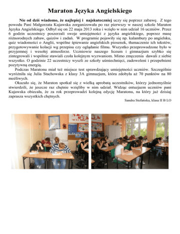 Maraton Języka Angielskiego Nie od dziś wiadomo, że najlepiej i najskuteczniej uczy się poprzez zabawę. Z tego powodu Pani Małgorzata Kujawska zorganizowała po raz pierwszy w naszej szkole Maraton Języka Angielskiego. Odbył się on 22 maja 2013 roku i wzięło w nim udział 16 uczniów. Przez 6 godzin uczestnicy poszerzali swoje umiejętności z języka angielskiego, poprzez masę różnorodnych zabaw, quizów i zadań. W programie pojawiły się np. kalambury po angielsku, quiz wiadomości o Anglii, wspólne śpiewanie angielskich piosenek, tłumaczenie ich tekstów, przygotowywanie kolacji wg przepisu czy oglądanie filmu. Wszystko przeprowadzone było w przyjemnej i wesołej atmosferze. Uczniowie naszego liceum i gimnazjum szybko się zintegrowali i wspólnie stawiali czoła kolejnym wyzwaniom. Mimo zmęczenia dawali z siebie wszystko. O godzinie 22 uczestnicy wyszli ze szkoły uśmiechnięci, zadowoleni i przepełnieni pozytywną energią. Podczas Maratonu miał też miejsce test sprawdzający umiejętności uczniów. Szczególnie wyróżniła się Julia Stachowska z klasy 3A gimnazjum, która zdobyła aż 70 punktów na 80 możliwych. Okazało się, że Maraton spotkał się z wielką aprobatą uczestników, którzy jednomyślnie stwierdzili, że jeszcze raz chętnie wzięliby w nim udział. Widząc entuzjazm uczniów pani Kujawska obiecała, że za rok przeprowadzi kolejną edycję Maratonu, na który już dzisiaj zaprasza wszystkich chętnych. Sandra Stefańska, klasa II B LO
