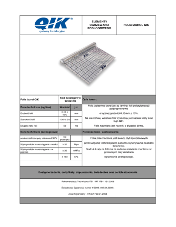 ELEMENTY OGRZEWANIA PODŁOGOWEGO FOLIA IZOROL QIK Folia Izorol QIK Kod katalogowy: Opis towaru 92 894 95 Dane techniczne (ogólne) Wartość j.m Folia izolacyjna Izorol jest to laminat folii polietylenowej i polipropylenowej 0,13 ± 10% mm o łącznej grubości 0,13mm ± 10%. 1040 ± 2% mm Na wierzchniej warstwie folii wykonany jest nadruk kraty oraz logo QIK. 50 mb Folia nawinięta jest na rolki o długości 50mb. Grubość folii Szerokość folii Długość rolki folii Dane techniczne (szczegółowe) Przeznaczenie / zastosowania wodoszczelność przy ciśnieniu 2 kPa nie przesiąka Wytrzymałość na rozciąganie - wzdłuż ≥ 20 Mpa Wytrzymałość na rozciąganie - w poprzek ≥ 30 mMPa ≥ 150 kPa Folia przeznaczona jest izolacji płyt styropianowych przed wilgocią technologiczną podczas wykonywania posadzki betonowej. Nadruk kraty na folii ma za zadanie ułatwienie montażu rur grzewczych przy układaniu ogrzewania podłogowego. Dostępne badania, certyfikaty, dopuszczenia, świadectwa oraz cel ich stosowania Rekomendacja Techniczna ITB - RT ITB-1151/2009 Świadectwo Zgodności numer 1/2009 z 02.04.2009r. Atest higieniczny - HK/B/1760/01/2008
