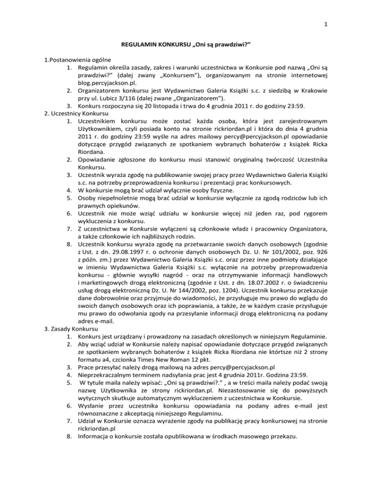 1 REGULAMIN KONKURSU „Oni są prawdziwi?” 1.Postanowienia ogólne 1. Regulamin określa zasady, zakres i warunki uczestnictwa w Konkursie pod nazwą „Oni są prawdziwi?” (dalej zwany „Konkursem”), organizowanym na stronie internetowej blog.percyjackson.pl. 2. Organizatorem konkursu jest Wydawnictwo Galeria Książki s.c. z siedzibą w Krakowie przy ul. Lubicz 3/116 (dalej zwane „Organizatorem”). 3. Konkurs rozpoczyna się 20 listopada i trwa do 4 grudnia 2011 r. do godziny 23:59. 2. Uczestnicy Konkursu 1. Uczestnikiem konkursu może zostad każda osoba, która jest zarejestrowanym Użytkownikiem, czyli posiada konto na stronie rickriordan.pl i która do dnia 4 grudnia 2011 r. do godziny 23:59 wyśle na adres mailowy [email protected] opowiadanie dotyczące przygód związanych ze spotkaniem wybranych bohaterów z książek Ricka Riordana. 2. Opowiadanie zgłoszone do konkursu musi stanowid oryginalną twórczośd Uczestnika Konkursu. 3. Uczestnik wyraża zgodę na publikowanie swojej pracy przez Wydawnictwo Galeria Książki s.c. na potrzeby przeprowadzenia konkursu i prezentacji prac konkursowych. 4. W konkursie mogą brad udział wyłącznie osoby fizyczne. 5. Osoby niepełnoletnie mogą brad udział w konkursie wyłącznie za zgodą rodziców lub ich prawnych opiekunów. 6. Uczestnik nie może wziąd udziału w konkursie więcej niż jeden raz, pod rygorem wykluczenia z konkursu. 7. Z uczestnictwa w Konkursie wyłączeni są członkowie władz i pracownicy Organizatora, a także członkowie ich najbliższych rodzin. 8. Uczestnik konkursu wyraża zgodę na przetwarzanie swoich danych osobowych (zgodnie z Ust. z dn. 29.08.1997 r. o ochronie danych osobowych Dz. U. Nr 101/2002, poz. 926 z późn. zm.) przez Wydawnictwo Galeria Książki s.c. oraz przez inne podmioty działające w imieniu Wydawnictwa Galeria Książki s.c. wyłącznie na potrzeby przeprowadzenia konkursu - głównie wysyłki nagród - oraz na otrzymywanie informacji handlowych i marketingowych drogą elektroniczną (zgodnie z Ust. z dn. 18.07.2002 r. o świadczeniu usług drogą elektroniczną Dz. U. Nr 144/2002, poz. 1204). Uczestnik konkursu przekazuje dane dobrowolnie oraz przyjmuje do wiadomości, że przysługuje mu prawo do wglądu do swoich danych osobowych oraz ich poprawiania, a także, że w każdym czasie przysługuje mu prawo do odwołania zgody na przesyłanie informacji drogą elektroniczną na podany adres e-mail. 3. Zasady Konkursu 1. Konkurs jest urządzany i prowadzony na zasadach określonych w niniejszym Regulaminie. 2. Aby wziąd udział w Konkursie należy napisad opowiadanie dotyczące przygód związanych ze spotkaniem wybranych bohaterów z książek Ricka Riordana nie którtsze niż 2 strony formatu a4, czcionka Times New Roman 12 pkt. 3. Prace przesyład należy drogą mailową na adres [email protected] 4. Nieprzekraczalnym terminem nadsyłania prac jest 4 grudnia 2011r. Godzina 23:59. 5. W tytule maila należy wpisad: „Oni są prawdziwi?.” , a w treści maila należy podad swoją nazwę Użytkownika ze strony rickriordan.pl. Niezastosowanie się do powyższych wytycznych skutkuje automatycznym wykluczeniem z uczestnictwa w Konkursie. 6. Wysłanie przez uczestnika konkursu opowiadania na podany adres e-mail jest równoznaczne z akceptacją niniejszego Regulaminu. 7. Udział w Konkursie oznacza wyrażenie zgody na publikację pracy konkursowej na stronie rickriordan.pl 8. Informacja o konkursie została opublikowana w środkach masowego przekazu. 2 9. Komisja Konkursowa wyłoni 3 laureatów spośród uczestników konkursu. 4. Nagrody w Konkursie 1. Nagrodę stanowi wybrana książka autorstwa Ricka Riordana dostępna w bieżącej ofercie Wydawnictwa Galeria Książki oraz pomaraoczowa koszulka Klubu Herosów. 2. Do dnia 6 grudnia 2011r. Komisja Konkursowa wyłoni 3 zwycięzców. Wyniki zostaną ogłoszone na stronie internetowej rickriordan.pl 3. Osoba nagrodzona zostanie dodatkowo poinformowana o nagrodzie e-mailem informacja zostanie wysłana na adres e-mail właściwy dla konta uczestnika konkursu w serwisie rickriordan. Warunkiem przekazania nagrody jest podanie przez osobę nagrodzoną danych osobowych. W przypadku osoby niepełnoletniej warunkiem przekazania nagrody będzie potwierdzenie chęci odebrania nagrody przez rodziców (lub prawnych opiekunów) nagrodzonej osoby. Niespełnienie powyższych warunków jest równorzędne z rezygnacją z nagrody. 4. Uczestnikowi konkursu przysługuje prawo do rezygnacji z nagrody. 5. Laureat konkursu zobowiązany jest w przeciągu 7 dni od daty ogłoszenia wyników w formie wiadomości elektronicznej na wskazany przez Organizatora adres e-mail ([email protected]) dostarczyd adres, na który ma zostad przesłana nagroda. Po upływie tego terminu nagroda przepada. 6. Uczestnik ponosi pełną odpowiedzialnośd za prawdziwośd i podanych danych osobowych. Uczestnik traci prawo do nagrody, jeżeli poda niepełny adres korespondencyjny, podany adres będzie nieprawidłowy lub uniemożliwiający doręczenie nagrody. 5. Rozstrzygnięcie Konkursu 1. Celem rozstrzygnięcia Konkursu Organizator powoła Komisję Konkursową. W skład Komisji wejdą dwie osoby delegowane przez Organizatora. 2. Decyzje podjęte przez Komisję są ostateczne. 3. Ogłoszenie wyników nastąpi 6 grudnia na stronie internetowej rickriordan.pl 4. Zwycięzcy zostaną poinformowani o wygranej także w korespondencji mailowej. 6. Rozdanie Nagród: 1. Nagroda zostanie wysłana do laureata konkursu, pod wskazany przez niego adres. 2. Nieodebranie przesyłki z nagrodą w terminie określonym przez doręczyciela jest równoznaczne z rezygnacją Uczestnika z nagrody. 7. Reklamacje 1. Decyzja Komisji, co do wskazania laureatów Konkursu oraz przyznania im nagród jest ostateczna i nie podlega reklamacji. 8. Zmiana Regulaminu. 1. Wydawnictwo Galeria Książki s.c. zastrzega sobie prawo zmiany postanowieo niniejszego Regulaminu w dowolnym terminie bez podania przyczyny przy za
