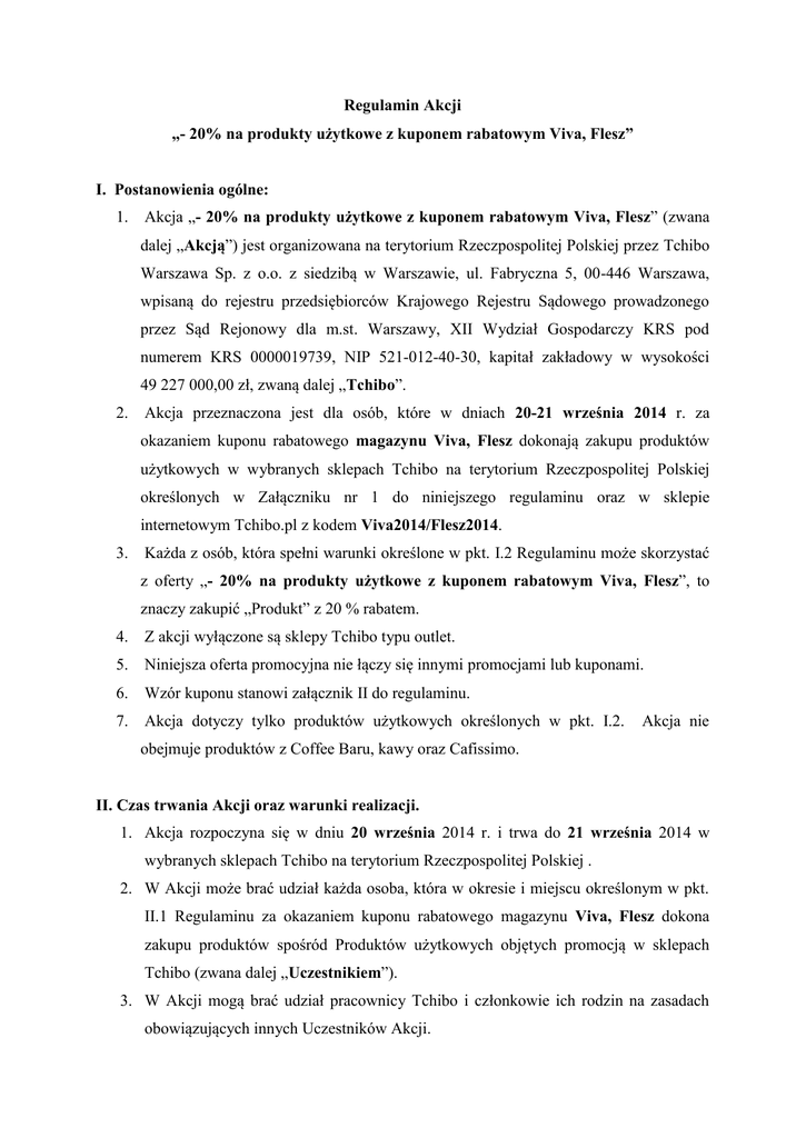Regulamin Akcji „- 20% na produkty użytkowe z kuponem rabatowym Viva, Flesz” I. Postanowienia ogólne: 1. Akcja „- 20% na produkty użytkowe z kuponem rabatowym Viva, Flesz” (zwana dalej „Akcją”) jest organizowana na terytorium Rzeczpospolitej Polskiej przez Tchibo Warszawa Sp. z o.o. z siedzibą w Warszawie, ul. Fabryczna 5, 00-446 Warszawa, wpisaną do rejestru przedsiębiorców Krajowego Rejestru Sądowego prowadzonego przez Sąd Rejonowy dla m.st. Warszawy, XII Wydział Gospodarczy KRS pod numerem KRS 0000019739, NIP 521-012-40-30, kapitał zakładowy w wysokości 49 227 000,00 zł, zwaną dalej „Tchibo”. 2. Akcja przeznaczona jest dla osób, które w dniach 20-21 września 2014 r. za okazaniem kuponu rabatowego magazynu Viva, Flesz dokonają zakupu produktów użytkowych w wybranych sklepach Tchibo na terytorium Rzeczpospolitej Polskiej określonych w Załączniku nr 1 do niniejszego regulaminu oraz w sklepie internetowym Tchibo.pl z kodem Viva2014/Flesz2014. 3. Każda z osób, która spełni warunki określone w pkt. I.2 Regulaminu może skorzystać z oferty „- 20% na produkty użytkowe z kuponem rabatowym Viva, Flesz”, to znaczy zakupić „Produkt” z 20 % rabatem. 4. Z akcji wyłączone są sklepy Tchibo typu outlet. 5. Niniejsza oferta promocyjna nie łączy się innymi promocjami lub kuponami. 6. Wzór kuponu stanowi załącznik II do regulaminu. 7. Akcja dotyczy tylko produktów użytkowych określonych w pkt. I.2. Akcja nie obejmuje produktów z Coffee Baru, kawy oraz Cafissimo. II. Czas trwania Akcji oraz warunki realizacji. 1. Akcja rozpoczyna się w dniu 20 września 2014 r. i trwa do 21 września 2014 w wybranych sklepach Tchibo na terytorium Rzeczpospolitej Polskiej . 2. W Akcji może brać udział każda osoba, która w okresie i miejscu określonym w pkt. II.1 Regulaminu za okazaniem kuponu rabatowego magazynu Viva, Flesz dokona zakupu produktów spośród Produktów użytkowych objętych promocją w sklepach Tchibo (zwana dalej „Uczestnikiem”). 3. W Akcji mogą brać udział pracownicy Tchibo i członkowie ich rodzin na zasadach obowiązujących innych Uczestników Akcji. IV. Zwroty. 1. W przypadku, gdy Uczestnik dokonuje zwrotu Produktów zakupionych na warunkach promocji „- 20% na produkty użytkowe z kuponem rabatowym Viva, Flesz”, uczestnikowi przysługuje zwrot wartości kwoty określonej na paragonie, z tym zastrzeżeniem, iż warunkiem dokonania zwrotu kwoty określonej powyżej, jest posiadanie przez Uczestnika paragonu potwierdzającego wysokość zrealizowanego transakcji. 2. Warunkiem dokonania zwrotu kwot jest posiadanie przez Uczestnika paragonu fiskalnego, potwierdzającego zakup Zestawu. V. Postępowanie reklamacyjne 1. Reklamacje związane z niniejszą Akcją mogą być składane przez Uczestnika do dnia 05.10.2014 r. włącznie (decyduje data wpływu do Tchibo). Po upływie tego terminu prawo złożenia reklamacji wygasa. 2. Reklamacja związana z niniejszą Akcją musi być złożona w formie pisemnej, po przez wypełnienie formularza reklamacyjnego w wybranych sklepach Tchibo. 3. Reklamacja powinna zawierać imię, nazwisko i adres osoby składającej reklamację i zwięzły opis przyczyn reklamacji. 4. Reklamacja zostanie rozpatrzona przez Tchibo w terminie 14 dni od jej otrzymania. Odpowiedź na reklamacje zostanie udzielona w formie pisemnej. 5. Tryb postępowania reklamacyjnego w przypadku zakupów dokonanych na Tchibo.pl opisany jest na www.tchibo.pl 6. Stanowisko Tchibo zajęte po rozpatrzeniu reklamacji będzie ostateczne. VI. Postanowienia końcowe 1. Niniejsza Akcja nie jest grą losową w rozumieniu ustawy z dnia 19 listopada 2009 r. o grach hazardowych. 2. Niniejszy Regulamin w okresie trwania Akcji dostępny jest w siedzibie Tchibo oraz w sklepach Tchibo, prowadzących Akcję. 3. Postanowienia niniejszego Regulaminu są wyłączną podstawą prowadzenia Akcji, a ich interpretacja powinna być dokonywana zgodnie z powszechnie obowiązującymi przepisami prawa. 4. Biorąc udział w Akcji Uczestnik potwierdza, iż zapoznał się z treścią niniejszego Regulaminu, zgadza się z jego warunkami oraz zobowiązuje się przestrzegać jego postanowień. Lista sklepów: Sklepy regularne: BIAŁYSTOK Centrum Handlowe Alfa, ul. Świętojańska 15; BIELSKO-BIAŁA Galeria Sfera, ul. Mostowa 5; BYDGOSZCZ Galeria Pomorska, ul. Fordońska 141, Focus Park Bydgoszcz, ul. Jagiellońska 39/47; BYTOM Plejada Bytom, ul. Jana Nowaka Jeziorańskiego 25; CZELADŹ Centrum Handlowe M1, ul. Będzińska 80; CZĘSTOCHOWA Galeria Jurajska, al. Wojska Polskiego 207 GDAŃSK Galeria Bałtycka, al. Grunwaldzka 141, Centrum Handlowe Alfa, ul. Kołobrzeska 41 C, Gdańsk City Forum ul. Podwale Grodzkie 8; GDYNIA Centrum Handlowe Batory, ul. 10 Lutego 11 Riwiera Wzgórze, ul. Kazimierza Górskiego 2 KATOWICE Centrum Handlowe Silesia City Center, ul. Chorzowska 107, Centrum Handlowe Dąbrówka, ul. Roździeńskiego 200 Galeria Katowicka, ul. 3 Maja 30 KOSZALIN Galeria EMKA, ul. Jana Pawła II 20; KRAKÓW Galeria Kazimierz, ul. Podgórska 34 Galeria Krakowska, ul. Pawia 5, Centrum Centrum Handlowe Zakopianka, ul. Zakopiańska 62, Bonarka City Center, ul. Kamieńskiego 11; LEGNICA Galeria Piastów, ul. Najświętszej Marii Panny 9 ŁÓDŹ Centrum Handlowe Port Łódź, ul. Pabianicka 245, Galeria Łódzka, al. Piłsudskiego 15/23 OLSZTYN Centrum Handlowe Alfa, al. Piłsudskiego 16; OPOLE Karolinka Opole, ul. Wrocławska 156; POZNAŃ Centrum Handlowe Malta, ul. Abpa Antoniego Baraniaka 8, Galeria Pestka, al. Solidarności 47; Kupiec Poznań, pl. Wiosny Ludów 2 RZESZÓW ul. Piłsudskiego 44, lokal 109 SŁUPSK Centrum Handlowe Jantar, ul. Szczecińska 58; SZCZECIN Kaskada, Al. Niepodległości 36 Centrum Handlowe Turzyn, al. Bohaterów Warszawy 42; TARNÓW Tarnów Gemini Park, ul. Nowodąbrowska 127 WARSZAWA Galeria Handlowa Klif, ul. Okopowa 58/72, Galeria Mokotów, ul. Wołoska 12, Sklep Tchibo, ul. Nowy Świat 54/56, Centrum Handlowe Targówek 2, u