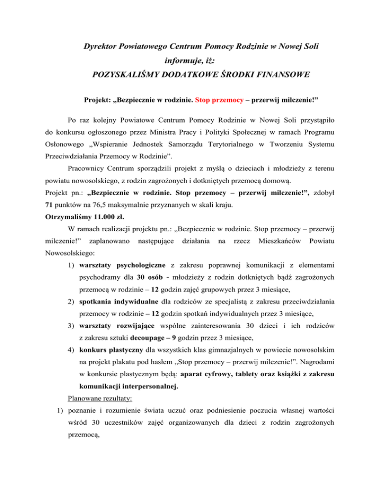 Dyrektor Powiatowego Centrum Pomocy Rodzinie w Nowej Soli informuje, iż: POZYSKALIŚMY DODATKOWE ŚRODKI FINANSOWE Projekt: „Bezpiecznie w rodzinie. Stop przemocy – przerwij milczenie!” Po raz kolejny Powiatowe Centrum Pomocy Rodzinie w Nowej Soli przystąpiło do konkursu ogłoszonego przez Ministra Pracy i Polityki Społecznej w ramach Programu Osłonowego „Wspieranie Jednostek Samorządu Terytorialnego w Tworzeniu Systemu Przeciwdziałania Przemocy w Rodzinie”. Pracownicy Centrum sporządzili projekt z myślą o dzieciach i młodzieży z terenu powiatu nowosolskiego, z rodzin zagrożonych i dotkniętych przemocą domową. Projekt pn.: „Bezpiecznie w rodzinie. Stop przemocy – przerwij milczenie!”, zdobył 71 punktów na 76,5 maksymalnie przyznanych w skali kraju. Otrzymaliśmy 11.000 zł. W ramach realizacji projektu pn.: „Bezpiecznie w rodzinie. Stop przemocy – przerwij milczenie!” zaplanowano następujące działania na rzecz Mieszkańców Powiatu Nowosolskiego: 1) warsztaty psychologiczne z zakresu poprawnej komunikacji z elementami psychodramy dla 30 osób - młodzieży z rodzin dotkniętych bądź zagrożonych przemocą w rodzinie – 12 godzin zajęć grupowych przez 3 miesiące, 2) spotkania indywidualne dla rodziców ze specjalistą z zakresu przeciwdziałania przemocy w rodzinie – 12 godzin spotkań indywidualnych przez 3 miesiące, 3) warsztaty rozwijające wspólne zainteresowania 30 dzieci i ich rodziców z zakresu sztuki decoupage – 9 godzin przez 3 miesiące, 4) konkurs plastyczny dla wszystkich klas gimnazjalnych w powiecie nowosolskim na projekt plakatu pod hasłem „Stop przemocy – przerwij milczenie!”. Nagrodami w konkursie plastycznym będą: aparat cyfrowy, tablety oraz książki z zakresu komunikacji interpersonalnej. Planowane rezultaty: 1) poznanie i rozumienie świata uczuć oraz podniesienie poczucia własnej wartości wśród 30 uczestników zajęć organizowanych dla dzieci z rodzin zagrożonych przemocą, 2) wzrost wiedzy o problemie przemocy wobec dzieci i młodzieży wśród wytypowanych 30 rodzin zagrożonych / dotkniętych przemocą, 3) przynależność do grupy rówieśniczej realizującej zainteresowania dzieci i młodzieży pod nadzorem specjalisty, 4) zwiększenie poczucia bezpieczeństwa wśród 30 dzieci i młodzieży zagrożonych przemocą domową, 5) wzrost umiejętności wychowawczych wobec dzieci w 30 rodzinach zagrożonych przemocą oraz wzmocnienie umiejętności poprawnej komunikacji w rodzinie, 6) stosowanie prawidłowych metod wychowawczych wobec 30 dzieci, 7) rozwiązywanie konfliktów w 30 rodzinach bez użycia przemocy i agresji, 8) wzmocnienie więzi wewnątrzrodzinnych. Realizacja projektu zaplanowana jest na okres sierpień – grudzień 2014 r. Rekrutacja rodzin i dzieci będzie odbywała się na poziomie gmin. Ośrodki Pomocy Społecznej z terenu powiatu nowosolskiego będą kwalifikowały chętne rodziny. Osoby zainteresowane poprawą sytuacji rodzinnej zapraszamy do współpracy. Dyrektor Powiatowego Centrum Pomocy Rodzinie w Nowej Soli Wiesława Boroch