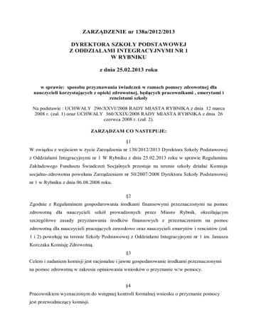 ZARZĄDZENIE nr 138a/2012/2013 DYREKTORA SZKOŁY PODSTAWOWEJ Z ODDZIAŁAMI INTEGRACYJNYMI NR 1 W RYBNIKU z dnia 25.02.2013 roku w sprawie: sposobu przyznawania świadczeń w ramach pomocy zdrowotnej dla nauczycieli korzystających z opieki zdrowotnej, będących pracownikami , emerytami i rencistami szkoły Na podstawie : UCHWAŁY 296/XXVI/2008 RADY MIASTA RYBNIKA z dnia 12 marca 2008 r. (zał. 1) oraz UCHWAŁY 360/XXIX/2008 RADY MIASTA RYBNIKA z dnia 26 czerwca 2008 r. (zał. 2). ZARZĄDZAM CO NASTEPUJE: §1 W związku z wejściem w życie Zarządzenia nr 138/2012/2013 Dyrektora Szkoły Podstawowej z Oddziałami Integracyjnymi nr 1 W Rybniku z dnia 25.02.2013 roku w sprawie Regulaminu Zakładowego Funduszu Świadczeń Socjalnych przestaje na terenie szkoły działać Komisja socjalno-zdrowotna powołana Zarządzeniem nr 50/2007/2008 Dyrektora Szkoły Podstawowej nr 1 w Rybniku z dnia 06.08.2008 roku. §2 Zgodnie z Regulaminem gospodarowania środkami finansowymi przeznaczonymi na pomoc zdrowotną dla nauczycieli szkół prowadzonych przez Miasto Rybnik, określającym szczegółowe zasady przyznawania środków finansowych z przeznaczeniem na pomoc zdrowotną dla nauczycieli pracujących zawodowo oraz nauczycieli emerytów i rencistów (zał. 1 i 2) powołuję na terenie Szkoły Podstawowej z Oddziałami Integracyjnymi nr 1 im. Janusza Korczaka Komisję Zdrowotną. §3 Celem i zadaniem komisji jest racjonalne i jawne gospodarowanie środkami przeznaczonymi na pomoc zdrowotną w zakresie opiniowania wniosków o przyznanie w/w pomocy. §4 Pracownikiem wyznaczonym do wstępnej kontroli formalnej wniosku o przyznanie pomocy jest przewodniczący komisji. §5 Ustalam następujący skład Komisji Zdrowotnej wraz z podziałem funkcji: 1. Gabriela Szweda – przewodnicząca komisji 2. Małgorzata Jędrejek – członek komisji 3. Renata Gronik – członek komisji 4. Teresa Konopka – członek komisji. §6 Zarządzenie wchodzi w życie z dniem jego podpisania. Załącznik nr 1 do Zarządzenia nr 50/2007/2008 Dyrektora Szkoły Podstawowej nr 1 w Rybniku z dnia 06 sierpnia 2008 roku UCHWAŁA 296/XXVI/2008 RADY MIASTA RYBNIKA z dnia 12 marca 2008 r. w sprawie określenia rodzaju, warunków i sposobu przyznawania świadczeń w ramach pomocy zdrowotnej dla nauczycieli korzystających z opieki zdrowotnej, będących pracownikami, emerytami i rencistami szkół, dla których organem prowadzącym jest Miasto Rybnik Na podstawie art. 18 ust. 2 pkt 15, art. 40 ust. 1, art.41 ust.1 i art.42 ustawy z dnia 8 marca 1990 r. o samorządzie gminnym (tj. Dz. U. z 2001 r., Nr 142, poz. 1591 z późn. zm.) oraz art. 72 ust. 1 w związku z art. 91 d pkt 1 ustawy z dnia 26 stycznia 1982 r. – Karta Nauczyciela (tj. Dz. U. z 2006 r. Nr 97, poz. 674 z późn. zm.) na wniosek Prezydenta Miasta Rybnika po zaopiniowaniu przez Komisję Oświaty, Kultury i Sportu oraz w uzgodnieniu z organizacjami związkowymi działającymi w jednostkach oświatowych Miasta Rybnika. Rada Miasta Rybnika uchwala: §1 Przyjmuje się regulamin gospodarowania środkami finansowymi przeznaczonymi na pomoc zdrowotną dla nauczycieli szkół prowadzonych przez Miasto Rybnik, określający szczegółowe zasady przyznawania środków finansowych z przeznaczeniem na pomoc zdrowotną dla nauczycieli pracujących zawodowo oraz nauczycieli emerytów i rencistów, stanowiący załącznik nr 1 do niniejszej uchwały. §2 Uchwała wchodzi w życie po upływie 14 dni od dnia ogłoszenia w Dzienniku Urzędowym Województwa Śląskiego. Załącznik Nr 1 do Uchwały Nr 296/XXVI/2008 Rady Miasta Rybnika z dnia 12 marca 2008 r. REGULAMIN gospodarowania środkami finansowymi przeznaczonymi na pomoc zdrowotną dla nauczycieli szkół prowadzonych przez Miasto Rybnik §1 Gospodarowanie środkami przeznaczonymi na pomoc zdrowotną 1. W celu racjonalnego i jawnego gospodarowania środkami przeznaczonymi na pomoc zdrowotną dyrektorzy szkół powołują Komisje Zdrowotne. Członkami Komisji Zdrowotnej mogą być czynni zawodowo nauczyciele pracujący w danej szkole. 2. W szkołach zatrudniających powyżej 25 nauczycieli, do Komisji Zdrowotnej poza nauczycielami czynnymi zawodowo powinien być również powołany przedstawiciel nauczycieli emerytów i rencistów. 3. Do zadań Komisji Zdrowotnej należy opiniowanie wniosków o przyznanie pomocy finansowej z środków przeznaczonych na pomoc zdrowotną. §2 Osoby uprawnione do korzystania z pomocy zdrowotnej dla nauczycieli Z pomocy zdrowotnej mogą korzystać: 1) nauczyciele zatrudnieni w szkołach prowadzonych przez Miasto Rybnik, 2) nauczyciele emeryci i nauczyciele renciści, jeżeli przed przejściem na emeryturę/rentę szkoła prowadzona przez Miasto Rybnik była ich ostatnim miejscem pracy, zwani w dalszej części uchwały „uprawnionymi”. §3 Zasady i warunki przyznawania pomocy zdrowotnej 1. Pomoc zdrowotna udzielana jest w formie jednorazowego, bezzwrotnego świadczenia pieniężnego. 2. Pomoc zdrowotna przyznawana jest w związku z: 1) przewlekłą chorobą uprawnionego, 2) długotrwałym leczeniem szpitalnym uprawnionego trwającym co najmniej 14 dni, połączonym z koniecznością dalszego przebywania na zwolnieniu lekarskim, 3) długotrwałym leczeniem specjalistycznym uprawnionego, trwającym co najmniej 30 dni. 3. Wysokość udzielanej pomocy zdrowotnej uzależnia się od: 1) przebiegu choroby oraz okoliczności z tym związanych, biorąc pod uwagę sytuację materialną uprawnionego (konieczność stosowania specjalistycznych leków, zapewnienie uprawnionemu dodatkowej opieki, itp.), 2) wysokości udokumentowanych kosztów leczenia poniesionych przez uprawnionego. 4. Warunkiem udzielenia pomocy zdrowotnej jest złożenie wniosku, którego wzór stanowi integralną część regulaminu, przez: 1) uprawnionego, 2) dyrektora szkoły, której uprawniony jest pracownikiem, emerytem lub rencistą, 3) członka rady pedagogicznej szkoły, której uprawniony jest pracownikiem, emerytem lub rencistą, 4) zw
