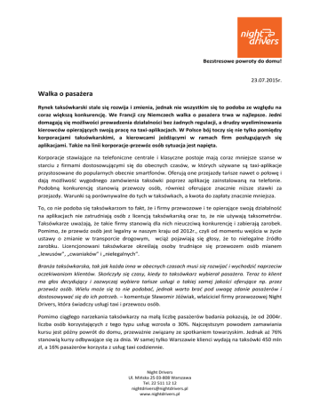 Bezstresowe powroty do domu! 23.07.2015r. Walka o pasażera Rynek taksówkarski stale się rozwija i zmienia, jednak nie wszystkim się to podoba ze względu na coraz większą konkurencję. We Francji czy Niemczech walka o pasażera trwa w najlepsze. Jedni domagają się możliwości prowadzenia działalności bez żadnych regulacji, a drudzy wyeliminowania kierowców opierających swoją pracę na taxi-aplikacjach. W Polsce bój toczy się nie tylko pomiędzy korporacjami taksówkarskimi, a kierowcami jeżdżącymi w ramach firm posługujących się aplikacjami. Także na linii korporacje-przewóz osób sytuacja jest napięta. Korporacje stawiające na telefoniczne centrale i klasyczne postoje mają coraz mniejsze szanse w starciu z firmami dostosowującymi się do obecnych czasów, w których używane są taxi-aplikacje przystosowane do popularnych obecnie smartfonów. Oferują one przejazdy tańsze nawet o połowę i dają możliwość wygodnego zamówienia taksówki poprzez aplikację zainstalowaną na telefonie. Podobną konkurencję stanowią przewozy osób, również oferujące znacznie niższe stawki za przejazdy. Warunki są porównywalne do tych w taksówkach, a kwota do zapłaty znacznie mniejsza. To, co nie podoba się taksówkarzom to fakt, że i firmy przewozowe i te opierające swoją działalność na aplikacjach nie zatrudniają osób z licencją taksówkarską oraz to, że nie używają taksometrów. Taksówkarze uważają, że takie firmy stanowią dla nich nieuczciwą konkurencję i zabierają zarobek. Pomimo, że przewóz osób jest legalny w naszym kraju od 2012r., czyli od momentu wejścia w życie ustawy o zmianie w transporcie drogowym, wciąż pojawiają się głosy, że to nielegalne źródło zarobku. Licencjonowani taksówkarze określają osoby trudniące się przewozem osób mianem „lewusów”, „cwaniaków” i „nielegalnych”. Branża taksówkarska, tak jak każda inna w obecnych czasach musi się rozwijać i wychodzić naprzeciw oczekiwaniom klientów. Skończyły się czasy, kiedy to taksówkarz wybierał pasażera. Teraz to klient ma głos decydujący i zazwyczaj wybiera tańsze usługi o takiej samej jakości oferujące np. przez przewóz osób. Wielu może się to nie podobać, jednak warto brać pod uwagę zdanie pasażerów i dostosowywać się do ich potrzeb. – komentuje Sławomir Jóźwiak, właściciel firmy przewozowej Night Drivers, która świadczy usługi taxi i przewozu osób. Pomimo ciągłego narzekania taksówkarzy na małą liczbę pasażerów badania pokazują, że od 2004r. liczba osób korzystających z tego typu usług wzrosła o 30%. Najczęstszym powodem zamawiania kursu jest późny powrót do domu, przeważnie związany ze spotkaniem towarzyskim. Jednak aż 76% stanowią kursy odbywające się za dnia. W samej tylko Warszawie klienci wydają na taksówki 450 mln zł, a 16% pasażerów korzysta z usług taxi codziennie. Night Drivers Ul. Mińska 25 03-808 Warszawa Tel. 22 511 12 12 [email protected] www.nightdrivers.pl Bezstresowe powroty do domu! Związki zawodowe taksówkarzy walczą z według nich nielegalnym przewozem organizując protesty i prowadząc negocjacje z rządem o zaostrzeniu prawa dotyczącego przewozu osób. Jednak niektórzy taksówkarze biorą sprawy w swoje ręce. Organizują akcję naklejania na szyby i karoserie samochodów przewoźników naklejek z napisem „Uwaga! Brak licencji”, których nie da się łatwo usunąć. Ponadto by narazić firmy przewozowe na straty masowo zamawiają auta, z których nie mają najmniejszego zamiaru korzystać. Niedawno pojawił się nowy, poselski projekt zmian w ustawie o transporcie drogowym. Jest szansa, że ureguluje ona ostatecznie wszystkie sporne kwestie i zakończy walkę trwającą kilka lat pomiędzy taksówkarzami, a przewoźnikami. *** Night Drivers jest firmą świadczącą profesjonalne usługi przewozowe działającą na warszawskim rynku od 2003 roku. Na początku swojej działalności firma oferowała usługi przewozu osób i odprowadzania samochodów do domu. Obecnie w swojej ofercie Night Drivers posiada usługi taxi, przewóz osób i przesyłek, odprowadzanie aut i robienie zakupów. Założyciel Night Drivers postawił sobie za cel stworzenie firmy działającej bez żadnych ograniczeń, realizującej wszelkie potrzeby klientów indywidualnych i biznesowych. Więcej informacji na stronie www.nightdrivers.pl. Night Drivers Ul. Mińska 25 03-808 Warszawa Tel. 22 511 12 12 [email protected] www.nightdrivers.pl