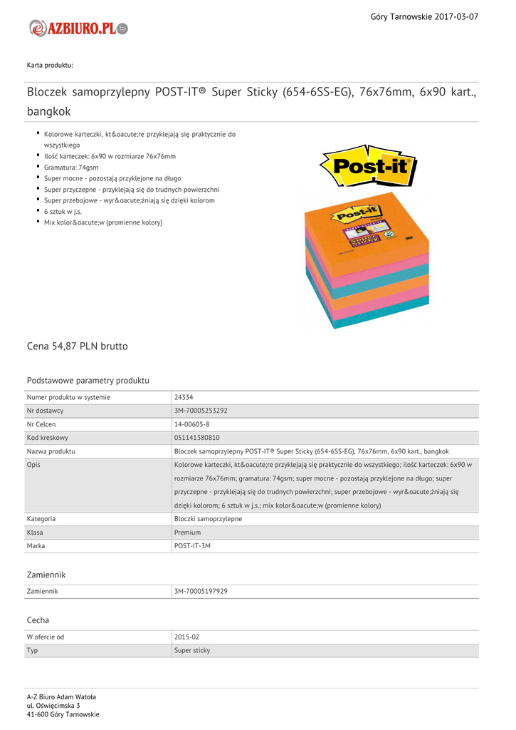 Góry Tarnowskie 2017-03-07 Karta produktu: Bloczek samoprzylepny POST-IT® Super Sticky (654-6SS-EG), 76x76mm, 6x90 kart., bangkok Kolorowe karteczki, które przyklejają się praktycznie do wszystkiego Ilość karteczek: 6x90 w rozmiarze 76x76mm Gramatura: 74gsm Super mocne - pozostają przyklejone na długo Super przyczepne - przyklejają się do trudnych powierzchni Super przebojowe - wyróżniają się dzięki kolorom 6 sztuk w j.s. Mix kolorów (promienne kolory) Cena 54,87 PLN brutto Podstawowe parametry produktu Numer produktu w systemie 24334 Nr dostawcy 3M-70005253292 Nr Celcen 14-00605-8 Kod kreskowy 051141380810 Nazwa produktu Bloczek samoprzylepny POST-IT® Super Sticky (654-6SS-EG), 76x76mm, 6x90 kart., bangkok Opis Kolorowe karteczki, które przyklejają się praktycznie do wszystkiego; ilość karteczek: 6x90 w rozmiarze 76x76mm; gramatura: 74gsm; super mocne - pozostają przyklejone na długo; super przyczepne - przyklejają się do trudnych powierzchni; super przebojowe - wyróżniają się dzięki kolorom; 6 sztuk w j.s.; mix kolorów (promienne kolory) Kategoria Bloczki samoprzylepne Klasa Premium Marka POST-IT-3M Zamiennik Zamiennik 3M-70005197929 Cecha W ofercie od 2015-02 Typ Super sticky A-Z Biuro Adam Watoła ul. Oświęcimska 3 41-600 Góry Tarnowskie Góry Tarnowskie 2017-03-07 Karta katalogowa produktu cd. Bloczek samoprzylepny POST-IT® Super Sticky (654-6SS-EG), 76x76mm, 6x90 kart., bangkok Rodzaj B.d. Produkt Bloczek Materiał Papier Kształt Standard Ilość Ilość kartek 6x90 Wymiary Gramatura (g/m2) 74 Wymiary (mm) 76x76 Wspólny słownik zamówień CPV 22816300-6 Bloczki samoprzylepnych karteczek na notatki Certyfikaty Nowy produkt w ofercie Standard Hit Standard Kolor Kolor Serdecznie zapraszamy do współpracy A-Z Biuro Adam Watoła zespół. A-Z Biuro Adam Watoła ul. Oświęcimska 3 41-600 Góry Tarnowskie Mix kolorów