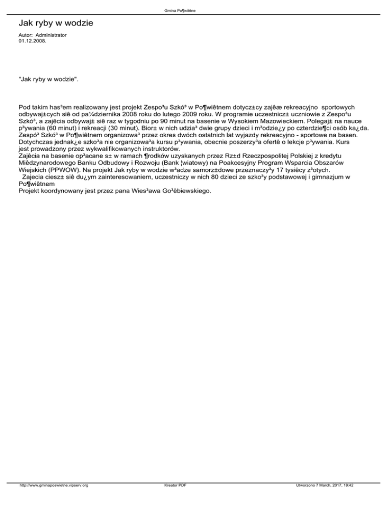Gmina Po¶wiêtne Jak ryby w wodzie Autor: Administrator 01.12.2008. "Jak ryby w wodzie". Pod takim has³em realizowany jest projekt Zespo³u Szkó³ w Po¶wiêtnem dotycz±cy zajêæ rekreacyjno sportowych odbywaj±cych siê od pa¼dziernika 2008 roku do lutego 2009 roku. W programie uczestnicz± uczniowie z Zespo³u Szkó³, a zajêcia odbywaj± siê raz w tygodniu po 90 minut na basenie w Wysokiem Mazowieckiem. Polegaj± na nauce p³ywania (60 minut) i rekreacji (30 minut). Bior± w nich udzia³ dwie grupy dzieci i m³odzie¿y po czterdzie¶ci osób ka¿da. Zespó³ Szkó³ w Po¶wiêtnem organizowa³ przez okres dwóch ostatnich lat wyjazdy rekreacyjno - sportowe na basen. Dotychczas jednak¿e szko³a nie organizowa³a kursu p³ywania, obecnie poszerzy³a ofertê o lekcje p³ywania. Kurs jest prowadzony przez wykwalifikowanych instruktorów. Zajêcia na basenie op³acane s± w ramach ¶rodków uzyskanych przez Rz±d Rzeczpospolitej Polskiej z kredytu Miêdzynarodowego Banku Odbudowy i Rozwoju (Bank ¦wiatowy) na Poakcesyjny Program Wsparcia Obszarów Wiejskich (PPWOW). Na projekt Jak ryby w wodzie w³adze samorz±dowe przeznaczy³y 17 tysiêcy z³otych. Zajecia ciesz± siê du¿ym zainteresowaniem, uczestniczy w nich 80 dzieci ze szko³y podstawowej i gimnazjum w Po¶wiêtnem Projekt koordynowany jest przez pana Wies³awa Go³êbiewskiego. http://www.gminaposwietne.vipserv.org Kreator PDF Utworzono 7 March, 2017, 19:42