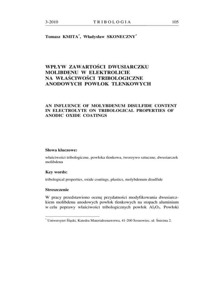 3-2010 TRIBOLOGIA 105 Tomasz KMITA*, Władysław SKONECZNY* WPŁYW ZAWARTOŚCI DWUSIARCZKU MOLIBDENU W ELEKTROLICIE NA WŁAŚCIWOŚCI TRIBOLOGICZNE ANODOWYCH POWŁOK TLENKOWYCH AN INFLUENCE OF MOLYBDENUM DISULFIDE CONTENT IN ELECTROLYTE ON TRIBOLOGICAL PROPERTIES OF ANODIC OXIDE COATINGS Słowa kluczowe: właściwości tribologiczne, powłoka tlenkowa, tworzywo sztuczne, dwusiarczek molibdenu Key words: tribological properties, oxide coatings, plastics, molybdenum disulfide Streszczenie W pracy przedstawiono ocenę przydatności modyfikowania dwusiarczkiem molibdenu anodowych powłok tlenkowych na stopach aluminium w celu poprawy właściwości tribologicznych powłok Al2O3. Powłoki * Uniwersytet Śląski, Katedra Materiałoznawstwa, 41-200 Sosnowiec, ul. Śnieżna 2. 106 TRIBOLOGIA 3-2010 tlenkowe wytwarzano metodą anodowania twardego na stopie aluminium EN AW-5251 w elektrolicie wieloskładnikowym modyfikowanym dwusiarczkiem molibdenu w postaci proszku o ziarnach poniżej 20 mikrometrów, stosując różne stężenia MoS2 w elektrolicie (0 do 80 g/l). Badania tribologiczne anodowych powłok tlenkowych modyfikowanych MoS2 prowadzono w niesmarowanym skojarzeniu ślizgowym z tworzywem polimerowym PEEK/BG na stanowisku badawczym T-17, w ruchu posuwisto-zwrotnym, w warunkach symulujących współpracę tłok– –uszczelnienie siłowników pneumatycznych bezsmarowych. Uzyskane wyniki badań wskazują na istotne obniżenie współczynnika tarcia skojarzenia ślizgowego tworzywo PEEK/BG–anodowa powłoka tlenkowa oraz obniżenie zużycia polimerowego tribopartnera w wyniku zastosowania modyfikacji powłoki tlenkowej poprzez MoS2, w szczególności przy zastosowaniu 60 g/l proszku dwusiarczku w elektrolicie. Efektem modyfikacji powłok Al2O3 dwusiarczkiem molibdenu jest również znaczne skrócenie czasu docierania badanego skojarzenia. WPROWADZENIE Jednym ze stosowanych rozwiązań wzrostu trwałości eksploatacyjnej w węzłach kinematycznych maszyn bezsmarowych jest zastosowanie par ślizgowych polimer–anodowa powłoka tlenkowa na aluminium [L. 1–2]. Zaletą tego rozwiązania jest łatwość nanoszenia polimerowego filmu ślizgowego na powierzchnie porowatej powłoki tlenkowej (APT), a w rezultacie korzystna zmiana warunków współpracy tribologicznej (zmiana charakteru współpracy miękkie tworzywo sztuczne – anodowa powłoka tlenkowa, na tarcie między jednakowymi materiałami, tj. miękkim po miękkim) [L. 3–5]. Poprawę właściwości tribologicznych ww. skojarzenia można uzyskać poprzez optymalizację warunków wytwarzania anodowych powłok tlenkowych (zmiana składu i temperatury elektrolitu, parametrów prądowo-napięciowych procesu elektrolitycznego) bądź poprzez modyfikacje tworzyw polimerowych – zastosowanie smarów stałych jako napełniaczy (np. grafit, MoS2, PTFE) [L. 6–7]. W przypadku skojarzeń ślizgowych bezsmarowych polimer–APT korzystniej byłoby modyfikować smarem stałym powłokę tlenkową, poprzez wprowadzanie w jej pory fazy obniżającej współczynnik tarcia. Powłoki tlenkowe uszlachetniane obecnością na ich powierzchni lub w strukturze smarów stałych wykorzystywane 3-2010 TRIBOLOGIA 107 były dotychczas głównie w skojarzeniach z metalami [L. 8–11]. W prezentowanej pracy autorzy przedstawiają natomiast próbę zastosowania skojarzenia tworzywo polimerowe–modyfikowana dwusiarczkiem molibdenu anodowa powłoka tlenkowa we współpracy ślizgowej. Głównym celem prezentowanych badań było określenie najkorzystniejszych warunków procesu wytwarzania (stężanie dwusiarczku molibdenu w elektrolicie) modyfikowanej dwusiarczkiem molibdenu „metodą bezpośrednią” anodowej powłoki tlenkowej. METODYKA BADAŃ Badania tribologiczne realizowano na stanowisku badawczym T-17, w skojarzeniu ślizgowym bezsmarowym trzpień–płytka w ruchu posuwisto zwrotnym (Rys. 1). Trzpień o średnicy 9 mm stanowiło niskościeralne tworzywo PEEK/BG (polieteroeteroketon z napełniaczami w postaci grafitu, drobin PTFE oraz włókien węglowych). Przeciwpróbką w badaniach tribologicznych były anodowe powłoki tlenkowe wytworzone metodą anodowania twardego na stopie aluminium EN AW-5251 w elektrolicie wieloskładnikowym z dodatkami 0÷80 g/l proszku dwusiarczku molibdenu firmy Sigma–Aldrich o ziarnach poniżej 20 mikrometrów (Tab. 1). Rys. 1. Skojarzenie tworzywo PEEK/BG–anodowa powłoka tlenkowa na stopie aluminium EN AW-5251 Fig. 1. A couple: PEEK/BG–anodic oxide coating on the EN AW-5251 aluminium alloy Badania tribologiczne przeprowadzono w warunkach odpowiadających pracy siłowników pneumatycznych bezsmarowych – przy naciskach jednostkowych 1 MPa oraz przy prędkości ślizgania 0,2 m/s w temperaturze 292 ±1 K i wilgotności względnej powietrza 30 ±5%. Zastosowano 108 TRIBOLOGIA 3-2010 ruch posuwisto-zwrotny o amplitudzie 8 cm, z częstotliwością 2,5 Hz. Badania tribologiczne (docieranie + testy zasadnicze) realizowano na łącznej drodze tarcia 20 km. Podczas testów dokonywano ciągłych pomiarów siły tarcia przetwornikiem analogowo-cyfrowym Spiker 8 dokonując akwizycji danych za pomocą programu Catman 4.5. Pomiar siły tarcia realizowano z częstotliwością 50 Hz. Ze względu na charakter ruchu i ilość danych pomiarowych dokonano wstępnej obróbki wyników siły tarcia poprzez wyznaczenie jej wartości bezwzględnej, a następnie średniej ich wartości z następujących po sobie kolejnych 60 s testu. Zużycie masy tworzywa PEEK/BG pomiędzy poszczególnymi etapami badań dokonywano za pomocą wagi analitycznej WA-35. Uzupełnieniem badań tribologicznych były badania chropowatości powierzchni APT przeprowadzone przed i po teście tarciowo-zużyciowym metodą profilografii stykowej, przy użyciu profilografometru Form Talysurf Series 2. Tabela 1. Parametry procesu anodowania twardego stopu EN AW-5251 Table 1. Parameters of hard anodizing of the EN AW-5251 alloy Nr 1 2 3 4 5 Anodowa gęstość prądowa [A/dm2] 3 3 