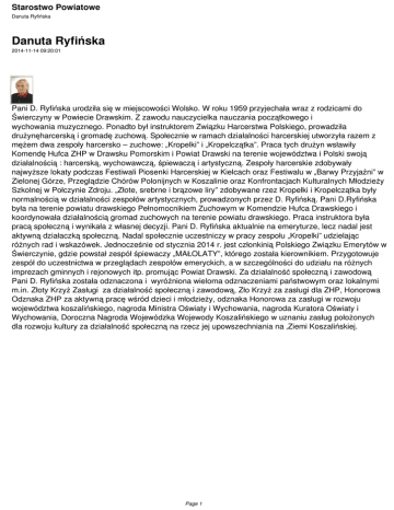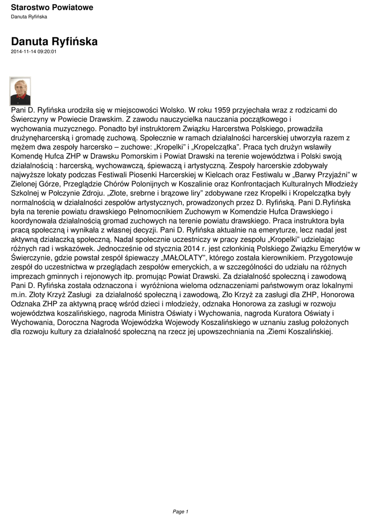 Starostwo Powiatowe Danuta Ryfińska Danuta Ryfińska 2014-11-14 09:20:01 Pani D. Ryfińska urodziła się w miejscowości Wolsko. W roku 1959 przyjechała wraz z rodzicami do Świerczyny w Powiecie Drawskim. Z zawodu nauczycielka nauczania początkowego i wychowania muzycznego. Ponadto był instruktorem Związku Harcerstwa Polskiego, prowadziła drużynęharcerską i gromadę zuchową. Społecznie w ramach działalności harcerskiej utworzyła razem z mężem dwa zespoły harcersko – zuchowe: „Kropelki” i „Kropelczątka”. Praca tych drużyn wsławiły Komendę Hufca ZHP w Drawsku Pomorskim i Powiat Drawski na terenie województwa i Polski swoją działalnością : harcerską, wychowawczą, śpiewaczą i artystyczną. Zespoły harcerskie zdobywały najwyższe lokaty podczas Festiwali Piosenki Harcerskiej w Kielcach oraz Festiwalu w „Barwy Przyjaźni” w Zielonej Górze, Przeglądzie Chórów Polonijnych w Koszalinie oraz Konfrontacjach Kulturalnych Młodzieży Szkolnej w Połczynie Zdroju. „Złote, srebrne i brązowe liry” zdobywane rzez Kropelki i Kropelczątka były normalnością w działalności zespołów artystycznych, prowadzonych przez D. Ryfińską. Pani D.Ryfińska była na terenie powiatu drawskiego Pełnomocnikiem Zuchowym w Komendzie Hufca Drawskiego i koordynowała działalnością gromad zuchowych na terenie powiatu drawskiego. Praca instruktora była pracą społeczną i wynikała z własnej decyzji. Pani D. Ryfińska aktualnie na emeryturze, lecz nadal jest aktywną działaczką społeczną. Nadal społecznie uczestniczy w pracy zespołu „Kropelki” udzielając różnych rad i wskazówek. Jednocześnie od stycznia 2014 r. jest członkinią Polskiego Związku Emerytów w Świerczynie, gdzie powstał zespół śpiewaczy „MAŁOLATY”, którego została kierownikiem. Przygotowuje zespół do uczestnictwa w przeglądach zespołów emeryckich, a w szczególności do udziału na różnych imprezach gminnych i rejonowych itp. promując Powiat Drawski. Za działalność społeczną i zawodową Pani D. Ryfińska została odznaczona i wyróżniona wieloma odznaczeniami państwowym oraz lokalnymi m.in. Złoty Krzyż Zasługi za działalność społeczną i zawodową, Zło Krzyż za zasługi dla ZHP, Honorowa Odznaka ZHP za aktywną pracę wśród dzieci i młodzieży, odznaka Honorowa za zasługi w rozwoju województwa koszalińskiego, nagroda Ministra Oświaty i Wychowania, nagroda Kuratora Oświaty i Wychowania, Doroczna Nagroda Wojewódzka Wojewody Koszalińskiego w uznaniu zasług położonych dla rozwoju kultury za działalność społeczną na rzecz jej upowszechniania na ‚Ziemi Koszalińskiej. Page 1