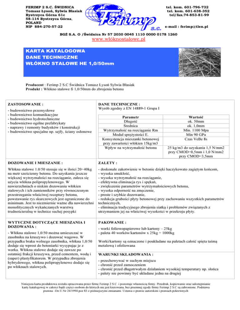 FERIMP 2 S.C. ŚWIDNICA Tomasz Łysoń, Sylwia Błasiak Bystrzyca Górna 61c 58-114 Bystrzyca Górna, POLAND NIP 884-270-57-22 tel. kom. 601-796-732 tel. kom. 601-638-352 tel/fax.74-853-81-99 e-mail : [email protected] BGŻ S.A. O /Świdnica Nr 57 2030 0045 1110 0000 0178 1260 www.włóknostalowe.pl KARTA KATALOGOWA DANE TECHNICZNE WŁÓKNO STALOWE HE 1,0/50mm Producent : Ferimp 2 S.C Świdnica Tomasz Łysoń Sylwia Błasiak Produkt : Włókno stalowe fi 1,0/50mm do zbrojenia betonu ZASTOSOWANIE : - budownictwo przemysłowe - budownictwo komunikacyjne - budownictwo hydrotechniczne - budownictwo ogólne prefabrykaty - naprawy i remonty budynków i konstrukcji - budownictwo specjalne np. sejfy, ściany osłonowe DANE TECHNICZNE : Wyrób zgodny z EN 14889-1 Grupa I Parametr Długość Średnica Wytrzymałość na rozciąganie Rm Moduł sprężystości E. Konsystencja mieszanki betonowej przy zawartości włókien 15kg/m3 Wpływ na wytrzymałość betonu Wartość ok. 50mm ok. 1,0mm Min. 1100 Mpa Min 90 GPa Czas VeBe 8s 25 kg/m3 do uzyskania 1,5 N/mm2 przy CMOD=0,5mm i 1,0 N/mm2 przy CMOD=3,5mm DOZOWANIE I MIESZANIE : ZALETY : Włókna stalowe 1.0/50 stosuje się w ilości 20÷40kg na metr sześcienny betonu. Do uzyskania jeszcze większej wytrzymałości na rozciąganie, zaleca się użycia włókna polipropylenowego. W nawierzchniach o niskim dozowaniu włókien stalowych i ich zamienników przy równoczesnym przestrzeganiu właściwej receptury betonu, powstawanie rys skurczowych jest ograniczone do minimum. Jest to niezmiernie ważne dla nawierzchni monolitycznych wykańczanych warstwą trudnościeralną w technice suchej posypki - doskonałe zakotwienie w betonie dzięki haczykowato zagiętym końcom, - wysoka smukłość, - wysoka wytrzymałość na rozciąganie, - efektywna eliminacja rys i spękań, - zwiększenie parametrów wytrzymałościowych betonu, - wysoka odporność na zmęczenie, - proste i szybkie dozowanie, - redukcja grubości płyty betonowej przy zachowaniu wszystkich parametrów technicznych, - eliminacja tradycyjnego zbrojenia siatką i problemów związanych z utrzymaniem jej na właściwej wysokości w przekroju płyty. WYTYCZNE DOTYCZĄCE MIESZANIA I DOZOWANIA : PAKOWANIE : - Włókna stalowe 1,0/50 można umieszczać w zasobniku na kruszywo i dozować wagowo. W przypadku braku wolnego zasobnika, włókna 1,0/50 dodaje się wprost do betoniarki wysypując je z worka. Włókna stalowe dodaje się zawsze po ostatniej frakcji kruszywa, przed cementem, wodą i (super) plastyfikatorem. W przypadku zbrojenia hybrydowego, włókna polipropylenowe dodaje się po włóknach stalowych. - worki foliowopapierowe lub kartony – 25kg - paleta 40 worków/kartonów x 25kg = 1000kg Worki/kartony są oznaczone i poukładane na paletach całość spięta taśmą metalową i ofoliowana WARUNKI SKŁADOWANIA : - przechowywać w suchym miejscu - chronić przed zamoczeniem - chronić przed długotrwałym działaniem wysokiej temperatury np. słońca - palety nie powinny być układane jedna na drugiej Niniejsza karta produktowa została opracowana przez firmę Ferimp 2 S.C. i pozostaje własnością firmy. Przedruk, kopiowanie oraz udostępnianie karty katalogowej w całości bądź części osobom do których nie jest kierowana, bez pisemnej zgody firmy Ferimp 2 S.C są zabronione. Podstawa prawna –Dz.U.Nr 24/1994 poz 83 z późniejszymi zmianami. Ustawa o prawie autorskim i prawach pokrewnych
