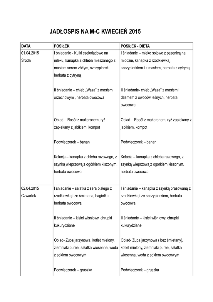 JADŁOSPIS NA M-C KWIECIEŃ 2015 DATA POSIŁEK POSIŁEK - DIETA 01.04.2015 I śniadanie - Kulki czekoladowe na I śniadanie – mleko sojowe z pszenicą na Środa mleku, kanapka z chleba mieszanego z miodzie, kanapka z rzodkiewką, masłem serem żółtym, szczypiorek, szczypiorkiem i z masłem, herbata z cytryną herbata z cytryną II śniadanie – chleb „Waza” z masłem II śniadanie- chleb „Waza” z masłem i orzechowym , herbata owocowa dżemem z owoców leśnych, herbata owocowa Obiad – Rosół z makaronem, ryż Obiad – Rosół z makaronem, ryż zapiekany z zapiekany z jabłkiem, kompot jabłkiem, kompot Podwieczorek – banan Podwieczorek – banan Kolacja – kanapka z chleba razowego, z Kolacja – kanapka z chleba razowego, z szynką wieprzową z ogórkiem kiszonym, szynką wieprzową z ogórkiem kiszonym, herbata owocowa herbata owocowa 02.04.2015 I śniadanie – sałatka z sera białego z I śniadanie – kanapka z szynką prasowaną z Czwartek rzodkiewką i ze śmietaną, bagietka, rzodkiewką i ze szczypiorkiem, herbata herbata owocowa owocowa II śniadanie – kisiel wiśniowy, chrupki II śniadanie – kisiel wiśniowy, chrupki kukurydziane kukurydziane Obiad- Zupa jarzynowa, kotlet mielony, Obiad- Zupa jarzynowa ( bez śmietany), ziemniaki puree, sałatka wiosenna, woda kotlet mielony, ziemniaki puree, sałatka z sokiem owocowym wiosenna, woda z sokiem owocowym Podwieczorek – gruszka Podwieczorek – gruszka Kolacja – babka piaskowa, mięta Kolacja – babka piaskowa, mięta 03.04.2015 I śniadanie – kanapka z chleba razowego I śniadanie – kanapka z chleba razowego z Piątek z masłem i z ogórkiem świeżym, ze masłem i z ogórkiem świeżym, ze szczypiorkiem, bawarka szczypiorkiem, herbata owocowa II śniadanie – budyń malinowy z sokiem II śniadanie – deser sojowy z sokiem Obiad – Zupa brokułowa, filet rybny na Obiad – Zupa brokułowa, filet rybny na szpinaku, ryż, kompot szpinaku, ryż, kompot Podwieczorek – sałatka owocowa Podwieczorek – sałatka owocowa Kolacja – bagietka z szynką konserwową Kolacja – bagietka z szynką konserwową z z ogórkiem świeżym i z pomidorem ogórkiem świeżym i z pomidorem 04.04.2015 I śniadanie – kanapka z chleba I śniadanie – kanapka z chleba pszennego z Sobota pszennego z pastą rybną, herbata z pastą rybną, herbata z cytryną cytryną II śniadanie – wafelki śmietankowe, II śniadanie – wafelki śmietankowe, herbata herbata owocowa owocowa Obiad – zupa koperkowa, racuchy z Obiad – zupa koperkowa ( bez śmietany), jabłkami, kompot owocowy racuchy z jabłkami, kompot owocowy Podwieczorek – jogurt owocowy Podwieczorek – deser sojowy 07.04.2015 I śniadanie – Pszenica na miodzie z I śniadanie - kanapka z masłem i z szynką Wtorek mlekiem, kanapka z masłem i z szynką wieprzową, z pomidorem, herbata owocowa wieprzową, z pomidorem, herbata owocowa II śniadanie – wafle ryżowe z nutellą, II śniadanie – wafle ryżowe z masłem i napój owocowy dżemem, napój owocowy Obiad – Żurek, potrawka z kurczaka, Obiad – Żurek ( bez śmietany), potrawka z kasza jęczmienna, marchew z jabłkiem, kurczaka, kasza jęczmienna, marchew z woda z sokiem jabłkiem, woda z sokiem Podwieczorek – kiwi Podwieczorek – kiwi Kolacja – bagietka z serkiem topionym i Kolacja – bagietka z masłem i ze ze szczypiorkiem, mięta szczypiorkiem, mięta 08.04.2015 I śniadanie – Parówka cielęca, kanapka z I śniadanie – Parówka cielęca, kanapka z Środa masłem, herbata z cytryną masłem, herbata z cytryną II śniadanie – galaretka owocowa II śniadanie – galaretka owocowa Obiad – zupa pomidorowa z ryżem, pierś Obiad – zupa pomidorowa z ryżem (bez panierowana z kurczaka, ziemniaki śmietany), pierś panierowana z kurczaka, puree, buraczki, woda z sokiem ziemniaki puree, buraczki, woda z sokiem owocowym owocowym Podwieczorek – jabłko Podwieczorek – jabłko Kolacja – kanapka z chleba razowego z Kolacja – kanapka z chleba razowego z masłem i z miodem, herbata z cytryną masłem i z miodem, herbata z cytryną 09.04.2015 I śniadanie – kanapka z szynką I śniadanie – kanapka z szynką drobiową, z Czwartek drobiową, z pomidorem i szczypiorkiem, pomidorem i szczypiorkiem, herbata z bawarka cytryną II śniadanie – budyń czekoladowy II śniadanie – deser sojowy waniliowy Obiad – Krem warzywny, placki Obiad – Krem warzywny, placki ziemniaczane ze śmietaną, kompot ziemniaczane , kompot Podwieczorek – pomarańcza Podwieczorek – pomarańcza Kolacja - bułka słodka, herbata z cytryną Kolacja - bułka słodka, herbata z cytryną 10.04.2015 I śniadanie – bagietka z masłem i z I śniadanie – bagietka z masłem i z dżemem Piątek nutellą, bawarka morelowym, herbata z cytryną II śniadanie – kisiel z jabłkiem II śniadanie – kisiel z jabłkiem Obiad – Krupnik, ryba po grecku, ryż, Obiad – Krupnik, ryba po grecku, ryż, woda z woda z sokiem owocowym sokiem owocowym Podwieczorek – gruszka Podwieczorek – gruszka Kolacja – kanapka z masłem , z szynką Kolacja – kanapka z masłem , z szynką wieprzową, pomidorem, szczypiorkiem i z wieprzową, pomidorem, szczypiorkiem i z rzodkiewką, herbata z cytryną rzodkiewką, herbata z cytryną 11.04.2015 I śniadanie – bułka z masłem z polędwicą I śniadanie – bułka z masłem z polędwicą Sobota drobiową z rzodkiewką i ze drobiową z rzodkiewką i ze szczypiorkiem szczypiorkiem II śniadanie – sok „Kubuś”, herbatniki II śniadanie – sok „Kubuś”, herbatniki maślane maślane Obiad – zupa jarzynowa, kluski śląskie z Obiad – zupa jarzynowa ( bez sosem warzywnym, kompot śmietany),kluski śląskie z sosem warzywnym, kompot Podwieczorek - banan Podwieczorek - banan 13.04.2015 I śniadanie – parówka z szynki, kanapka I śniadanie – parówka z szynki, kanapka z Poniedziałek z masłem, herbata z cytryną masłem, herbata z cytryną II śniadanie – de