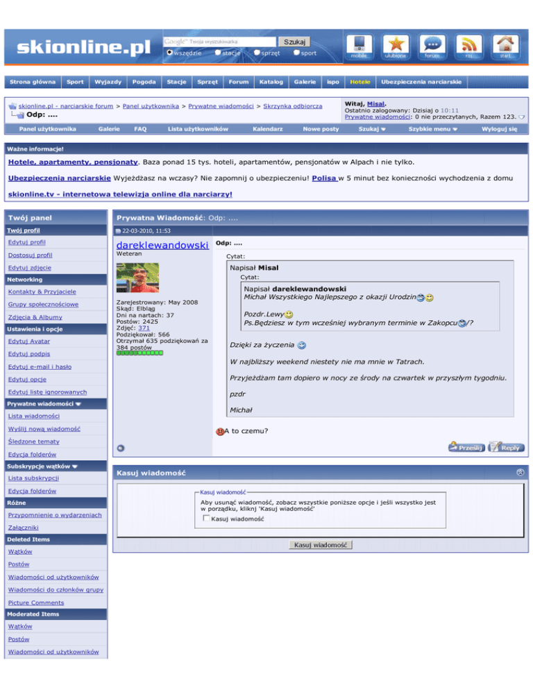 wszędzie Strona główna Sport Wyjazdy Pogoda Stacje stacje Sprzęt sprzęt Forum Katalog sport Galerie ispo skionline.pl - narciarskie forum > Panel uŜytkownika > Prywatne wiadomości > Skrzynka odbiorcza Odp: .... Panel uŜytkownika Galerie FAQ Lista uŜytkowników Kalendarz Nowe posty Hotele Ubezpieczenia narciarskie Witaj, Misal. Ostatnio zalogowany: Dzisiaj o 10:11 Prywatne wiadomości: 0 nie przeczytanych, Razem 123. Szukaj Szybkie menu Wyloguj się WaŜne informacje! Hotele, apartamenty, pensjonaty. Baza ponad 15 tys. hoteli, apartamentów, pensjonatów w Alpach i nie tylko. Ubezpieczenia narciarskie WyjeŜdŜasz na wczasy? Nie zapomnij o ubezpieczeniu! Polisa w 5 minut bez konieczności wychodzenia z domu skionline.tv - internetowa telewizja online dla narciarzy! Twój panel Twój profil Prywatna Wiadomość: Odp: .... 22-03-2010, 11:53 Edytuj profil dareklewandowski Dostosuj profil Weteran Cytat: Napisał Misal Edytuj zdjęcie Cytat: Networking Kontakty & Przyjaciele Grupy społecznościowe Zdjęcia & Albumy Ustawienia i opcje Edytuj Avatar Odp: .... Zarejestrowany: May 2008 Skąd: Elbląg Dni na nartach: 37 Postów: 2425 Zdjęć: 371 Podziękował: 566 Otrzymał 635 podziękowań za 384 postów Napisał dareklewandowski Michał Wszystkiego Najlepszego z okazji Urodzin Pozdr.Lewy Ps.Będziesz w tym wcześniej wybranym terminie w Zakopcu /? Dzięki za Ŝyczenia Edytuj podpis W najbliŜszy weekend niestety nie ma mnie w Tatrach. Edytuj e-mail i hasło Edytuj opcje PrzyjeŜdŜam tam dopiero w nocy ze środy na czwartek w przyszłym tygodniu. Edytuj listę ignorowanych pzdr Prywatne wiadomości Michał Lista wiadomości Wyślij nową wiadomość A to czemu? Śledzone tematy Edycja folderów Subskrypcje wątków Lista subskrypcji Kasuj wiadomość Edycja folderów Kasuj wiadomość RóŜne Aby usunąć wiadomość, zobacz wszystkie poniŜsze opcje i jeśli wszystko jest w porządku, kliknj 'Kasuj wiadomość' Przypomnienie o wydarzeniach Załączniki Deleted Items Wątków Postów Wiadomości od uŜytkowników Wiadomości do członków grupy Picture Comments Moderated Items Wątków Postów Wiadomości od uŜytkowników Kasuj wiadomość Wiadomości do członków grupy Picture Comments Album Pictures Czasy w strefie GMT +2. Teraz jest 11:30. Kontakt - skionline.pl - Archive - Na górę Forum wykorzystuje silnik vBulletin Version 3.7.0 Copyright ©2000 - 2010, Jelsoft Enterprises Ltd. skionline.pl