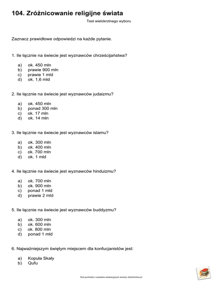 104. Zróżnicowanie religijne świata Test wielokrotnego wyboru Zaznacz prawidłowe odpowiedzi na każde pytanie. 1. Ile łącznie na świecie jest wyznawców chrześcijaństwa? a) b) c) d) ok. 450 mln prawie 900 mln prawie 1 mld ok. 1,6 mld 2. Ile łącznie na świecie jest wyznawców judaizmu? a) b) c) d) ok. 450 mln ponad 300 mln ok. 17 mln ok. 14 mln 3. Ile łącznie na świecie jest wyznawców islamu? a) b) c) d) ok. 300 mln ok. 400 mln ok. 700 mln ok. 1 mld 4. Ile łącznie na świecie jest wyznawców hinduizmu? a) b) c) d) ok. 700 mln ok. 900 mln ponad 1 mld prawie 2 mld 5. Ile łącznie na świecie jest wyznawców buddyzmu? a) b) c) d) ok. 300 mln ok. 600 mln ok. 800 mln ponad 1 mld 6. Najważniejszym świętym miejscem dla konfucjanistów jest: a) b) Kopuła Skały Qufu Test pochodzi z zasobów edukacyjnych serwisu Szkolnictwo.pl c) d) Lhasie Warasani 7. Jak się nazywają święte księgi islamu? a) b) c) d) ?Dżihad? ?Koran? ?Wedy? ?Tora? 8. ?Talmud?: a) b) c) d) to ?Święta Księga? islamu zawiera reguły postępowania i wiary islamu zalicza się do świętych ksiąg judaizmu to księga islamu zawierająca prawdy świata 9. Papieża uznaje: a) b) c) d) judaizm chrześcijaństwo prawosławie protestantyzm 10. W jakich państwach wyznawcami wiary są głównie protestanci? a) b) c) d) w Holandii w Finlandii we Włoszech w Norwegii 11. Islam wyznaje się głównie w: a) b) c) d) Iranie Turcji Nepalu Pakistanie 12. Konfucjanizm: a) b) c) d) jest religią monoteistyczną, a zarazem politeistyczną opiera się na zasadach zależności między ludźmi opiera się na pięciu filarach opiera się na tolerancji i szacunku, które łączą i spajają ludzi 13. Buddyzm: Test pochodzi z zasobów edukacyjnych serwisu Szkolnictwo.pl a) b) c) d) został zapoczątkowany przez Dalajlamę został zapoczątkowany przez Siddhartha Gautamę został zapoczątkowany przez Buddę jest także filozofią 14. Głównymi bogami hinduizmu są: a) b) c) d) Kriszna Budda Dalajlama Hary Rama 15. Rzeka Ganges: a) b) c) d) przepływa przez święte miasto hinduizmu na Sri Lance jest świętą rzeką buddyzmu jest świętą rzeką hinduizmu symbolizuje życie i odrodzenie 16. Islam: a) b) c) d) opiera się na zasadach zawartych w ?Koranie? posiada reguły ułożone w pięć filarów posiada jednego boga ? Allaha jest religią uniwersalistyczną 17. Religia uniwersalistyczna: a) b) c) d) ma duży wpływ na politykę to np. judaizm to np. islam jest z reguły wyznawana przez całą społeczność danego państwa 18. Jaki procent ludności świata jest ateistami lub wyznaje religie plemienne? a) b) c) d) 9% 12% 18% 24% 19. Szabat: a) b) c) d) jest obchodzony w piątek jest obchodzony w sobotę jest obchodzony w niedzielę jest świętym dniem wyznawców judaizmu Test pochodzi z zasobów edukacyjnych serwisu Szkolnictwo.pl 20. Chrześcijaństwo: a) b) c) d) wyłoniło się z judaizmu powstało w I w. p.n.e. jest największą monoteistyczną wiarą na świecie wyznaje się w Polsce 21. Doktryna to: a) b) c) d) reguły postępowania i wiary dla wyznawców danej religii poglądy wyjaśniające pochodzenie bóstwa poglądy wyjaśniające pochodzenie człowieka obrzędy, ofiary, modlitwy itp. 22. Wyznawcy judaizmu podzielili ?Stary Testament? na: a) b) c) d) trzy części dwie części Torę, Księgi Proroków i Święte Księgi Prawo Mojżeszowe, Torę, Święte Księgi Proroków i Święte Księgi Pisma Test pochodzi z zasobów edukacyjnych serwisu Szkolnictwo.pl