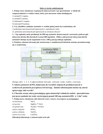 Sole w życiu codziennym 1. Podaj wzory chemiczne wypisanych niżej nawozów i po sprawdzeniu w tabeli ich rozpuszczalności w wodzie wskaż, który jest nawozem wolno działającym: 1) azotan(V) wapnia, 2) azotan(V) amonu, 3) fosforan(V) wapnia, 4) siarczan(VI) potasu. 2. Czy szkodliwy nadmiar azotanów w wodzie pitnej może być uzależniony od: 1) położenia nawożonych pól uprawnych w sąsiedztwie rzeki; 2) położenia nawożonych pól uprawnych na stromym zboczu? 3. 1 kg szpinaku może pochłonąć do 900 mg azotanów dostarczanych nawozach, podczas gdy toksyczna dawka dla dorosłych wynosi 600 mg/dzień. Oblicz, jaki procent toksycznej dawki azotanów dostaje się do organizmu wraz z 200 g porcją takiego szpinaku. 4. Poniższy schemat obrazuje jak zastosowane w nadmiernych ilościach azotany przemieszczają się w środowisku. Zastąp cyfry: 1, 2, 3, 4 odpowiednimi słowami: człowiek, woda, rośliny, zwierzęta. 5. Saletra potasowa KNO3 dodawana do wyrobów mięsnych produkowanych w cynkowych puszkach przyspiesza ich korozję. Jakimi substancjami można się zatruć spożywając taki wyrób? 6. Choroba zwana sinicą powodującą zgon niemowląt i młodych ssaków spowodowana jest przez podanie im wody zawierającej ponad 100 mg azotanów(III) w 1 dm3 wody. 7. Podaj nazwy chemiczne soli, których wzory i nazwy zwyczajowe są następujące: sól kuchenna NaCl, sól gorzka MgSO4 *7 H2O, sól glauberska Na2SO4 *10 H2O. saletra indyjska saletra chilijska saletra norweska KNO3, NaNO3, Ca(NO)2 Odszukaj informacje o zastosowaniu tych soli. 8. Jakie sole mogą być źródłem jonów zawartych w wodzie mineralnej. której etykietka pokazana jest poniżej? 9. Dlaczego nawożenie gleby dolomitem, zamiast wapnowania, jest dla niej korzystniejsze? 10. Która z podanych niżej soli magnezu stosowana jest do produkcji preparatu uzupełniającego niedobór tego pierwiastka w organizmie: 1) MgSiO3, 2) MgCl2, 3) Mg3(PO4)2? 11. Bardzo duże zasolenie wykazują ścieki kopalniane, które przede wszystkim zawierają chlorki wapnia i magnezu oraz siarczany(VI) tych metali i sodę. Podaj wzory chemiczne tych soli. 13. W jakim celu dodaje się: 1) chlorku sodu NaCl do potraw, 2) węglanu sodu Na2CO3 do wody, 3) azotanu(V) sodu NaNO3 do gleby? 14. Wyjaśnij, dlaczego sól kuchenna stosowana jest do: 1) posypywania jezdni zimą, 2) przechowywania w niej żywności. Jakie szkody mogą wynikać z takiego stosowania soli? 15. Oblicz, jaki % dobowego zapotrzebowania organizmu na sól kuchenną dostarczasz organizmowi zjadając 5 g słodkich rodzynek wraz z 10 g nie mniej słodkich fig. W 100 g rodzynek znajduje się 25 mg NaCl, zaś w 100 g suszonych fig jest 34 mg tego związku. UWAGA Organizm człowieka potrzebuje zaledwie 0,5 g soli kuchennej na dobę, podczas gdy zjadamy jej około 15 g, co prowadzi do nadciśnienia krwi, a także chorób błony śluzowej żołądka. 16. Sformułuj postanowienia dotyczące soli kuchennej, które będziesz realizować na co dzień: 1) przy jej zakupie, 2) przy jej spożywaniu.