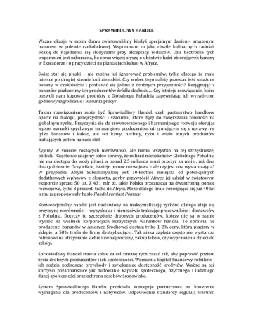 SPRAWIEDLIWYHANDEL Ważne okazje w moim domu świętowaliśmy kiedyś specjalnym daniem– smażonym bananem w polewie czekoladowej. Wspominam to jako chwile kulinarnych radości, okazję do najedzenia się słodyczami przy akceptacji rodziców. Dziś beztroska tych wspomnieńjestzaburzona,bocorazwięcejsłyszęoubóstwieludzizbierającychbanany wEkwadorzeiopracydziecinaplantacjachkakaowAfryce. Świat stał się płaski – nie można już ignorować problemów, tylko dlatego że mają miejscepodrugiejstroniekuliziemskiej.Czywobectegonależyprzestaćjeśćsmażone banany w czekoladzie i pozbawić się jednej z drobnych przyjemności? Rezygnując z bananówpozbawimyichproducentówźródładochodu…Czyistniejerozwiązanie,które pozwoli nam kupować produkty z Globalnego Południa zapewniając ich wytwórcom godnewynagrodzenieiwarunkipracy? Takim rozwiązaniem może być Sprawiedliwy Handel, czyli partnerstwo handlowe oparte na dialogu, przejrzystości i szacunku, które dąży do zwiększania równości na globalnymrynku.Przyczyniasiędozrównoważonegoiharmonijnegorozwojuoferując lepsze warunki spychanym na margines producentom utrzymującym się z uprawy nie tylko bananów i kakao, ale też kawy, herbaty, ryżu i wielu innych produktów trafiającychpotemnanaszstół. Żyjemy w świecie rosnących nierówności, ale mimo wszystko na tej szczęśliwszej półkuli.Częstoniezdajemysobiesprawy,żemiliardmieszkańcówGlobalnegoPołudnia nie ma dostępu do wody pitnej, a ponad 2,5 miliarda musi przeżyć za mniej, niż dwa dolarydziennie.Oczywiście,istniejepomocrozwojowa–aleczyjestonawystarczająca? W przypadku Afryki Subsaharyjskiej jest 10‐krotnie mniejsza od potencjalnych dodatkowych wpływów z eksportu, gdyby przywrócić Afryce jej udział w światowym eksporcie sprzed 50 lat. Z 431 mln zł, jakie Polska przeznacza na dwustronną pomoc rozwojowa,tylko3procenttrafiadoAfryki.Możedlategokrajerozwijającesięjuż40lat temuzaproponowałyhasłoHandelzamiastPomocy. Konwencjonalny handel jest nastawiony na maksymalizację zysków, dlatego staje się przyczynąnierówności–wyzyskującinieuczciwietraktującpracownikówidostawców z Południa. Dotyczy to szczególnie drobnych producentów, którzy nie są w stanie wymóc na wielkich korporacjach korzystnych warunków handlu. To sprawia, że producenci bananów w Ameryce Środkowej dostają tylko 1‐2% ceny, którą płacimy w sklepie, a 50% trafia do firmy dystrybuującej. Tak niska zapłata często nie wystarcza rolnikowinautrzymaniesiebieiswojejrodziny,zakupleków,czywyprawieniedziecido szkoły. Sprawiedliwy Handel stawia sobie za cel zmianę tych zasad tak, aby poprawić poziom życiadrobnychproducentówiichspołeczności.Wzmacniakapitałfinansowyrolnikówi ich rodzin podnosząc przychody i zwiększając dostępność kredytów. Ważne są też korzyści pozafinansowe jak budowanie kapitału społecznego, fizycznego i ludzkiego danejspołecznościorazochronazasobówśrodowiska. System Sprawiedliwego Handlu przekłada koncepcję partnerstwa na konkretne wymagania dla producentów i nabywców. Odpowiednie standardy regulują warunki handlu i funkcjonowanie SprawiedliwegoHandlu,to: organizacji producenckich. Podstawowe zasady Długoterminowe i stabilne relacje handlowe – bezpośrednie umowy między producentami z Południa i importerami z Północy, które dają rolnikom możliwośćplanowaniabudżetuiukładaniastrategiidziałańnaprzyszłość. Finansowanie wstępne ‐ organizacja producencka może dostać część wartości kontraktuwformieprzedpłaty,dziękitemujestwstanieskupićzbioryodswoich członkówiutrzymaćpłynnośćfinansową. Cenaminimalna–niemożebyćniższaodcenyrynkowej,gwarantujerolnikowi zwrotkosztówprodukcjiizapewniagodneżyciejegorodzinie. Premia na rzecz społeczności lokalnej – przeznaczana w drodze demokratycznej decyzji na inwestycje w rozwój społeczności lokalnej, głównie budowęszkółiprzychodnilekarskich. Demokratyczne podejmowanie decyzji ‐ drobni producenci są zrzeszeni w organizacjach zarządzanych w sposób demokratyczny i przejrzysty, a prawo głosuniezależyodpłci,aniodstanuposiadania. Produkcja odpowiedzialna społecznie i środowiskowo ‐ zabroniona jest praca dzieci, praca w warunkach niewolniczych i dyskryminacyjne zasady działania organizacji. Obowiązują rozbudowane zasady regulujące gospodarkę zasobamiśrodowiskaichroniącejeprzeddegradacją Wypełnianie tych standardów jest kontrolowane przez niezależnych inspektorów, którzy decydują o przyznaniu certyfikatu potwierdzającego ‘sprawiedliwość’ danego produktu,czyorganizacji. Ruch Sprawiedliwego Handlu tworzony jest przez wiele organizacji i firm – produkujących,handlujących,certyfikujących, sprzedającychipromującychtowarySH. Najważniejsze znich to Stowarzyszenie FLOInternationaliIFAT.Mniejsze zajmujące się głównie importem i sprzedażą ‘sprawiedliwych’ produktów to np. Gepa, Altromercato, El Puente. Większość z nich współpracuje ze sobą w ramach EFTA – EuropejskiegoStowarzyszeniaSprawiedliwegoHandlu. Fairtrade, system odpowiadający za ponad 4/5 wielkości światowej sprzedaży SprawiedliwegoHandlu,skupiałw2007roku7,5milionaosóbz58krajówPołudnia– producentówiichrodzin.SprzedażproduktówzeznakiemFairtradewzrosła3‐krotnie wprzeciąguostatnich4lat,osiągającw2007rokuwartośćprawie2,5mld€.Szacujesię, że z tego prawie 200 mln € trafiło do rolników w postaci dodatkowych wpływów główniedziękipremiiicenieminimalnej.ProduktySHdostępnesąwponad60krajach, wdziesiątkachtysięcysklepów,kawiarniisupermarketów,takżewPolsce. Odnaszegowyborukonsumenckiegozatemzależyczybędziemymoglizespokojnym sumieniemdelektowaćsiębananemwpolewieczekoladowej. JakubRok GrupaeFTeWarszawa