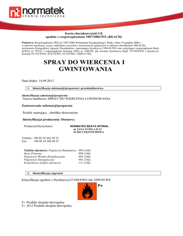Karta charakterystyki UE zgodnie z rozporządzeniem 1907/2006/WE (REACH) Podstawa: Rozporządzenie (WE) nr 1907/2006 Parlamentu Europejskiego i Rady z dnia 18 grudnia 2006 r. w sprawie rejestracji, oceny, udzielania zezwoleń i stosowanych ograniczeń w zakresie chemikaliów (REACH), utworzenia Europejskiej Agencji Chemikaliów, zmieniające dyrektywę 1999/45/WE oraz uchylające rozporządzenie Rady (EWG) nr 793/93 i rozporządzenie Komisji (WE) nr 1488/94, jak również dyrektywę Rady 76/769/EWG i dyrektywy Komisji 91/155/EWG, 93/67/EWG, 93/105/WE i 2000/21/WE. SPRAY DO WIERCENIA I GWINTOWANIA Data druku: 14.09.2012 1. Identyfikacja substancji/preparatu i przedsiębiorstwa Identyfikacja substancji/preparatu Nazwa handlowa: SPRAY DO WIERCENIA I GWINOWANIA Zastosowanie substancji/preparatu Środek smarujący , obróbka skrawaniem Identyfikacja producenta/ Dostawcy Producent/Dystrybutor: NORMATEK BEATA WYWIAŁ ul. JANA PAWŁA II 23 42-202 CZĘSTOCHOWA Telefon: +00 48 34 364 39 23 Fax: +00 48 34 360 48 47 Telefon alarmowy Pogotowie Ratunkowe Straż Pożarna Pogotowie Wodno-Kanalizacyjne Pogotowie Energetyczne Komórkowy telefon alarmowy 999 (24h) 998 (24h) 994 (24h) 991 (24h) 112 (24h) 2I 2. Identyfikacja zagrożeń Klasyfikacja zgodnie z Dyrektywą 67/548/EWG lub 1999/45/WE F+ Produkt skrajnie łatwopalny F+, R12 Produkt skrajnie łatwopalny 3. Skład/informacja o składnikach Charakterystyka chemiczna: Mieszanka składników aktywnych z gazem wytłaczającym Składniki niebezpieczne CAS nr EINECS/ELINCS Opis zawartość 15-25% klasyfikacja 106-97-8 203-448-7 n-butan, czysty F+, R12 75-28-5 200-857-2 izobutan, czysty 25-50% F+; R 12 74-98-6 200-827-9 propan 10-20% F+; R 12 4. Pierwsza pomoc sza pomoc Po wdychaniu: Osobie poszkodowanej zapewnić dopływ świeżego powietrza, okryć i pozwolić odpocząć. W razie dolegliwości związanych z oddychaniem wezwać lekarza. Po styczności ze skórą: Zdjąć zabrudzone ubranie. Powierzchnie zabrudzone zmyć wodą z mydłem. Nie używać rozpuszczalników ani rozcieńczalników. Przy reakcjach skórnych skonsultować się z lekarzem. Po styczności z okiem: Przepłukać oczy z otwartą powieką przez kilka minut pod bieżącą wodą. W przypadku wystąpienia lub utrzymujących się dolegliwości zasięgnąć porady okulisty. Uwagi dla lekarza: leczenie objawowe. 5. Postępowanie w przypadku pożaru Przydatne środki gaśnicze: piana odporna na działanie alkoholu, proszek gaśniczy, rozpylony strumień wody, dwutlenek węgla. Środki gaśnicze nieprzydatne ze względów bezpieczeństwa: Pełny strumień wody. Specjalne zagrożenia związane z narażeniem wynikającym z właściwości substancji/preparatu jako takiego, produktów spalania, powstających gazów: Produkt skrajnie łatwopalny. Możliwe powstanie wybuchowej mieszaniny parowo- powietrznej. W przypadku pożary: gęsty, czarny dym mogący spowodować uszkodzenie zdrowia. Ponadto mogą powstawać: tlenek węgla i dwutlenek węgla. Specjalne wyposażenie ochronne: nosić aparat izolujący drogi oddechowe Dodatkowe informacje: Zajęte pożarem pojemniki schłodzić rozpylonym strumieniem wody. Pojemniki pod ciśnieniem. Przy ogrzewaniu istniej możliwość rozerwania. 6. Postępowanie w przypadku niezamierzonego uwolnienia do środowiska Indywidualne środki ostrożności: Zadbać o wystarczające wietrzenie. Nie wdychać pary/aerozolu. Nosić odpowiednią odzież ochronną. Unikać kontaktów z substancją. Środki ochrony środowiska: Nie dopuścić do przedostania się do wód gruntowych, kanalizacji , zbiorników wodnych, miejsc położonych poniżej i wykopów/kopalni. Metoda oczyszczania/ wchłaniania: odgrodzić niepalnym materiałem chłonnym (np. piaskiem, ziemią, wermikulitem, ziemią okrzemkową) i zebrać zgodnie z lokalnymi przepisami do przeznaczonych do tego pojemników celem utylizacji (patrz rozdział 13). Oczyścić powierzchnię środkami czyszczącymi, nie używać rozpuszczalników. Dodatkowe uwagi: Usunąć wszelkie źródła zapłonu. 7. Postępowanie z produktem i jego magazynowanie Postępowanie Wskazówki dla bezpiecznego użytkowania: Używać tylko w dobrze wentylowanych miejscach pracy. Nie wdychać pary/aerozolu. Unikać intensywnego kontaktu ze skórą. Nie pryskać w oczy. Wskazówki dla ochrony przeciwpożarowej i przeciwwybuchowej: Pary tworzą z powietrzem wybuchowe opary, cięższe od powietrza. Chronić przed promieniami słońca i temperaturami powyżej 50 C. Przechowywać z dala od źródeł zapłonu.- Nie palić. Przedsięwziąć środki przeciwko naładowaniom elektrostatycznym. Także po użyciu nie otwierać gwałtownie i nie spalać. Nie rozpylać w kierunku płomieni lub na żarzące przedmioty. Składowanie Wymagania w stosunku do pomieszczeń składowych i zbiorników: Pojemniki /zbiorniki przechowywać w dobrze wietrzonym miejscu. Przechowywać tylko w oryginalnych zbiornikach. Przechowywać w temperaturze pokojowej w pozycji pionowej. Wskazówki odnośnie wspólnego składowania: Nie przechowywać razem z silnymi środkami utleniającymi . Dalsze wskazówki odnośnie warunków składowania: Podgrzewanie prowadzi do wzrostu ciśnienia i niebezpieczeństwa wybuchu. Klasa składowania VCI: 2B = Opakowania pod ciśnieniem ( opakowanie w aerozolu) 8. Kontrola narażenia/środki ochrony indywidualnej Wartości graniczne narażenia Nr CAS opis rodzaj wartość graniczna 75-28-5 izobutan, czysty Niemcy, AGW Langzeit Niemcy, AGW Langzeit Niemcy, AGW Kurzzeit Niemcy, AGW Kurzzeit 1000 ppm 2400 mg/m³ 4000 ppm 9600 mg/m³ 75-28-5 Niemcy, AGW Langzeit Niemcy, AGW Langzeit Niemcy, AGW Kurzzeit Niemcy, AGW Kurzzeit 1000 ppm 2400 mg/m³ 4000 ppm 9600 mg/m³ Niemcy, AGW Langzeit Niemcy, AGW Langzeit Niemcy, AGW Kurzzeit Niemcy, AGW Kurzzeit 1000 ppm 1800 mg/m³ 4000 ppm 7200 mg/m³ 74-98-6 izobutan, czysty propan Ograniczenia i kontrola narażenia Dbać o dobrą wentylację pomieszczenia pracy i/lub zapewnić system ssący w miejscu pracy. Patrz także da