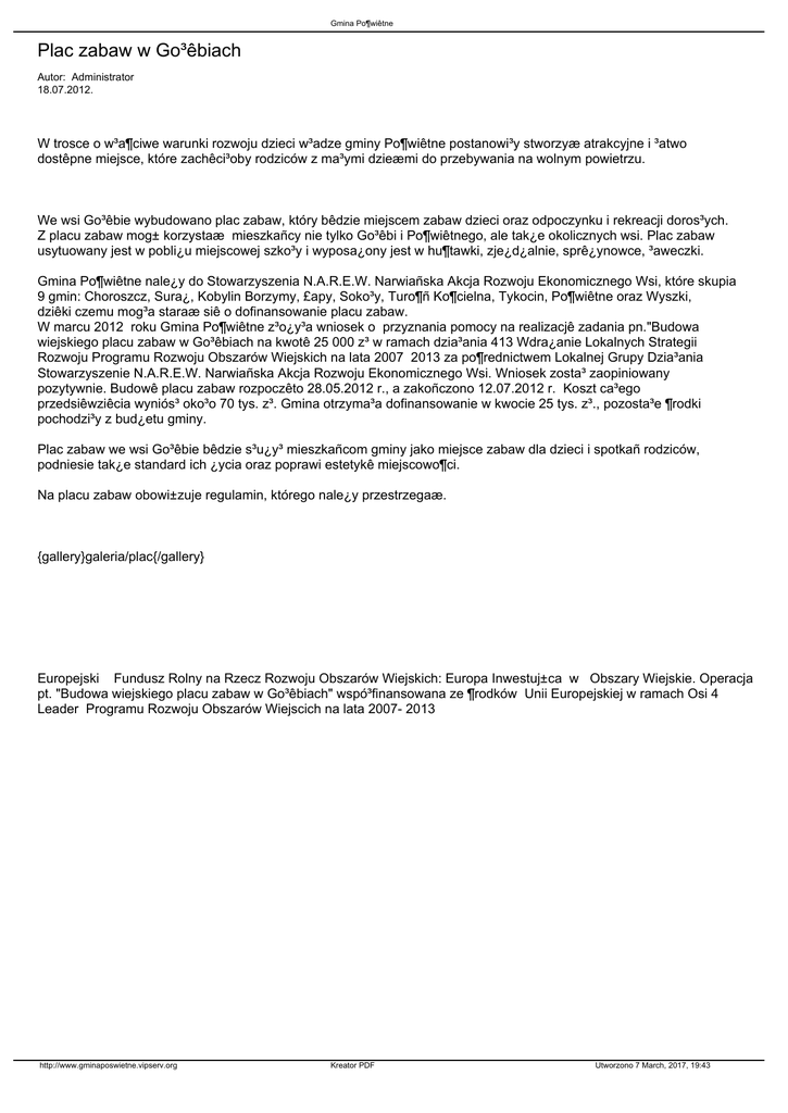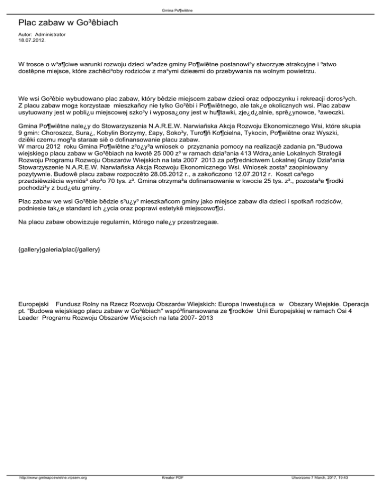wiejskiego placu zabaw w Go³êbiach na kwotê 25 000 z³ w ramach dzia³ania 413 Wdra¿anie Lokalnych Strategii