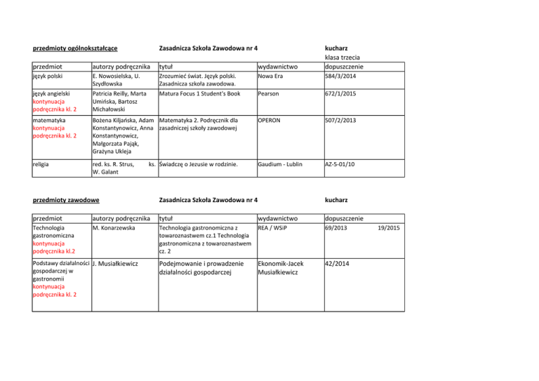 przedmioty ogólnokształcące Zasadnicza Szkoła Zawodowa nr 4 przedmiot autorzy podręcznika tytuł wydawnictwo kucharz klasa trzecia dopuszczenie język polski E. Nowosielska, U. Szydłowska Zrozumieć świat. Język polski. Zasadnicza szkoła zawodowa. Nowa Era 584/3/2014 język angielski kontynuacja podręcznika kl. 2 Patricia Reilly, Marta Umińska, Bartosz Michałowski Matura Focus 1 Student's Book Pearson 672/1/2015 matematyka kontynuacja podręcznika kl. 2 Bożena Kiljańska, Adam Matematyka 2. Podręcznik dla Konstantynowicz, Anna zasadniczej szkoły zawodowej Konstantynowicz, Małgorzata Pająk, Grażyna Ukleja OPERON 507/2/2013 religia red. ks. R. Strus, W. Galant Gaudium - Lublin AZ-5-01/10 ks. Świadczę o Jezusie w rodzinie. przedmioty zawodowe Zasadnicza Szkoła Zawodowa nr 4 przedmiot autorzy podręcznika tytuł wydawnictwo dopuszczenie Technologia gastronomiczna kontynuacja podręcznika kl.2 M. Konarzewska Technologia gastronomiczna z towaroznastwem cz.1 Technologia gastronomiczna z towaroznastwem cz. 2 REA / WSiP 69/2013 Podejmowanie i prowadzenie działalności gospodarczej Ekonomik-Jacek Musiałkiewicz 42/2014 Podstawy działalności J. Musiałkiewicz gospodarczej w gastronomii kontynuacja podręcznika kl. 2 kucharz 19/2015 Język angielski zawodowy kontynuacja podręcznika kl. 2 A. Baude, M. Iglesias, A. Ready to Order Inesta Longman 512[3]T-5 Pracownia M. Konarzewska gastronomiczna kucharz kontynuacja podręcznika kl. 2 Technologia gastronomiczna z towaroznastwem cz.1 Technologia gastronomiczna z towaroznastwem cz. 2 REA / WSiP 69/2013 19/2015 Zajęcia praktyczne gastronomiczne kontynuacja podręcznika kl. 2 Technologia gastronomiczna z towaroznastwem cz.1 Technologia gastronomiczna z towaroznastwem cz. 2 REA / WSiP 69/2013 19/2015 M. Konarzewska
