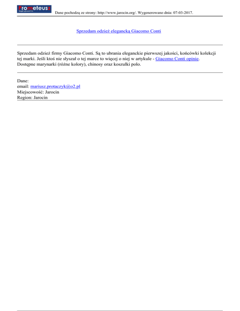 Dane pochodzą ze strony: http://www.jarocin.org/. Wygenerowano dnia: 07-03-2017. Sprzedam odzież elegancką Giacomo Conti Sprzedam odzież firmy Giacomo Conti. Są to ubrania eleganckie pierwszej jakości, końcówki kolekcji tej marki. Jeśli ktoś nie słyszał o tej marce to więcej o niej w artykule - Giacomo Conti opinie. Dostępne marynarki (różne kolory), chinosy oraz koszulki polo. Dane: email: [email protected] Miejscowość: Jarocin Region: Jarocin