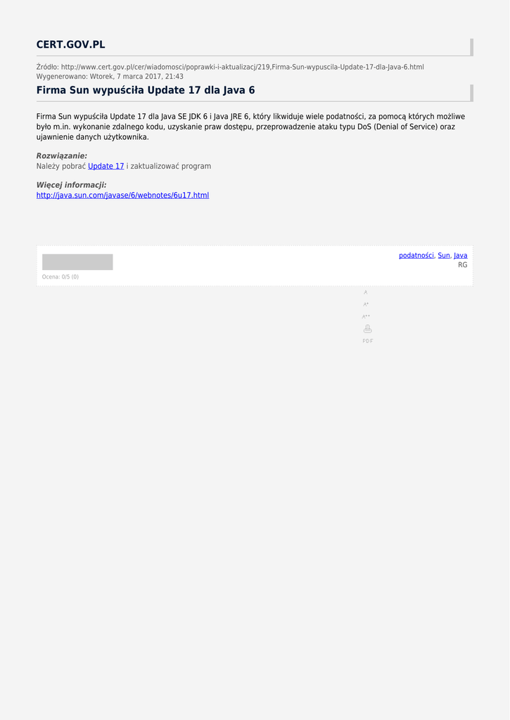 CERT.GOV.PL Źródło: http://www.cert.gov.pl/cer/wiadomosci/poprawki-i-aktualizacj/219,Firma-Sun-wypuscila-Update-17-dla-Java-6.html Wygenerowano: Wtorek, 7 marca 2017, 21:43 Firma Sun wypuściła Update 17 dla Java 6 Firma Sun wypuściła Update 17 dla Java SE JDK 6 i Java JRE 6, który likwiduje wiele podatności, za pomocą których możliwe było m.in. wykonanie zdalnego kodu, uzyskanie praw dostępu, przeprowadzenie ataku typu DoS (Denial of Service) oraz ujawnienie danych użytkownika. Rozwiązanie: Należy pobrać Update 17 i zaktualizować program Więcej informacji: http://java.sun.com/javase/6/webnotes/6u17.html podatności, Sun, Java RG Ocena: 0/5 (0)