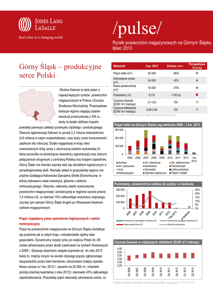Rynek powierzchni magazynowych na Górnym Śląsku lipiec 2013 Górny Śląsk – produkcyjne serce Polski Wskaźnik Okolice Katowic to dziś jeden z najważniejszych rynków powierzchni Pustostany (%) magazynowych w Polsce i Europie Czynsze bazowe (EUR/ m2/ miesiąc) Czynsze efektywne (EUR/ m2/ miesiąc) tradycje regionu sięgają czasów rewolucji przemysłowej z XIX w., kiedy to dzięki obfitości kopalin powstały pierwsze zakłady przemysłu ciężkiego i produkcyjnego. Obecnie aglomeracja Katowic to ponad 2,2 miliona mieszkańców (4,6 miliona w całym województwie), oraz duży rynek konsumencki i zaplecze siły roboczej. Dzięki najgęstszej w kraju sieci nowoczesnych dróg (wraz z ukończoną ostatnio autostradą A1, Górny Śląsk ma również szansę stać się ośrodkiem logistycznym o ponadregionalnej skali. Niemały wkład w gospodarkę regionu ma prężnie działająca Katowicka Specjalna Strefa Ekonomiczna, w której ulokowano wiele inwestycji, głównie z sektora motoryzacyjnego. Obecnie, całkowity zasób nowoczesnej powierzchni magazynowej i produkcyjnej w regionie wynosi prawie Perspektywa 12 m-cy 25 000 -56% 34 000 +5% 10 000 -74% 6,7% +130 bp 3,1-3,9 0% 2,45-3,40 0% Popyt netto: Powierzchnia wynajęta bez odnowionych umów Popyt netto na Górnym Śląsku wg sektorów 2006 – I kw. 2013 300 000 200 000 100 000 która pozwoliła na domknięcie obwodnicy aglomeracji) oraz dobrym połączeniom drogowym z centralną Polską oraz krajami sąsiednimi, Zmiana r-d-r- Popyt netto (m2) Odnowienia umów (m2) Nowa powierzchnia (m2) Środkowo-Wschodniej. Przemysłowe I kw. 2013 0 2005 2006 2007 2008 2009 2010 2011 2012 Archiwa Art. spożywcze Inne Motoryzacyjne Art. chemiczne Budowlane Kosmetyki Operator logistyczny Art. elektroniczne Farmaceutyki Lekka produkcja Papier i książki I kw 2013 Pustostany, powierzchnia oddana do użytku i w budowie 300 000 1,4 miliona m2, co stanowi 19% całkowitego wolumenu krajowego, 200 000 czyniąc tym samym Górny Śląsk drugim po Warszawie lokalnym 100 000 rynkiem magazynowym. 25% 20% 15% 10% 5% 0% 0 Popyt napędzany przez operatorów logistycznych i sektor motoryzacyjny Powierzchnia niewynajęta w budowie (m²) Powierzchnia wynajęta w budowie (m²) Nowa powierzchnia (m²) Wskaźnik pustostanów Popyt na powierzchnie magazynowe na Górnym Śląsku kształtuje się podobnie jak w całym kraju i odzwierciedla ogólny stan Q2 2013 Q1 2013 Q4 2012 poniżej średniej kwartalnej z roku 2012) i stanowiły 43% całkowitego zapotrzebowania. Pozostałą część stanowiły odnowienia umów, co Q4 2011 Nowe umowy w I kw. 2013 r. zawarto na 25 000 m2, (niewiele Q4 2010 bezpośrednio przez sieci handlowe, odnotowano kolejny spadek. Q4 2009 kiedy to, między innymi na skutek niższego popytu zgłoszonego 4,50 4,00 3,50 3,00 2,50 2,00 Q4 2008 z 2008 r. Sytuacja stopniowo ulegała poprawie aż do roku 2012 Czynsze bazowe w najlepszych obiektach (EUR/ m2/ miesiąc) Q4 2007 został zahamowany przez skutki zawirowań na rynkach finansowych Q4 2006 gospodarki. Dynamiczny rozwój rynku po wejściu Polski do UE Źródło wszystkich wykresów: Jones Lang LaSalle, magazyny.pl, I i II kw. 2013 Pulse • Rynek powierzchni magazynowych na Górnym Śląsku - lipiec 2013 • 2 może świadczyć o tym, że region jest dobrze postrzegany przez Piekar Śląskich). Może to oznaczać, że w rejonach tych będą w firmy już w nim obecne. Największy udział w popycie w 2012 r. mieli kolejnych latach powstawały nowe inwestycje magazynowe. operatorzy logistyczni (52%), którzy z górnośląskich obiektów korzystają często przy obsłudze niedalekiej aglomeracji Krakowa. Prologis, Panattoni i SEGRO to wciąż trójka największych graczy na Rynek krakowski charakteryzuje się niewielką dostępnością rynku górnośląskim. Dzięki ubiegłorocznej transakcji kupna portfela powierzchni i wyraźnie wyższymi stawkami czynszowymi. Na nieruchomości Prologis o powierzchni ponad 100 000 m2 swoją kolejnych miejscach znalazły się sektory motoryzacyjny (23%) i obecność w regionie silnie znaznaczyła również firma Hines. lekkiej produkcji (11%). Pierwszy z nich odpowiadał także za 60% nowego popytu w I kw. 2013. Obserwujemy także rosnące Całkowita powierzchnia oddana do użytku w 2012 r. wyniosła zainteresowanie regionem ze strony firm dalekowschodnich, a w 96 000 m2. W I kw. 2013 rynek wzbogacił się o skromne 10 000 m2, szczególności koreańskich, dla których Górny Śląsk stanowi oddane do użytku w ramach Panattoni Park Mysłowice. atrakcyjną lokalizację ze względu na niewielką odległość od ich zakładów w Czechach i Słowacji. Największe nowe umowy najmu na Górnym Śląsku w I kw. 2013 Okres I kw. 2013 I kw. 2013 Rodzaj umowy Nowa Nowa I kw. 2013 Nowa I kw. 2013 Nowa Obiekt Najemca Powierzchnia MLP Bieruń Flexider 8 000 Denso 4 400 Messer Eutectic Castolin 4 000 Cartonplast 3 600 Panattoni Park Mysłowice Diamond Business Park Glwice Panattoni Park Mysłowice Panattoni Park Mysłowice Obecnie w fazie realizacji znajduje się łącznie ok. 38 000 m2 w ramach następujących obiektów: 18 000 m2 w SEGRO Industrial Park Tychy dla firmy Dayco, 8 000 m2 w MLP Tychy (m.in. dla firmy Źródło: Jones Lang LaSalle, magazyny.pl, I kw. 2013 Eurosoft) oraz 8 000 m2 w MLP Bieruń dla firmy Flexider. Region cieszy się stabilnym zainteresowaniem głównych graczy, choć budowy spekulacyjne stanowią jedynie 10% powstającej Możliwy deficyt wolnych powierzchni powierzchni. Deweloperzy nie są zbytnio skłonni do podejmowania Przed spowolnieniem gospodarczym wielkość nowej powierzchni ryzyka i budują w oparciu o zawarte wcześniej umowy najmu. Aby oddawanej do użytku charakteryzowała się wysoką dynamiką, co móc liczyć budowę nowego obiektu, najemcy muszą liczyć się z jest właściwością rynków młodych, i sięgnęła ponad 280 000 m2 w tym, że powierzchnia nie powinna być mniejsza niż 7 000 m2, a 2009 r. Od tego czasu deweloperzy znacznie og
