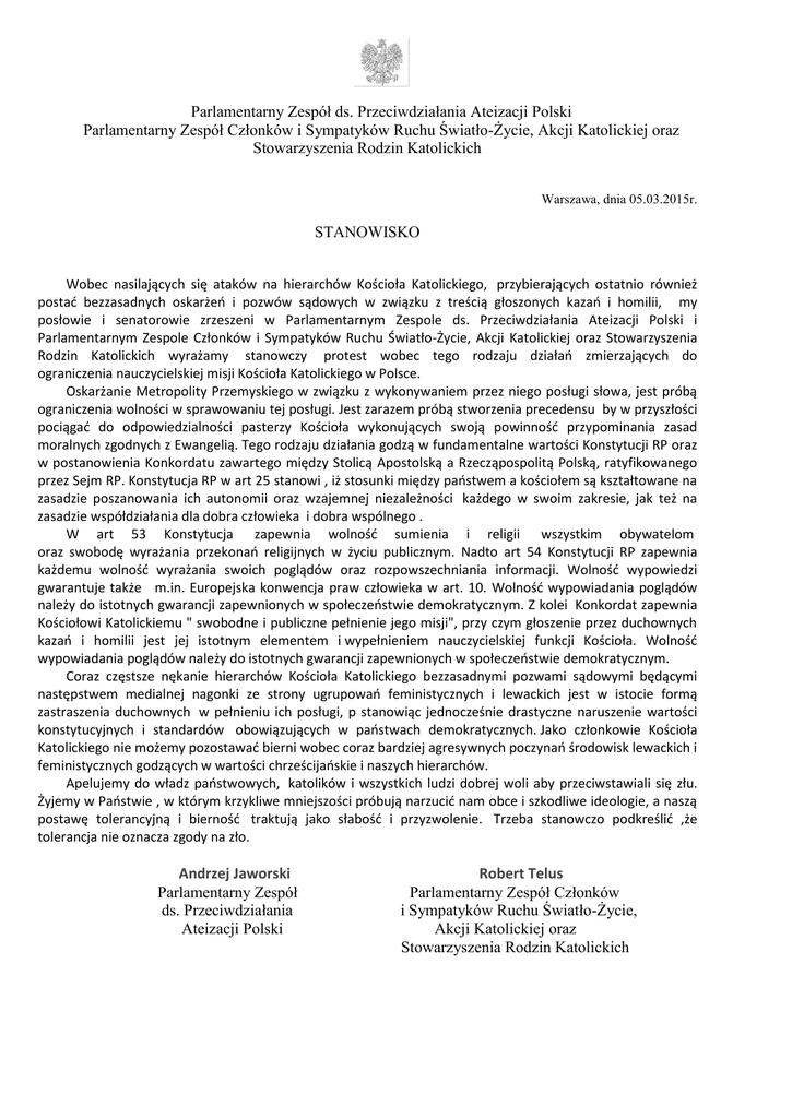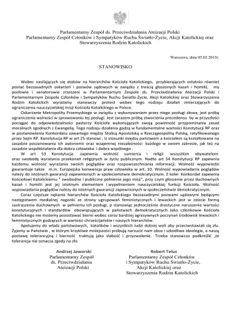 Parlamentarny Zespół ds. Przeciwdziałania Ateizacji Polski Parlamentarny Zespół Członków i Sympatyków Ruchu Światło-Życie, Akcji Katolickiej oraz Stowarzyszenia Rodzin Katolickich Warszawa, dnia 05.03.2015r. STANOWISKO Wobec nasilających się ataków na hierarchów Kościoła Katolickiego, przybierających ostatnio również postać bezzasadnych oskarżeń i pozwów sądowych w związku z treścią głoszonych kazań i homilii, my posłowie i senatorowie zrzeszeni w Parlamentarnym Zespole ds. Przeciwdziałania Ateizacji Polski i Parlamentarnym Zespole Członków i Sympatyków Ruchu Światło-Życie, Akcji Katolickiej oraz Stowarzyszenia Rodzin Katolickich wyrażamy stanowczy protest wobec tego rodzaju działań zmierzających do ograniczenia nauczycielskiej misji Kościoła Katolickiego w Polsce. Oskarżanie Metropolity Przemyskiego w związku z wykonywaniem przez niego posługi słowa, jest próbą ograniczenia wolności w sprawowaniu tej posługi. Jest zarazem próbą stworzenia precedensu by w przyszłości pociągać do odpowiedzialności pasterzy Kościoła wykonujących swoją powinność przypominania zasad moralnych zgodnych z Ewangelią. Tego rodzaju działania godzą w fundamentalne wartości Konstytucji RP oraz w postanowienia Konkordatu zawartego między Stolicą Apostolską a Rzecząpospolitą Polską, ratyfikowanego przez Sejm RP. Konstytucja RP w art 25 stanowi , iż stosunki między państwem a kościołem są kształtowane na zasadzie poszanowania ich autonomii oraz wzajemnej niezależności każdego w swoim zakresie, jak też na zasadzie współdziałania dla dobra człowieka i dobra wspólnego . W art 53 Konstytucja zapewnia wolność sumienia i religii wszystkim obywatelom oraz swobodę wyrażania przekonań religijnych w życiu publicznym. Nadto art 54 Konstytucji RP zapewnia każdemu wolność wyrażania swoich poglądów oraz rozpowszechniania informacji. Wolność wypowiedzi gwarantuje także m.in. Europejska konwencja praw człowieka w art. 10. Wolność wypowiadania poglądów należy do istotnych gwarancji zapewnionych w społeczeństwie demokratycznym. Z kolei Konkordat zapewnia Kościołowi Katolickiemu " swobodne i publiczne pełnienie jego misji", przy czym głoszenie przez duchownych kazań i homilii jest jej istotnym elementem i wypełnieniem nauczycielskiej funkcji Kościoła. Wolność wypowiadania poglądów należy do istotnych gwarancji zapewnionych w społeczeństwie demokratycznym. Coraz częstsze nękanie hierarchów Kościoła Katolickiego bezzasadnymi pozwami sądowymi będącymi następstwem medialnej nagonki ze strony ugrupowań feministycznych i lewackich jest w istocie formą zastraszenia duchownych w pełnieniu ich posługi, p stanowiąc jednocześnie drastyczne naruszenie wartości konstytucyjnych i standardów obowiązujących w państwach demokratycznych. Jako członkowie Kościoła Katolickiego nie możemy pozostawać bierni wobec coraz bardziej agresywnych poczynań środowisk lewackich i feministycznych godzących w wartości chrześcijańskie i naszych hierarchów. Apelujemy do władz państwowych, katolików i wszystkich ludzi dobrej woli aby przeciwstawiali się złu. Żyjemy w Państwie , w którym krzykliwe mniejszości próbują narzucić nam obce i szkodliwe ideologie, a naszą postawę tolerancyjną i bierność traktują jako słabość i przyzwolenie. Trzeba stanowczo podkreślić ,że tolerancja nie oznacza zgody na zło. Andrzej Jaworski Parlamentarny Zespół ds. Przeciwdziałania Ateizacji Polski Robert Telus Parlamentarny Zespół Członków i Sympatyków Ruchu Światło-Życie, Akcji Katolickiej oraz Stowarzyszenia Rodzin Katolickich