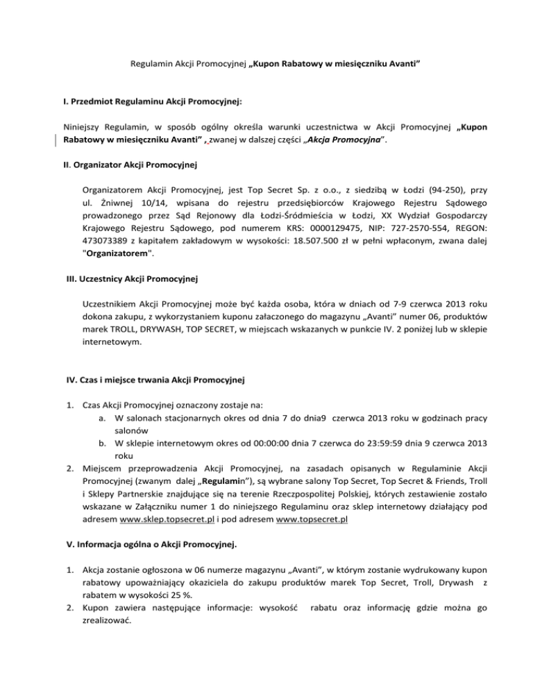 Regulamin Akcji Promocyjnej „Kupon Rabatowy w miesięczniku Avanti” I. Przedmiot Regulaminu Akcji Promocyjnej: Niniejszy Regulamin, w sposób ogólny określa warunki uczestnictwa w Akcji Promocyjnej „Kupon Rabatowy w miesięczniku Avanti” , zwanej w dalszej części „Akcja Promocyjna”. II. Organizator Akcji Promocyjnej Organizatorem Akcji Promocyjnej, jest Top Secret Sp. z o.o., z siedzibą w Łodzi (94-250), przy ul. Żniwnej 10/14, wpisana do rejestru przedsiębiorców Krajowego Rejestru Sądowego prowadzonego przez Sąd Rejonowy dla Łodzi-Śródmieścia w Łodzi, XX Wydział Gospodarczy Krajowego Rejestru Sądowego, pod numerem KRS: 0000129475, NIP: 727-2570-554, REGON: 473073389 z kapitałem zakładowym w wysokości: 18.507.500 zł w pełni wpłaconym, zwana dalej "Organizatorem". III. Uczestnicy Akcji Promocyjnej Uczestnikiem Akcji Promocyjnej może być każda osoba, która w dniach od 7-9 czerwca 2013 roku dokona zakupu, z wykorzystaniem kuponu załaczonego do magazynu „Avanti” numer 06, produktów marek TROLL, DRYWASH, TOP SECRET, w miejscach wskazanych w punkcie IV. 2 poniżej lub w sklepie internetowym. IV. Czas i miejsce trwania Akcji Promocyjnej 1. Czas Akcji Promocyjnej oznaczony zostaje na: a. W salonach stacjonarnych okres od dnia 7 do dnia9 czerwca 2013 roku w godzinach pracy salonów b. W sklepie internetowym okres od 00:00:00 dnia 7 czerwca do 23:59:59 dnia 9 czerwca 2013 roku 2. Miejscem przeprowadzenia Akcji Promocyjnej, na zasadach opisanych w Regulaminie Akcji Promocyjnej (zwanym dalej „Regulamin”), są wybrane salony Top Secret, Top Secret & Friends, Troll i Sklepy Partnerskie znajdujące się na terenie Rzeczpospolitej Polskiej, których zestawienie zostało wskazane w Załączniku numer 1 do niniejszego Regulaminu oraz sklep internetowy działający pod adresem www.sklep.topsecret.pl i pod adresem www.topsecret.pl V. Informacja ogólna o Akcji Promocyjnej. 1. Akcja zostanie ogłoszona w 06 numerze magazynu „Avanti”, w którym zostanie wydrukowany kupon rabatowy upoważniający okaziciela do zakupu produktów marek Top Secret, Troll, Drywash z rabatem w wysokości 25 %. 2. Kupon zawiera następujące informacje: wysokość rabatu oraz informację gdzie można go zrealizować. 3. Kupon uprawnia do jednorazowej zniżki na zakupy w Salonach Stacjonarnych, która będzie weryfikowana poprzez okazanie sprzedawcy kuponu, podczas dokonywania zakupów w salonie. Powyższe ograniczenie jednorazowego skorzystania z upustu nie dotyczy zakupów w sklepie internetowym. 4. Wszelkie informacje o Akcji Promocyjnej zawarte w materiałach promocyjnych i reklamowych mają wyłącznie charakter informacyjny. Wiążącą moc prawną mają postanowienia niniejszego Regulaminu. 5. Wszelkie informacje o promocji znajdują się na stronie internetowej Organizatora. VI. Zasady i warunki obowiązywania promocji 1. Uczestnik Akcji Promocyjnej może skorzystać zniżki rabatu 25% na zakupy nieprzecenionych produktów z kolekcji wiosna/lato 2013 marek TOP SECRET, TROLL, DRYWASH. Zniżka zostanie udzielona na warunkach określonych w niniejszym Regulaminie. 2. Zniżki nie łączą się ze sobą, ani z żadnymi innymi promocyjnymi ofertami cenowymi wprowadzonymi przez Salony Stacjonarne czy Sklep internetowy, 3. Zwrot produktów zakupionych w promocji jest możliwy na ogólnych zasadach dostępnych w salonach. 4. Ilość produktów objętych Akcją Promocyjną jest ograniczona. W przypadku braku towaru objętego promocją Uczestnikowi nie przysługują z tego tytułu żadne roszczenia. 5. Akcja Promocyjna trwa w okresie oznaczonym w Regulaminie promocji. Organizator zastrzega sobie prawo do skrócenia okresu trwania Akcji Promocyjnej w uzasadnionych przypadkach. 6. Za wadliwe lub niepełne odczytanie hasła Akcji Promocyjnej, Organizator nie odpowiada. 7. Wszelkie ewentualne skargi lub żądania, związane ze sposobem przebiegu Akcji Promocyjnej Uczestnik może kierować na piśmie do Organizatora w terminie 3 dni od daty zakończenia Akcji Promocyjnej, celem rozpatrzenia zasadności skargi lub żądania. O przyjęciu skargi lub żądania decyduje data nadania listem poleconym zgodnie z przepisami kodeksu cywilnego. 8. Skargi nadane po upływie powyższego terminu nie będą rozpatrywane. Skargi rozpatrywać będzie Organizator w terminie 14 dni od dnia ich otrzymania. 9. Niniejszy Regulamin jest dostępny w siedzibie Organizatora i na stronie internetowej www.topsecret.pl. 10. W uzasadnionych przypadkach Organizator zastrzega sobie prawo do zmiany niniejszego Regulaminu, do zmiany terminu obowiązywania Akcji Promocyjnej, jak również listy salonów uczestniczących w promocji, bez umniejszenia praw nabytych przez Użytkowników przed dniem dokonania zmian. VII. Postanowienia końcowe 1. Wszelkie sprawy sporne związane z Akcją Promocyjną będą rozstrzygane przed miejscowo i rzeczowo właściwym sądem. W sprawach nieuregulowanych niniejszym Regulaminem odpowiednie zastosowanie mają powszechnie obowiązującego przepisy prawa. 2. Organizator nie ponosi odpowiedzialności za ewentualne kwestie sporne powstałe z przyczyn leżących po stronie osób trzecich. Załącznik Nr1. TOP SECRET ŁUKÓW 21-400 NOWOPIJARSKA 9 TOP SECRET ŁOWICZ 99-400 KRAKOWSKA 7 TOP SECRET ŁOMŻA 18-400 AL.J.PIŁSUDSKIEGO 14A TOP SECRET TARNOBRZEG 39-400 PIŁSUDSKIEGO 16 TOP SECRET BEŁCHATÓW 97-400 1 MAJA 2 TOP SECRET WAŁCZ 78-600 KILIŃSZCZAKÓW 44 TOP SECRET LUBARTÓW 21-100 LUBELSKA 26 TOP SECRET LEŻAJSK 37-300 RZESZOWSKA 2 TOP SECRET RADOM 26-600 AL.GRZECZNAROWSKIEGO 28 TOP SECRET KROSNO 38-400 TKACKA 2C TOP SECRET KROTOSZYN 63-700 SŁODOWA 13 TOP SECRET OLKUSZ 32-300 RABASZYŃSKA 2 TOP SECRET RZESZÓW 35-001 PIŁSUDSKIEGO 34 TOP SECRET WARSZAWA 03-734 TARGOWA 72 TOP SECRET NOWY SĄCZ 33-300 NAWOJOWSKA 1 TOP SECRET KRAŚNIK 23-210 URZĘDOWSKA 551 TOP SECRET CIECHANÓW 06-400 WARSZAWSKA 62 A I B TOP SECRET NOWY DWÓR MAZOWIECKI 05-100 ZAKROCZYMSKA 10 TOP SECRET SIEDLCE 08-100 WOJSKOW