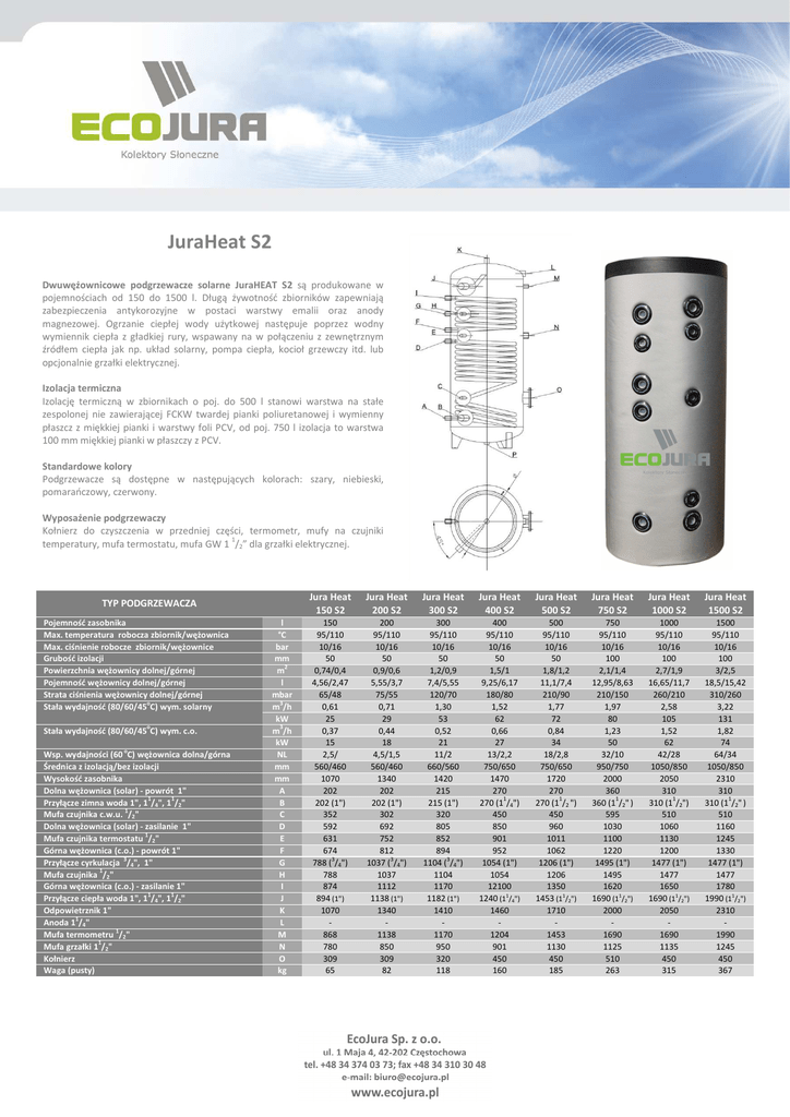 JuraHeat S2 Dwuwężownicowe podgrzewacze solarne JuraHEAT S2 są produkowane w pojemnościach od 150 do 1500 l. Długą żywotność zbiorników zapewniają zabezpieczenia antykorozyjne w postaci warstwy emalii oraz anody magnezowej. Ogrzanie ciepłej wody użytkowej następuje poprzez wodny wymiennik ciepła z gładkiej rury, wspawany na w połączeniu z zewnętrznym źródłem ciepła jak np. układ solarny, pompa ciepła, kocioł grzewczy itd. lub opcjonalnie grzałki elektrycznej. Izolacja termiczna Izolację termiczną w zbiornikach o poj. do 500 l stanowi warstwa na stałe zespolonej nie zawierającej FCKW twardej pianki poliuretanowej i wymienny płaszcz z miękkiej pianki i warstwy foli PCV, od poj. 750 l izolacja to warstwa 100 mm miękkiej pianki w płaszczy z PCV. Standardowe kolory Podgrzewacze są dostępne w następujących kolorach: szary, niebieski, pomarańczowy, czerwony. Wyposażenie podgrzewaczy Kołnierz do czyszczenia w przedniej części, termometr, mufy na czujniki temperatury, mufa termostatu, mufa GW 1 1/2” dla grzałki elektrycznej. TYP PODGRZEWACZA Pojemność zasobnika Max. temperatura robocza zbiornik/wężownica Max. ciśnienie robocze zbiornik/wężownice Grubość izolacji Powierzchnia wężownicy dolnej/górnej Pojemność wężownicy dolnej/górnej Strata ciśnienia wężownicy dolnej/górnej Stała wydajność (80/60/45oC) wym. solarny Stała wydajność (80/60/45oC) wym. c.o. Wsp. wydajności (60 oC) wężownica dolna/górna Średnica z izolacją/bez izolacji Wysokość zasobnika Dolna wężownica (solar) - powrót 1" Przyłącze zimna woda 1", 11/4", 11/2" Mufa czujnika c.w.u. 1/2" Dolna wężownica (solar) - zasilanie 1" Mufa czujnika termostatu 1/2" Górna wężownica (c.o.) - powrót 1" Przyłącze cyrkulacja 3/4", 1" Mufa czujnika 1/2" Górna wężownica (c.o.) - zasilanie 1" Przyłącze ciepła woda 1", 11/4", 11/2" Odpowietrznik 1" Anoda 11/4" Mufa termometru 1/2" Mufa grzałki 11/2" Kołnierz Waga (pusty) l °C bar mm m2 l mbar 3 m /h kW m3/h kW NL mm mm A B C D E F G H I J K L M N O kg Jura Heat 150 S2 Jura Heat 200 S2 Jura Heat 300 S2 Jura Heat 400 S2 Jura Heat 500 S2 Jura Heat 750 S2 Jura Heat 1000 S2 Jura Heat 1500 S2 150 95/110 10/16 50 0,74/0,4 4,56/2,47 65/48 0,61 25 0,37 15 2,5/ 560/460 1070 202 202 (1") 352 592 631 674 788 (3/4") 788 874 894 (1") 1070 868 780 309 65 200 95/110 10/16 50 0,9/0,6 5,55/3,7 75/55 0,71 29 0,44 18 4,5/1,5 560/460 1340 202 202 (1") 302 692 752 812 1037 (3/4") 1037 1112 1138 (1") 1340 1138 850 309 82 300 95/110 10/16 50 1,2/0,9 7,4/5,55 120/70 1,30 53 0,52 21 11/2 660/560 1420 215 215 (1") 320 805 852 894 1104 (3/4") 1104 1170 1182 (1") 1410 1170 950 320 118 400 95/110 10/16 50 1,5/1 9,25/6,17 180/80 1,52 62 0,66 27 13/2,2 750/650 1470 270 270 (11/4") 450 850 901 952 1054 (1") 1054 12100 1240 (11/4") 1460 1204 901 450 160 500 95/110 10/16 50 1,8/1,2 11,1/7,4 210/90 1,77 72 0,84 34 18/2,8 750/650 1720 270 270 (11/2 ") 450 960 1011 1062 1206 (1") 1206 1350 1453 (11/2") 1710 1453 1130 450 185 750 95/110 10/16 100 2,1/1,4 12,95/8,63 210/150 1,97 80 1,23 50 32/10 950/750 2000 360 360 (11/2" ) 595 1030 1100 1220 1495 (1") 1495 1620 1690 (11/2") 2000 1690 1125 510 263 1000 95/110 10/16 100 2,7/1,9 16,65/11,7 260/210 2,58 105 1,52 62 42/28 1050/850 2050 310 310 (11/2") 510 1060 1130 1200 1477 (1") 1477 1650 1690 (11/2") 2050 1690 1135 450 315 1500 95/110 10/16 100 3/2,5 18,5/15,42 310/260 3,22 131 1,82 74 64/34 1050/850 2310 310 310 (11/2" ) 510 1160 1245 1330 1477 (1") 1477 1780 1990 (11/2") 2310 1990 1245 450 367