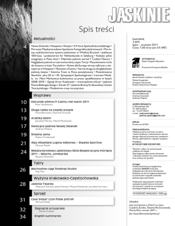 Spis treści Aktualności 4 Nowa Zelandia • Hiszpania • Etiopia • XV-lecie Speleoklubu Łódzkiego • Pierwsze Międzynarodowe Spotkanie Fotografów Jaskiniowych • Pierwszy stukilometrowy system jaskiniowy w Wielkiej Brytanii • Jubileusz 100-lecia Landesverein für Höhlenkunde in Salzburg • Kolejny syfon osiągnięty w Pozo Azul • Filipińska jaskinia wśród 7 Cudów Natury • Najgłębsza jaskinia w czarnomorskiej części Turcji • Poszukiwanie wrót do Sezamu w lesie Turyńskim • Nowe dla Europy wirusy odkryte u nietoperzy w Hiszpanii • Nowości z Kaninu • Sarma drugą co do głębokości jaskinią świata • Sistema Trave w Picos powiększony • Poszukiwaczy Skarbów plus 20 m • 45. Sympozjum Speleologiczne • Laureaci Medalu im. Marii Markowicz-Łohinowicz za prace opublikowane w latach 2008–2010 • Zginął Artur Kozłowski • www.jaskinie.info.pl • Jaskinie Pasma Babiogórskiego • Zacisk 27 • Jaskinie Bramy Krakowskiej i Garbu Tenczyńskiego • Podziemne trasy turystyczne Wyprawy 10 Kierunek północ?! Czemu nie! Kanin 2011 13 Długa rzeka na ciepłej wyspie 19 17 Piotr Sienkiewicz Kasia Biernacka, Dominik Graczyk Arabika latem Jarosław Marzec, Marek Markowski Świecące jaskinie Nowej Zelandii Andrzej Wojtoń 19 Śnieżna Jama 21 Alpy Albańskie Lugina Valbones – Shpella Sportive 24 Międzynarodowy Jaskiniowy Obóz Eksploracyjny InGrigna 2011 – Włochy, Lombardia Robert Frankowski Dariusz Piętak Ryszard Głowacki Tatry 26 Wschodnie ciągi Śnieżnej Studni Filip Filar Wyżyna Krakowsko-Częstochowska 28 Jaskinia Twarda Wojciech Kuczok, Jakub Nowak, Maciej Pawełczyk, Jarosław Surmacz Sprzęt 31 32 34 Cave Sniper czyli Polak potrafi kwartalnik 3 (64) lipiec – wrzesień 2011 Cena: 7,00 zł (w tym 5% VAT) WYDAWCA: Polski Związek Alpinizmu Pracownia Kreatywna Bezliku REDAKCJA: Jakub Nowak (redaktor naczelny) Michał Gradziński Grzegorz Haczewski Paulina Szelerewicz-Gładysz WSPÓŁPRACUJĄ: Kornelia Błaszczyk Andrzej Ciszewski Andrzej Wojtoń ADRES REDAKCJI: ul. Ehrenberga 36a 31-309 Kraków tel.: 12 637 08 65 e-mail: [email protected], [email protected] DRUK: Drukarnia LEYKO PRENUMERATA: Wpłaty prosimy kierować na adres i konto wydawcy z zaznaczeniem okresu jakiego dotyczy prenumerata i podaniem adresu, gdzie Jaskinie mają być wysyłane. MultiBank 69 1140 2017 0000 4102 0937 8193 Tekstów i zdjęć nie zamówionych redakcja nie odsyła. Zastrzegamy sobie prawo skracania i adiustacji tekstów nie autoryzowanych oraz zmiany ich tytułów. Uwaga! Rodzaj aktywności propagowany na łamach JASKIŃ może być niebezpieczny dla życia lub zdrowia. Redakcja nie bierze odpowiedzialności za ewentualne wypadki zaistniałe podczas jego uprawiania. Większość opisywanych na łamach czasopisma jaskiń leży na terenach chronionych i zasady ich zwiedzania określają odrębne przepisy. WYSOKOŒÆ NAK£ADU: 1000 egz. Mariusz Polok Okładka: Żegnajcie przyjaciele Jose Luis Gomez („Chino”) w rzece w jaskini Zumbo. Sistema Rio Encantado, Puerto Rico, marzec 2011 r. Marian Czepiel English summaries fot. Kasia Biernacka/speleo.pl