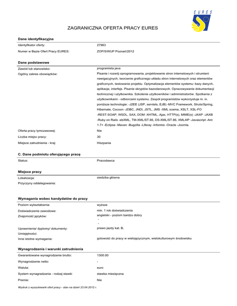 ZAGRANICZNA OFERTA PRACY EURES Dane identyfikacyjne Identyfikator oferty: 27963 Numer w Bazie Ofert Pracy EURES: ZOP/5/WUP Poznań/2012 Dane podstawowe Zawód lub stanowisko: programista java Ogólny zakres obowiązków: Pisanie i rozwój oprogramowania, projektowanie stron internetowych i strumieni nawigacyjnych, tworzenie graficznego układu stron internetowych oraz elementów graficznych, testowanie projektu. Optymalizacja elementów systemu: bazy danych, aplikacje, interfejs. Pisanie skryptów bazodanowych. Opracowywanie dokumentacji technicznej i użytkownika. Szkolenie użytkowników i administratorów. Spotkania z użytkownikami - odbiorcami systemu. Zespół programistów wykorzystuje m. in. poniższe technologie: -J2EE (JSP, servlets, EJB) -MVC Framework, Struts/Spring, Hibernate, Cocoon -JDBC, JNDI, JSTL, JMS -XML scema, XSLT, XSL-FO -REST-SOAP, WSDL, SAX, DOM -XHTML, Ajax, HTTP(s), MIME(s) -JAXP -JAXB -Ruby on Rails -ebXML, TM-XML/ST.66, DS-XML/ST.86, XML4IP -Javascript -Ant 1.7+ -Eclipse -Maven -Bugzilla -Liferay -Informix -Oracle -Joomla. Oferta pracy tymczasowej: Nie Liczba miejsc pracy: 30 Miejsce zatrudnienia - kraj: Hiszpania C. Dane podmiotu oferującego pracę Status: Pracodawca Miejsce pracy Lokalizacja: siedziba główna Przyczyny oddelegowania: Wymagania wobec kandydatów do pracy Poziom wykształcenia: wyższe Doświadczenie zawodowe: min. 1 rok doświadczenia Znajomość języków: angielski - poziom bardzo dobry - Uprawnienia/ dyplomy/ dokumenty: prawo jazdy kat. B, Umiejętności: Inne istotne wymagania: gotowość do pracy w wielojęzycznym, wielokulturowym środowisku Wynagrodzenia i warunki zatrudnienia Gwarantowane wynagrodzenie brutto: 1300.00 Wynagrodzenie netto: - Waluta: euro System wynagradzania - rodzaj stawki stawka miesięczna Premie: Nie Wydruk z wyszukiwarki ofert pracy - stan na dzień 23.04.2012 r. Dodatkowe świadczenia: zakwaterowanie - pomoc pracodawcy;inne do uzgodnienia z pracodawcą Rodzaj umowy: umowa o pracę Wymiar czasu pracy: praca na pełen etat Okres zatrudnienia - czas trwania umowy: określony Data wygaśnięcia umowy: 2015-03-03 Rozkład czasu pracy - liczba godzin tygodniowo: - System czasu pracy - zmiany i praca w dni wolne: Data rozpoczęcia pracy: 2012-03-15 Inne informacje: 1300 - 1600 EUR brutto miesięcznie Sposób składania aplikacji Wymagane dokumenty: CV, list motywacyjny Język składania dokumentów: angielski Do kogo należy wysłać dokumenty: do doradcy EURES z WUP Gdzie należy wysłać dokumenty: [email protected] Dane teleadresowe: [email protected], tel. 618463807 Dodatkowe informacje Data publikacji: 2012-02-21 Data ważności oferty: 2012-06-15 Uprzejmie informujemy, że skontaktujemy się wyłącznie z wybranymi kandydatami. Uwaga: 1. Umowa z zagranicznym pracodawcą jest zawierana, co do zasady, zgodnie z prawem kraju zatrudnienia. Oznacza to, że wszystkie roszczenia odnośnie do warunków, które obejmuje umowa, można kierować wyłącznie do odpowiedniego sądu w kraju zatrudnienia. Publiczne służby zatrudnienia (EURES) nie mogą pośredniczyć ani reprezentować pracownika w sądzie kraju zatrudnienia w przypadku sporu z pracodawcą. 2. Publiczne służby zatrudnienia (EURES) dokładają wszelkich starań, aby zapewnić rzetelność i wiarygodność ofert pracy zgłoszonych w lokalnym urzędzie pracy. Należy wyjaśnić, że oferta pracy została zgłoszona przez stronę trzecią i EURES nie odpowiada za ewentualne rozbieżności między warunkami pracy określonymi w ofercie pracy i warunkami oferowanymi przez potencjalnego pracodawcę. 3. Publiczne służby zatrudnienia (EURES) informują, że będą zbierać, przetwarzać i przekazywać potencjalnym pracodawcom zgodnie z przepisami dotyczącymi ochrony danych osobowych wszystkie dane osobowe dostarczone przez osoby poszukujące pracy. Wydruk z wyszukiwarki ofert pracy - stan na dzień 23.04.2012 r.
