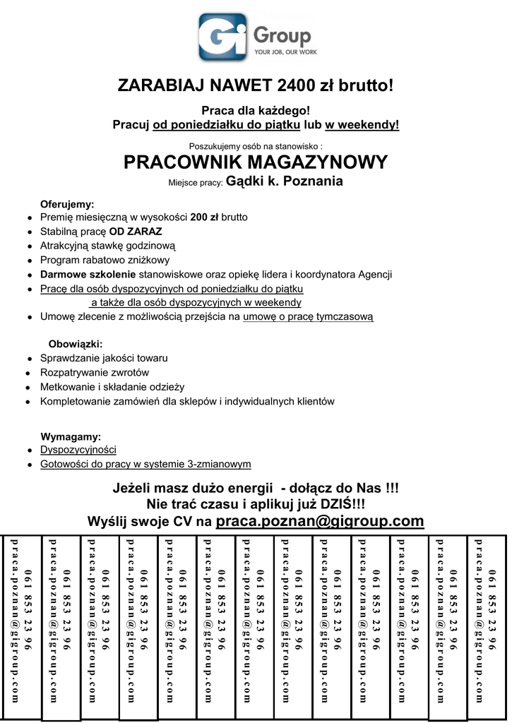 ZARABIAJ NAWET 2400 zł brutto! Praca dla każdego! Pracuj od poniedziałku do piątku lub w weekendy! Poszukujemy osób na stanowisko : PRACOWNIK MAGAZYNOWY Miejsce pracy: Gądki k. Poznania Oferujemy: Premię miesięczną w wysokości 200 zł brutto Stabilną pracę OD ZARAZ Atrakcyjną stawkę godzinową Program rabatowo zniżkowy Darmowe szkolenie stanowiskowe oraz opiekę lidera i koordynatora Agencji Pracę dla osób dyspozycyjnych od poniedziałku do piątku a także dla osób dyspozycyjnych w weekendy Umowę zlecenie z możliwością przejścia na umowę o pracę tymczasową Obowiązki: Sprawdzanie jakości towaru Rozpatrywanie zwrotów Metkowanie i składanie odzieży Kompletowanie zamówień dla sklepów i indywidualnych klientów Wymagamy: Dyspozycyjności Gotowości do pracy w systemie 3-zmianowym Jeżeli masz dużo energii - dołącz do Nas !!! Nie trać czasu i aplikuj już DZIŚ!!! Wyślij swoje CV na [email protected] 061 853 23 96 [email protected] 061 853 23 96 [email protected] 061 853 23 96 [email protected] 061 853 23 96 [email protected] 061 853 23 96 [email protected] 061 853 23 96 [email protected] 061 853 23 96 [email protected] 061 853 23 96 [email protected] 061 853 23 96 [email protected] 061 853 23 96 [email protected] 061 853 23 96 [email protected] 061 853 23 96 [email protected] 061 853 23 96 [email protected]