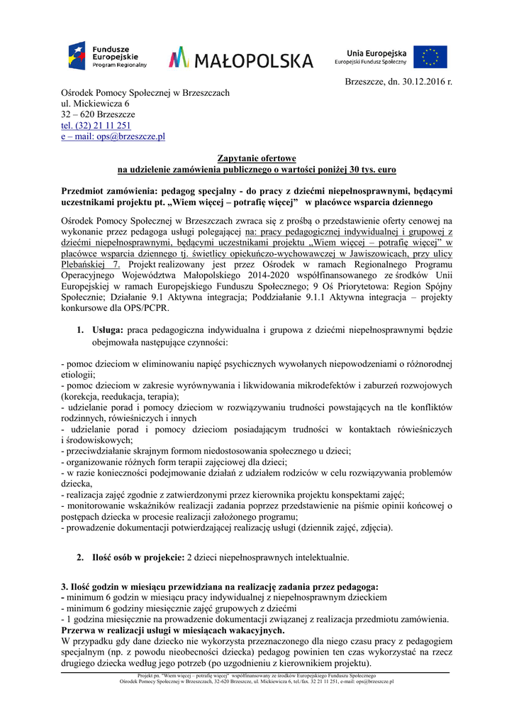 Brzeszcze, dn. 30.12.2016 r. Ośrodek Pomocy Społecznej w Brzeszczach ul. Mickiewicza 6 32 – 620 Brzeszcze tel. (32) 21 11 251 e – mail: [email protected] Zapytanie ofertowe na udzielenie zamówienia publicznego o wartości poniżej 30 tys. euro Przedmiot zamówienia: pedagog specjalny - do pracy z dziećmi niepełnosprawnymi, będącymi uczestnikami projektu pt. „Wiem więcej – potrafię więcej” w placówce wsparcia dziennego Ośrodek Pomocy Społecznej w Brzeszczach zwraca się z prośbą o przedstawienie oferty cenowej na wykonanie przez pedagoga usługi polegającej na: pracy pedagogicznej indywidualnej i grupowej z dziećmi niepełnosprawnymi, będącymi uczestnikami projektu „Wiem więcej – potrafię więcej” w placówce wsparcia dziennego tj. świetlicy opiekuńczo-wychowawczej w Jawiszowicach, przy ulicy Plebańskiej 7. Projekt realizowany jest przez Ośrodek w ramach Regionalnego Programu Operacyjnego Województwa Małopolskiego 2014-2020 współfinansowanego ze środków Unii Europejskiej w ramach Europejskiego Funduszu Społecznego; 9 Oś Priorytetowa: Region Spójny Społecznie; Działanie 9.1 Aktywna integracja; Poddziałanie 9.1.1 Aktywna integracja – projekty konkursowe dla OPS/PCPR. 1. Usługa: praca pedagogiczna indywidualna i grupowa z dziećmi niepełnosprawnymi będzie obejmowała następujące czynności: - pomoc dzieciom w eliminowaniu napięć psychicznych wywołanych niepowodzeniami o różnorodnej etiologii; - pomoc dzieciom w zakresie wyrównywania i likwidowania mikrodefektów i zaburzeń rozwojowych (korekcja, reedukacja, terapia); - udzielanie porad i pomocy dzieciom w rozwiązywaniu trudności powstających na tle konfliktów rodzinnych, rówieśniczych i innych - udzielanie porad i pomocy dzieciom posiadającym trudności w kontaktach rówieśniczych i środowiskowych; - przeciwdziałanie skrajnym formom niedostosowania społecznego u dzieci; - organizowanie różnych form terapii zajęciowej dla dzieci; - w razie konieczności podejmowanie działań z udziałem rodziców w celu rozwiązywania problemów dziecka, - realizacja zajęć zgodnie z zatwierdzonymi przez kierownika projektu konspektami zajęć; - monitorowanie wskaźników realizacji zadania poprzez przedstawienie na piśmie opinii końcowej o postępach dziecka w procesie realizacji założonego programu; - prowadzenie dokumentacji potwierdzającej realizację usługi (dziennik zajęć, zdjęcia). 2. Ilość osób w projekcie: 2 dzieci niepełnosprawnych intelektualnie. 3. Ilość godzin w miesiącu przewidziana na realizację zadania przez pedagoga: - minimum 6 godzin w miesiącu pracy indywidualnej z niepełnosprawnym dzieckiem - minimum 6 godziny miesięcznie zajęć grupowych z dziećmi - 1 godzina miesięcznie na prowadzenie dokumentacji związanej z realizacja przedmiotu zamówienia. Przerwa w realizacji usługi w miesiącach wakacyjnych. W przypadku gdy dane dziecko nie wykorzysta przeznaczonego dla niego czasu pracy z pedagogiem specjalnym (np. z powodu nieobecności dziecka) pedagog powinien ten czas wykorzystać na rzecz drugiego dziecka według jego potrzeb (po uzgodnieniu z kierownikiem projektu). Projekt pn. "Wiem więcej – potrafię więcej" współfinansowany ze środków Europejskiego Funduszu Społecznego Ośrodek Pomocy Społecznej w Brzeszczach, 32-620 Brzeszcze, ul. Mickiewicza 6, tel./fax. 32 21 11 251, e-mail: [email protected] 4. Miejsce wykonywania usługi: placówka wsparcia dziennego: Świetlica opiekuńczowychowawcza w Jawiszowicach przy ulicy Plebańskiej 7, w godzinach funkcjonowania Świetlicy (15:00 – 19:00). Przewiduje się możliwość zmiany godzin funkcjonowania świetlicy w okresie ferii zimowych. 5. Termin realizacji zamówienia: od podpisania umowy do 15.12.2017r. 6. Forma umowy: cywilno – prawna 7. Wymagania: - kwalifikacje: wykształcenie wyższe magisterskie na kierunku pedagogika specjalna (wykształcenie weryfikowane na podstawie oświadczenia stanowiącego załącznik nr 1 do oferty oraz na podstawie kopii dokumentu potwierdzającego wykształcenie), - preferowane doświadczenie w realizacji przedsięwzięć zgodnych z przedmiotem zamówienia, - wykonawca lub osoba przez niego wskazana będzie zapewniała ciągłość realizacji usługi oraz nie będzie podlegała wymianie na inną osobę w trakcie realizacji zamówienia, z wyjątkiem sytuacji losowych po zaakceptowaniu przez Zamawiającego; - przedstawienie konspektu proponowanych zajęć. Zamawiający zastrzega sobie prawo do kontroli bieżącej w zakresie: - przebiegu i sposobu prowadzenia usług - sporządzania dokumentacji - uczestnictwa osób w zajęciach 8. Oferta ma zawierać: - podpisane oświadczenie znajdujące się w załączniku nr 1 do niniejszego zapytania ofertowego, - czytelnie wypełniony formularz ofertowy stanowiący załącznik nr 2 do niniejszego zapytania ofertowego, - podpisane oświadczenie o aktualnym zatrudnieniu, w tym również w innych projektach, stanowiące załącznik nr 3 do niniejszego zapytania ofertowego, - podpisane oświadczenie o braku powiązań osobowych i kapitałowych z beneficjentem lub osobami upoważnionymi do zaciągania zobowiązań w imieniu beneficjenta stanowiące załącznik nr 4 do niniejszego zapytania ofertowego; - kserokopię dokumentu potwierdzającego wykształcenie oraz posiadane uprawnienia, jeżeli przepisy prawa nakładają obowiązek ich posiadania, - cenę netto + obowiązującą stawkę VAT i cenę brutto za 1 godzinę zegarową, za którą wykonawca zrealizuje zamówienie, - konspekt proponowanych zajęć. Proponowana cena musi uwzględniać wszystkie zobowiązania, obejmować wszystkie koszty i składniki związane z realizacją zamówienia. 9. Kryteria oceny ofert: 9.1 Oferty oceniane będą według poniższych kryteriów: a) cena brutto za 1 godzinę zegarową usługi – waga kryterium – 90 % , b) doświadczenie w przedmiocie zamówienia – waga kryterium 10% 9.2 Sposób obliczania ceny oferty zamawiając