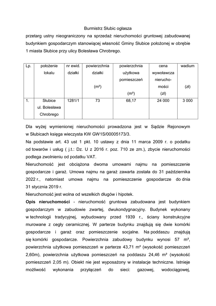 Burmistrz Słubic ogłasza przetarg ustny nieograniczony na sprzedaż nieruchomości gruntowej zabudowanej budynkiem gospodarczym stanowiącej własność Gminy Słubice położonej w obrębie 1 miasta Słubice przy ulicy Bolesława Chrobrego. Lp. położenie nr ewid. powierzchnia powierzchnia cena lokalu działki działki użytkowa wywoławcza pomieszczeń nierucho- (m²) Słubice 1. 1281/1 mości 73 (m²) (zł) 68,17 24 000 wadium (zł) 3 000 ul. Bolesława Chrobrego Dla wyżej wymienionej nieruchomości prowadzona jest w Sądzie Rejonowym w Słubicach księga wieczysta KW GW1S/00005173/3. Na podstawie art. 43 ust 1 pkt. 10 ustawy z dnia 11 marca 2009 r. o podatku od towarów i usług ( j.t.: Dz. U z 2016 r. poz. 710 ze zm.), zbycie nieruchomości podlega zwolnieniu od podatku VAT. Nieruchomość jest obciążona dwoma umowami najmu na pomieszczenie gospodarcze i garaż. Umowa najmu na garaż zawarta została do 31 października 2022 r., natomiast umowa najmu na pomieszczenie gospodarcze do dnia 31 stycznia 2019 r. Nieruchomość jest wolna od wszelkich długów i hipotek. Opis nieruchomości - nieruchomość gruntowa zabudowana jest budynkiem gospodarczym w zabudowie zwartej, dwukondygnacyjny. Budynek wykonany w technologii tradycyjnej, wybudowany przed 1939 r., ściany konstrukcyjne murowane z cegły ceramicznej. W parterze budynku znajdują się dwie komórki gospodarcze i garaż oraz pomieszczenie socjalne. Na poddaszu znajdują się komórki gospodarcze. Powierzchnia zabudowy budynku wynosi 57 m², powierzchnia użytkowa pomieszczeń w parterze 43,71 m² (wysokość pomieszczeń 2,60m), powierzchnia użytkowa pomieszczeń na poddaszu 24,46 m² (wysokość pomieszczeń 2,05 m). Obiekt nie jest wyposażony w instalacje techniczne. Istnieje możliwość wykonania przyłączeń do sieci: gazowej, wodociągowej, elektroenergetycznej, kanalizacyjnej. Budynek charakteryzuje się złym stanem technicznym. Dojście do budynku z ul. Bolesława Chrobrego. Zbycie nieruchomości odbywa się w stanie istniejącego uzbrojenia terenu zgodnie z ewidencją gruntów i budynków prowadzoną przez Starostwo Powiatowe w Słubicach. Powyższe nie wyklucza istnienia w terenie innych nie wskazanych na mapie urządzeń podziemnych nie zgłoszonych do ewidencji. Nabywca winien dokonać identyfikacji sieci we własnym zakresie, zaś ewentualne ograniczenia, utrudnienia lub koszty mogące wyniknąć dla nabywcy z istnienia tych sieci obciążają ryzyko nabywcy i nie stanowią wady nieruchomości. W przypadku ewentualnych kolizji projektowych nabywca przeniesie istniejącą infrastrukturę na własny koszt na warunkach właścicieli sieci i po dokonaniu niezbędnych uzgodnień oraz uzyskaniu przewidzianych prawem pozwoleń. Nabywca jest zobowiązany do zapewnienia swobodnego dostępu do działki każdoczesnemu właścicielowi urządzeń celem usuwania awarii dokonywania niezbędnych konserwacji infrastruktury technicznej, eksploatacji, modernizacji i napraw oraz wymiany sieci. Niezależnie od podanych powyżej informacji, nabywca odpowiada za samodzielne zapoznanie się ze stanem prawnym i faktycznym nieruchomości oraz jej aktualnym sposobem zagospodarowania, jej parametrami oraz możliwością zagospodarowania. Rozpoznanie wszelkich warunków faktycznych i prawnych niezbędnych do realizacji planowanej inwestycji, leży w całości po stronie nabywcy i stanowi obszar jego ryzyka. Przeznaczenie nieruchomości- zgodnie ze studium uwarunkowań i kierunków zagospodarowania przestrzennego Gminy Słubice, uchwalone Uchwałą Rady Miejskiej w Słubicach Nr XI/84/2011 z dnia 30 czerwca 2011 r., zmienione Uchwałą Rady Miejskiej w Słubicach Nr LIV/430/2014 z dnia 12 czerwca 2014 r. nieruchomość gruntowa oznaczona numerem ewidencyjnym 1281/1, znajduje się w obszarze oznaczonym symbolem MN - tereny zabudowy mieszkaniowej jednorodzinnej, w ramach której dopuszcza się lokalizację: zabudowy mieszkaniowej jednorodzinnej; zabudowy zagrodowej poza granicami miasta Słubice; zabudowy usługowej (handel, bankowość, gastronomia, usługi zdrowia, usługi kultury i oświaty, usługi sportu i rekreacji); obiektów infrastruktury technicznej, komunikacji oraz zieleni uporządkowanej; obiektów innych usług wyłącznie po sporządzeniu miejscowego planu zagospodarowania przestrzennego. Przetarg odbędzie się 29 listopada 2016 r. o godzinie 1100 w sali konferencyjnej (II piętro) Urzędu Miejskiego w Słubicach przy ul. Akademickiej nr 1. Warunkiem przystąpienia do przetargu jest wpłata wadium w pieniądzu, które należy wpłacić na konto urzędu Miejskiego w Słubicach prowadzone przez w banku Bank Spółdzielczy w Rzepinie, Oddział Słubice nr 37 8371 0009 0009 5514 2000 0060 w takim terminie, aby najpóźniej w dniu 17 listopada 2016 r. wymagana kwota znajdowała się na koncie Urzędu Miejskiego w Słubicach. Minimalne postąpienie wynosi 1 % ceny wywoławczej. Osoby przystępujące do przetargu muszą przedłożyć komisji przetargowej w dniu przetargu do godz. 1045 dowód tożsamości, a firmy lub spółki dodatkowo wypis z odpowiedniego rejestru lub ewidencji działalności gospodarczej wraz z ważnymi pełnomocnictwami z poświadczonym urzędowo podpisem. Spółki prawa handlowego winny przedłożyć dodatkowo uchwałę wspólników na odpłatne nabycie nieruchomości, natomiast wspólnicy spółek cywilnych umowę spółki lub uchwałę pozwalającą na odpłatne nabycie nieruchomości bądź stosowne umocowanie do działania w imieniu spółki (pozwalające na odpłatne nabycie nieruchomości) oraz zgodę współmałżonka na udział spółki cywilnej w przetargu na odpłatne nabycie nieruchomości, przy czym poświadczony. Małżonkowie podpis współmałżonka posiadający winien wspólność być ustawową urzędowo majątkową małżeńską muszą wziąć udział w przetargu osobiście lub za okazaniem pełnomocnictwa współmałżonka zawierające zgodę na udział w przetargu na odpłatne nabycie ni