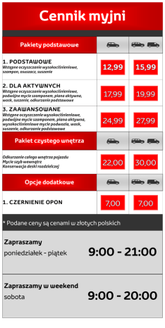 Cennik myjni Pakiety podstawowe 1 . PODSTAWOWE Wstępne oczyszczanie wysokociśnieniowe, szampon, osuszacz, suszenie 2. DLA AKTYWNYCH Wstępne oczyszczanie wysokociśnieniowe, podwójne mycie szamponem, piana aktywna, wosk, suszenie, odkurzanie podstawowe 3. ZAAWANSOWANE Wstępne oczyszczenie wysokociśnieniowe, podwójne mycie szamponem, piana aktywna, wysokociśnieniowe mycie podwozia, wosk, suszenie, odkurzanie podstawowe Pakiet czystego wnętrza Odkurzanie całego wnętrza pojazdu Mycie szyb wewnątrz Konserwacja deski rozdzielczej Opcje dodatkowe 1 . CZERNIENIE OPON * Podane ceny są cenami w złotych polskich Zapraszamy poniedziałek - piątek Zapraszamy w weekend sobota 9:00 - 21:00 9:00 - 20:00